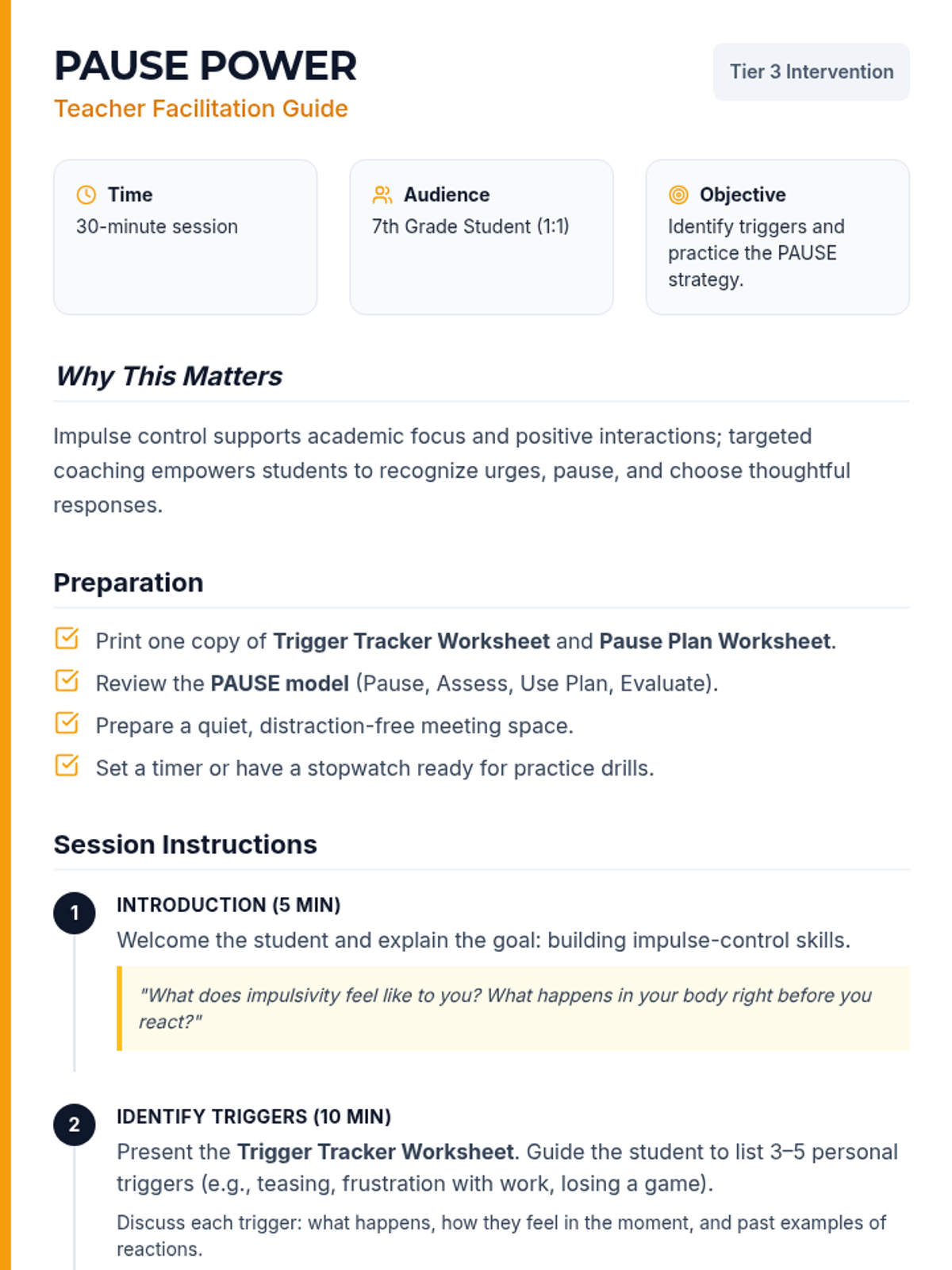 A Tier 3 intervention sequence for 7th-grade students to master impulse control using the Stop-Think-Go method, featuring two targeted 30-minute one-on-one sessions.