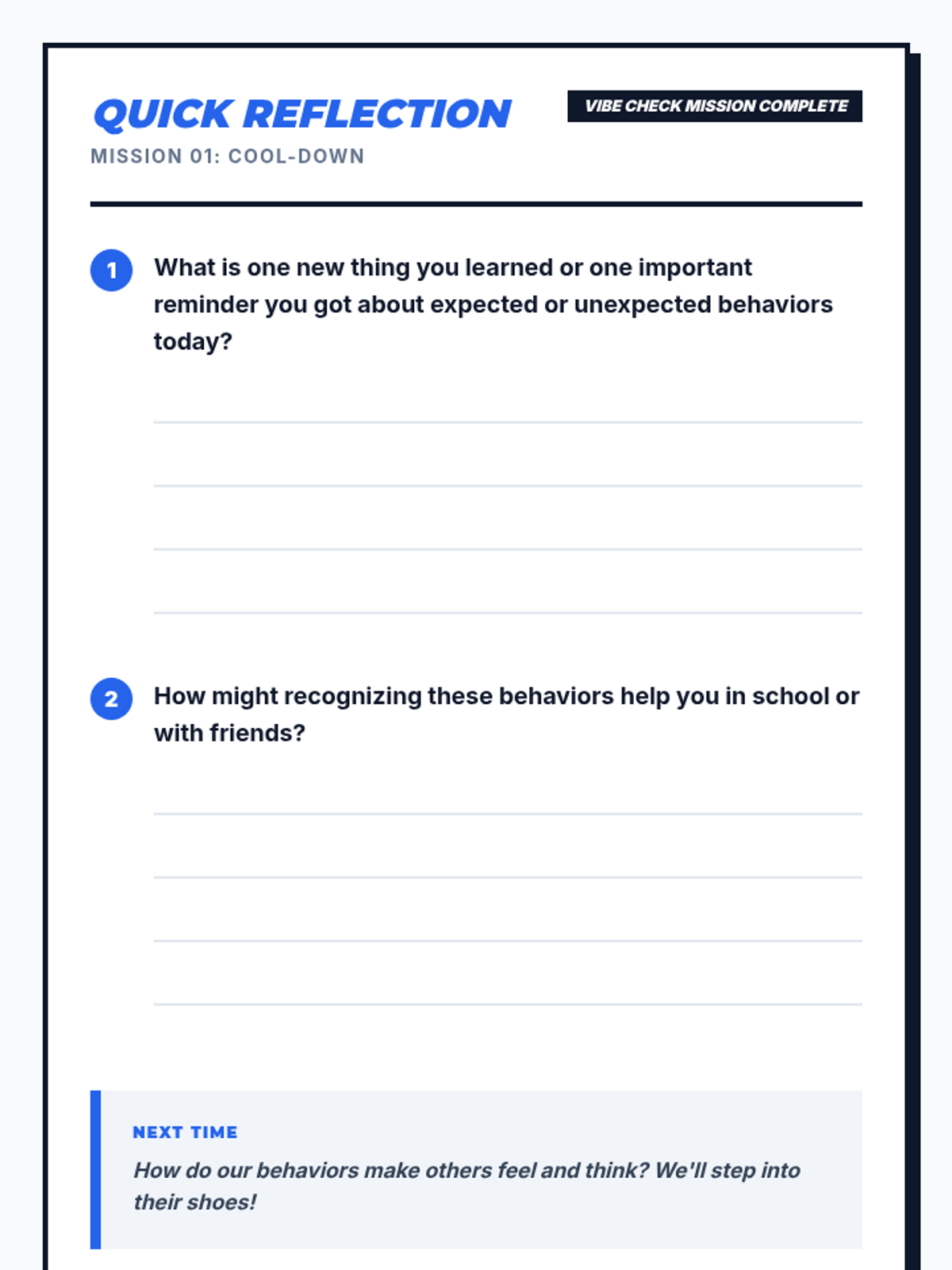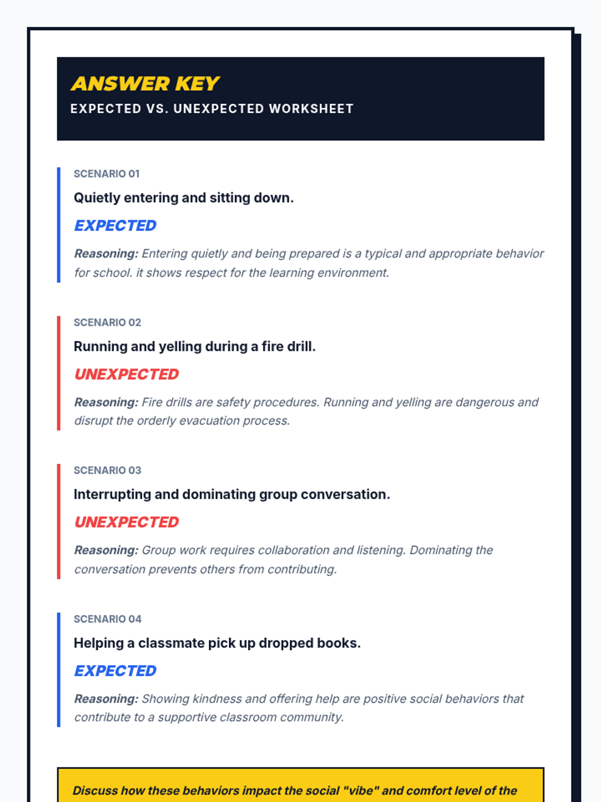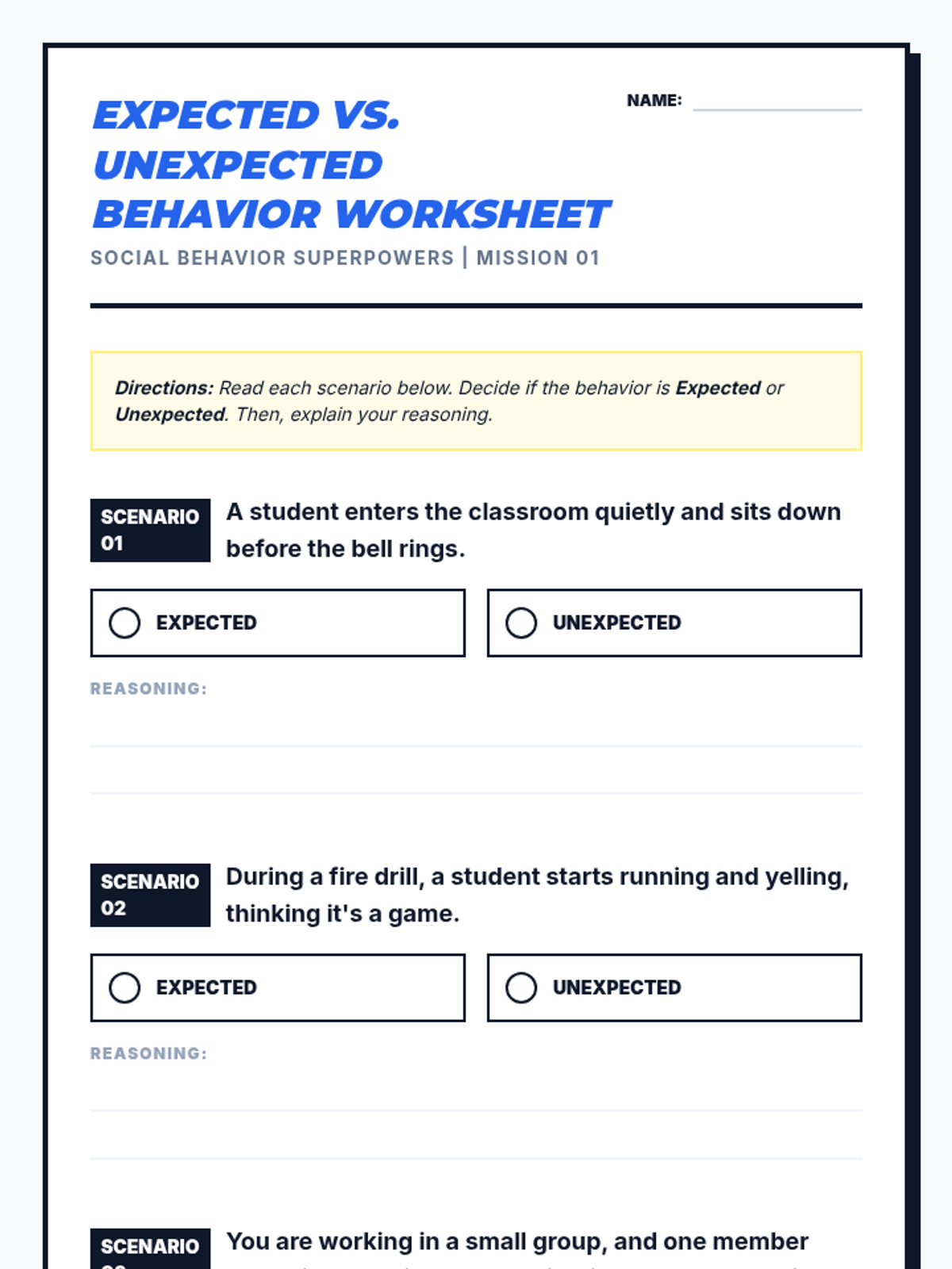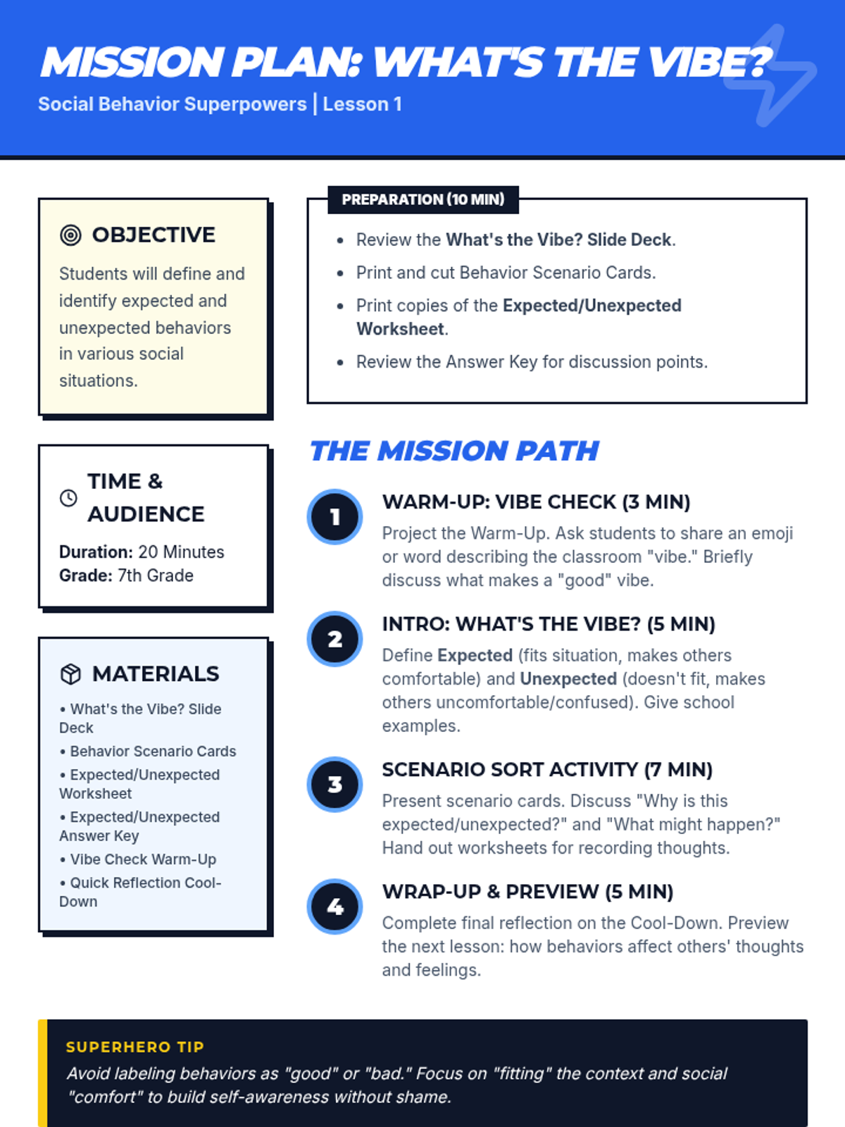 A four-part unit for 7th-grade students designed to develop social awareness and self-regulation. Students learn to identify expected and unexpected behaviors, practice perspective-taking through empathy mapping, and develop replacement strategies for more positive social outcomes.