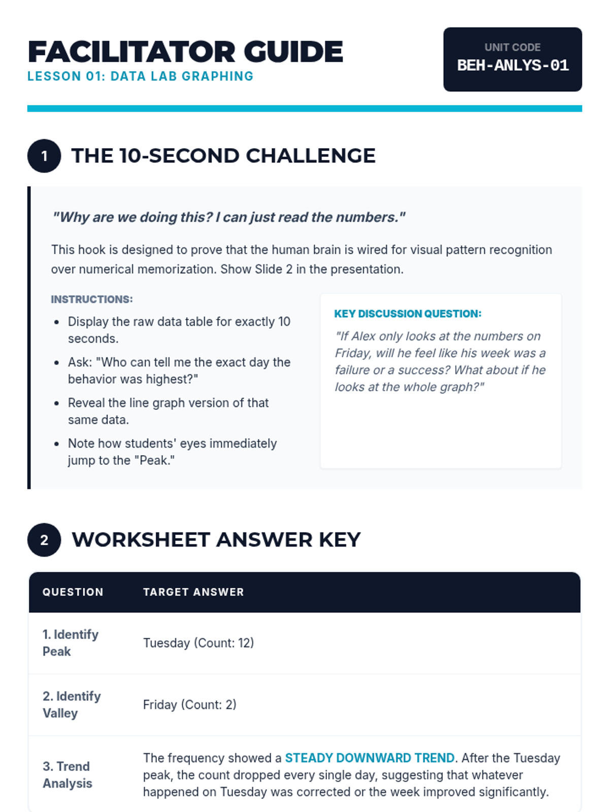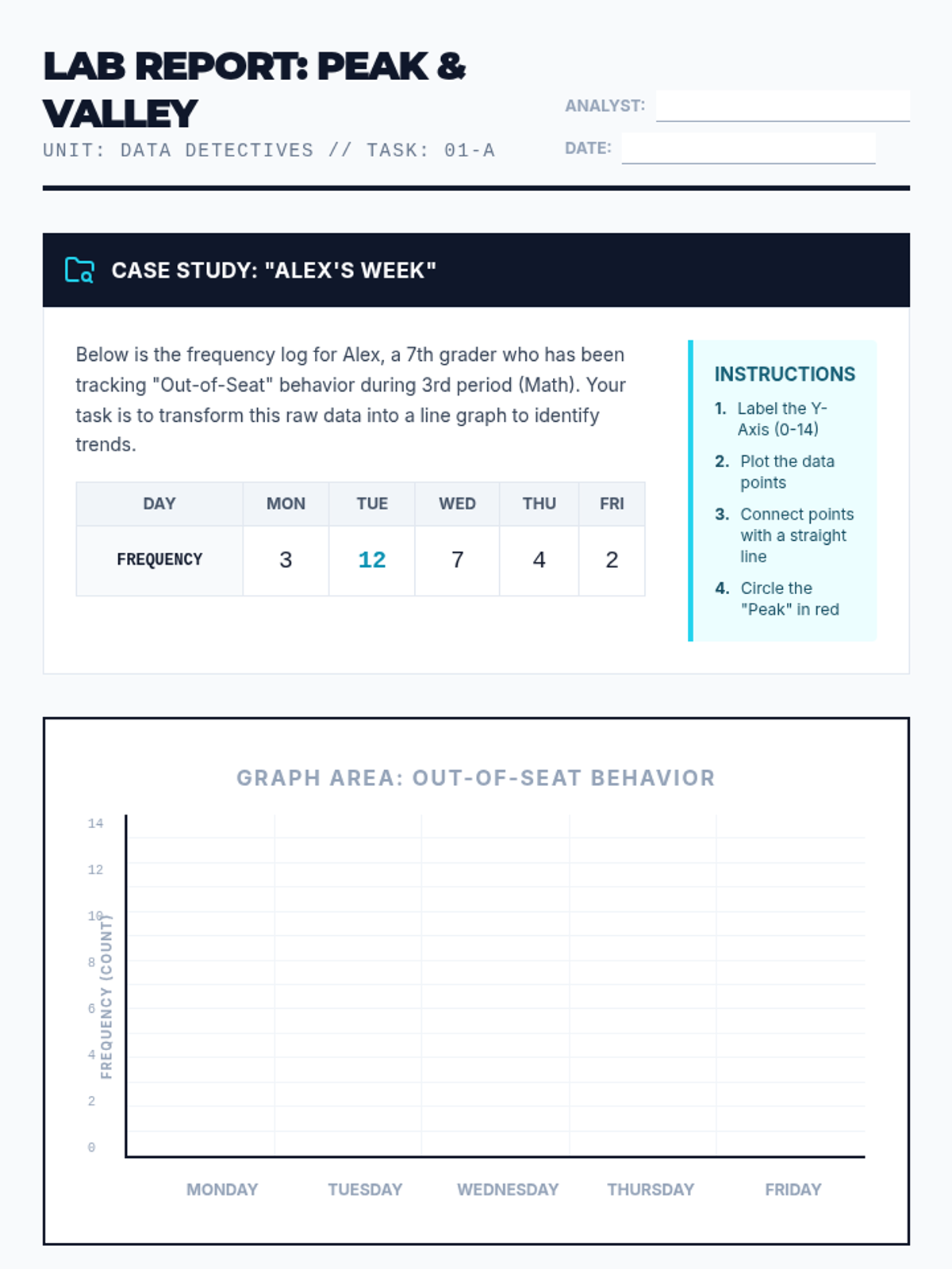 A comprehensive unit where 7th-grade students act as data analysts to interpret behavior charts, identifying patterns, triggers, and environmental correlations to better understand behavioral data.