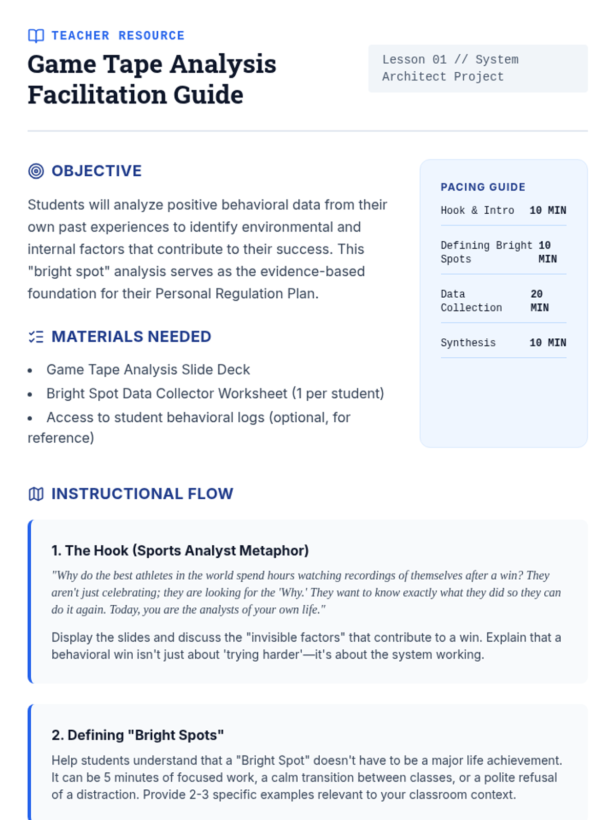 A project-based sequence where 7th-grade students act as 'system engineers' to design their own Personal Regulation Plan. Students analyze past successes, build prevention strategies, and create intervention protocols to ensure their behavioral and academic success.