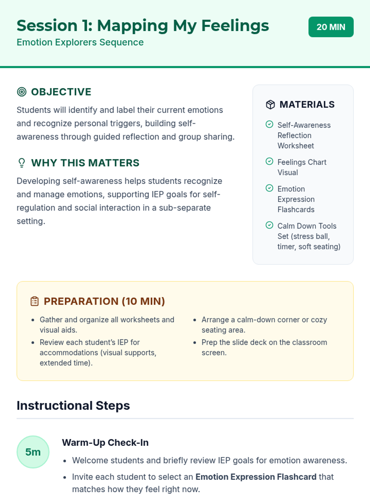 A 4-session series for 7th-grade sub-separate students to develop self-awareness, coping strategies, and assertive communication through an engaging 'Explorer' theme. Each session focuses on practical skills to meet IEP goals for self-regulation and social-emotional growth.