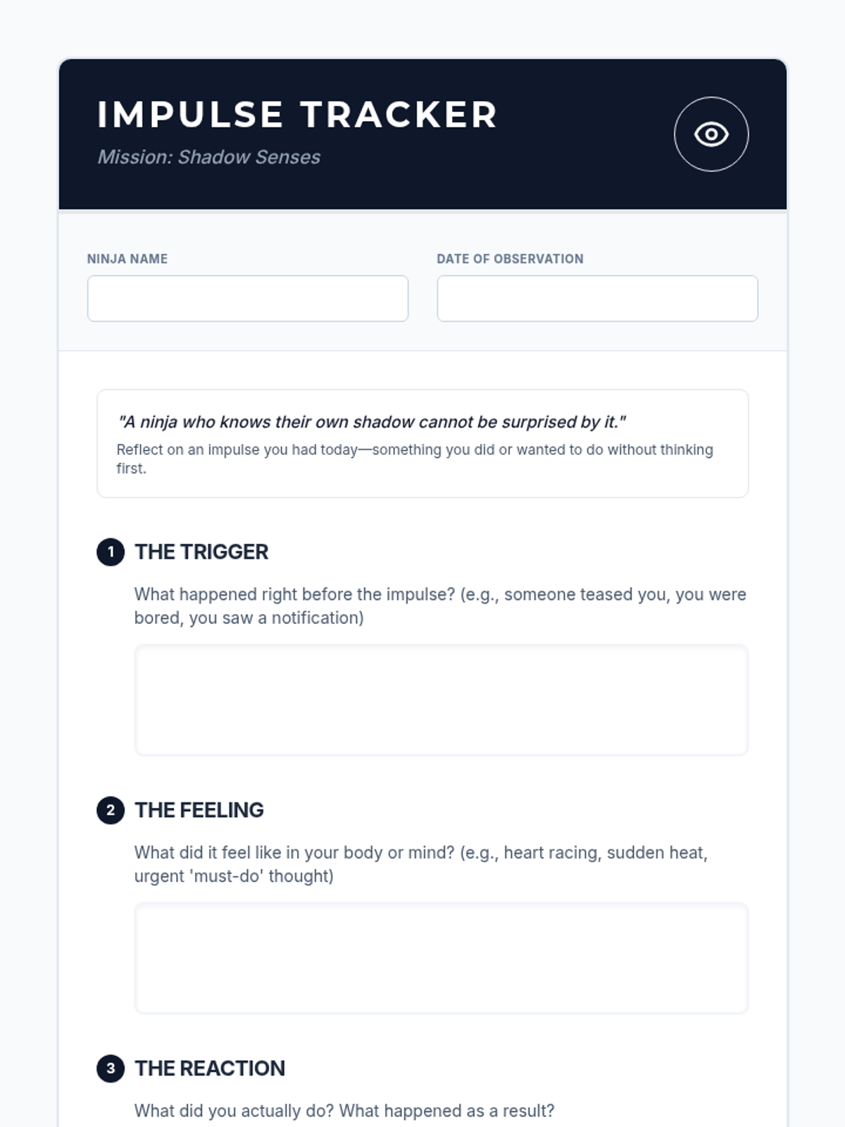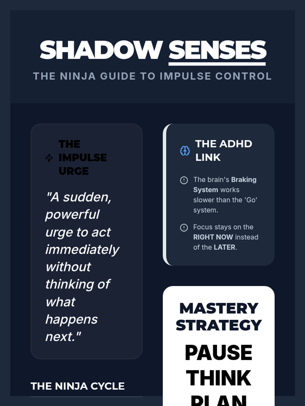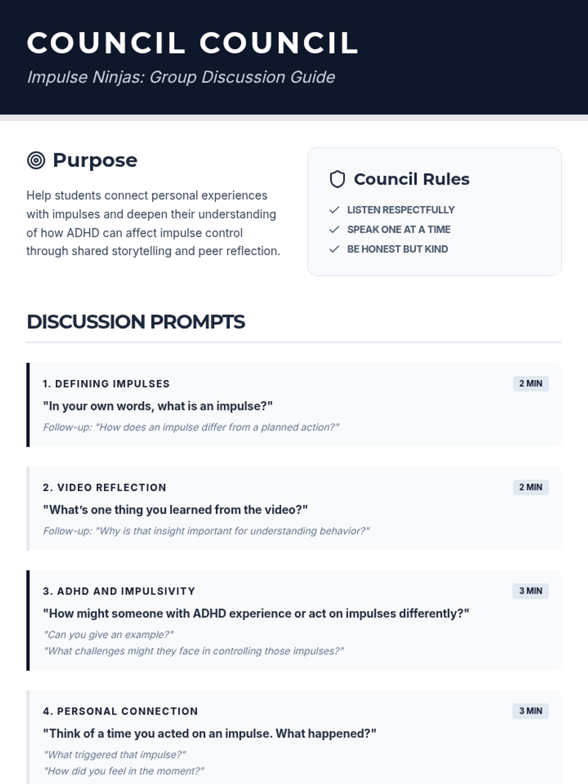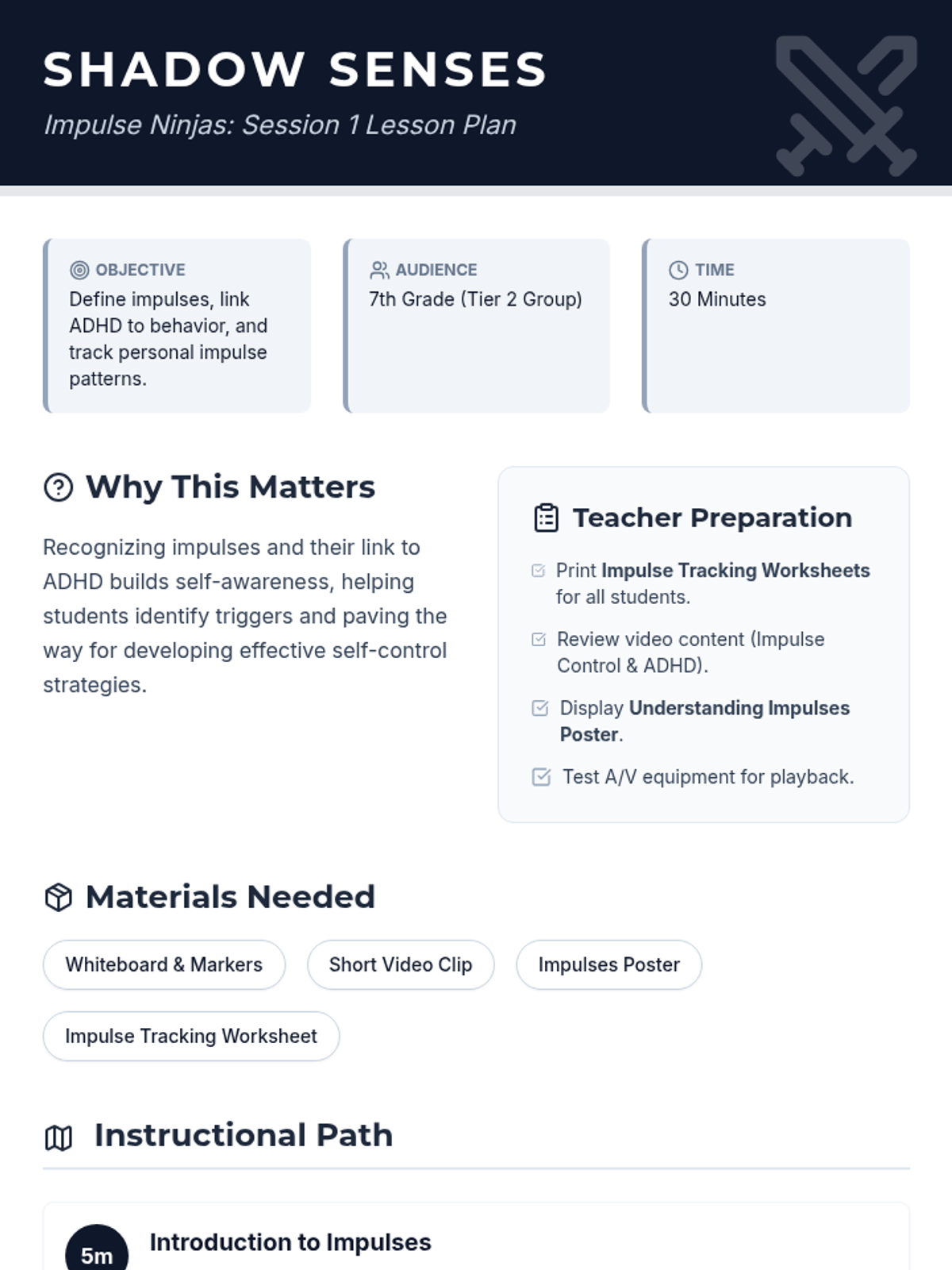 A two-session Tier 2 group intervention for 7th graders to understand ADHD-related impulsivity and master self-control strategies through a 'Ninja' thematic lens. Students move from awareness of their 'inner impulses' to practicing 'stealth strategies' using an interactive UNO-based game.