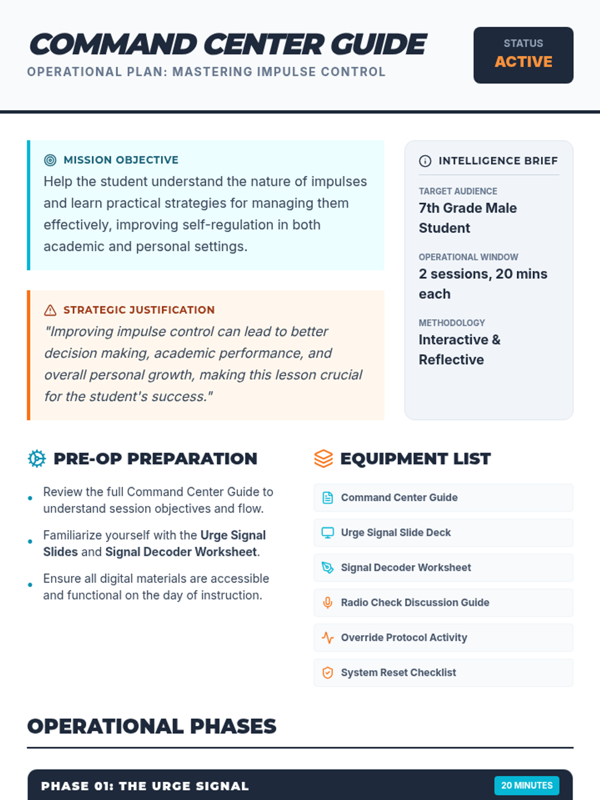 A two-session sequence designed for 7th-grade students to understand the nature of impulses and develop practical self-regulation strategies. The lessons focus on recognizing triggers and applying 'system override' techniques to manage behavior effectively.