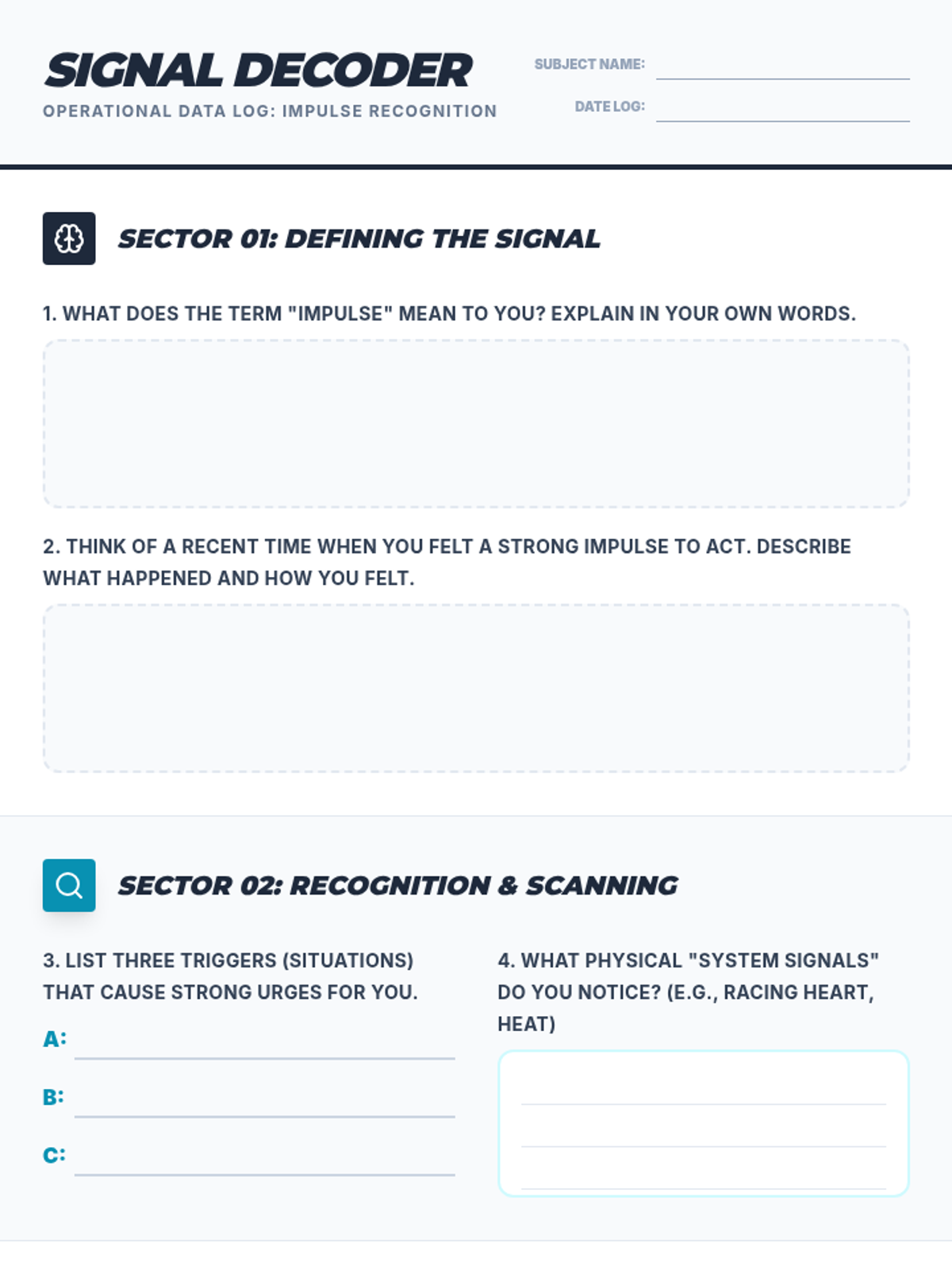 A therapeutic sequence designed for middle school boys to develop self-awareness and emotional regulation through a 'Tech/Gaming' metaphor. Students learn to scan their 'Internal Radar' for body signals and use a 'Pause and Plan' strategy to manage activation.