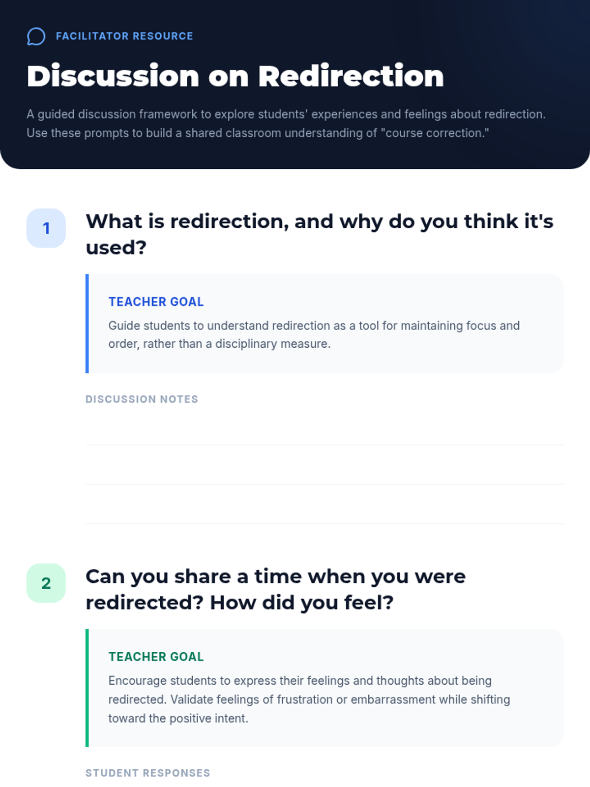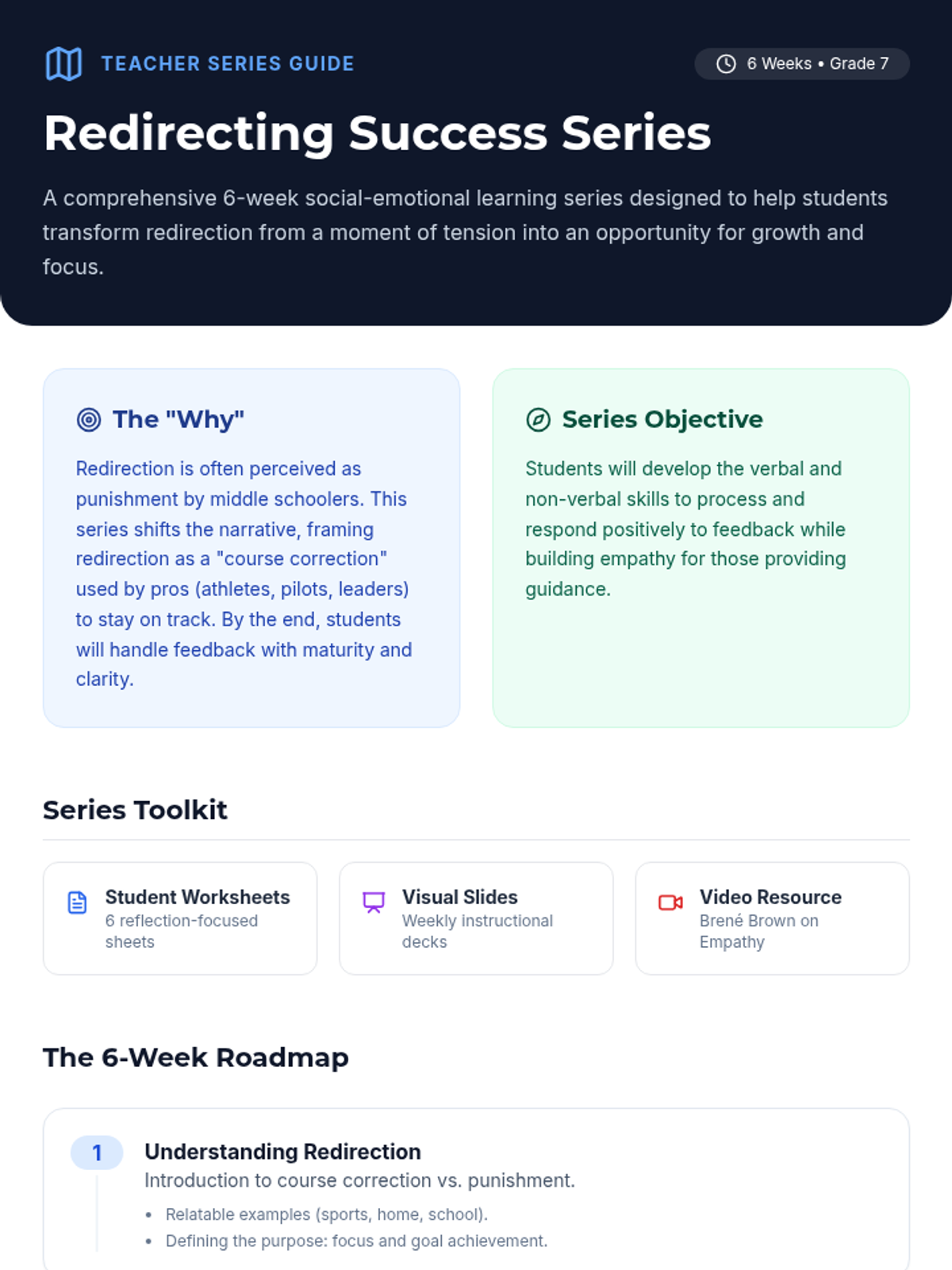 A six-week series designed for Grade 7 students to develop the social-emotional skills needed to handle redirection constructively, fostering a positive and focused learning environment.
