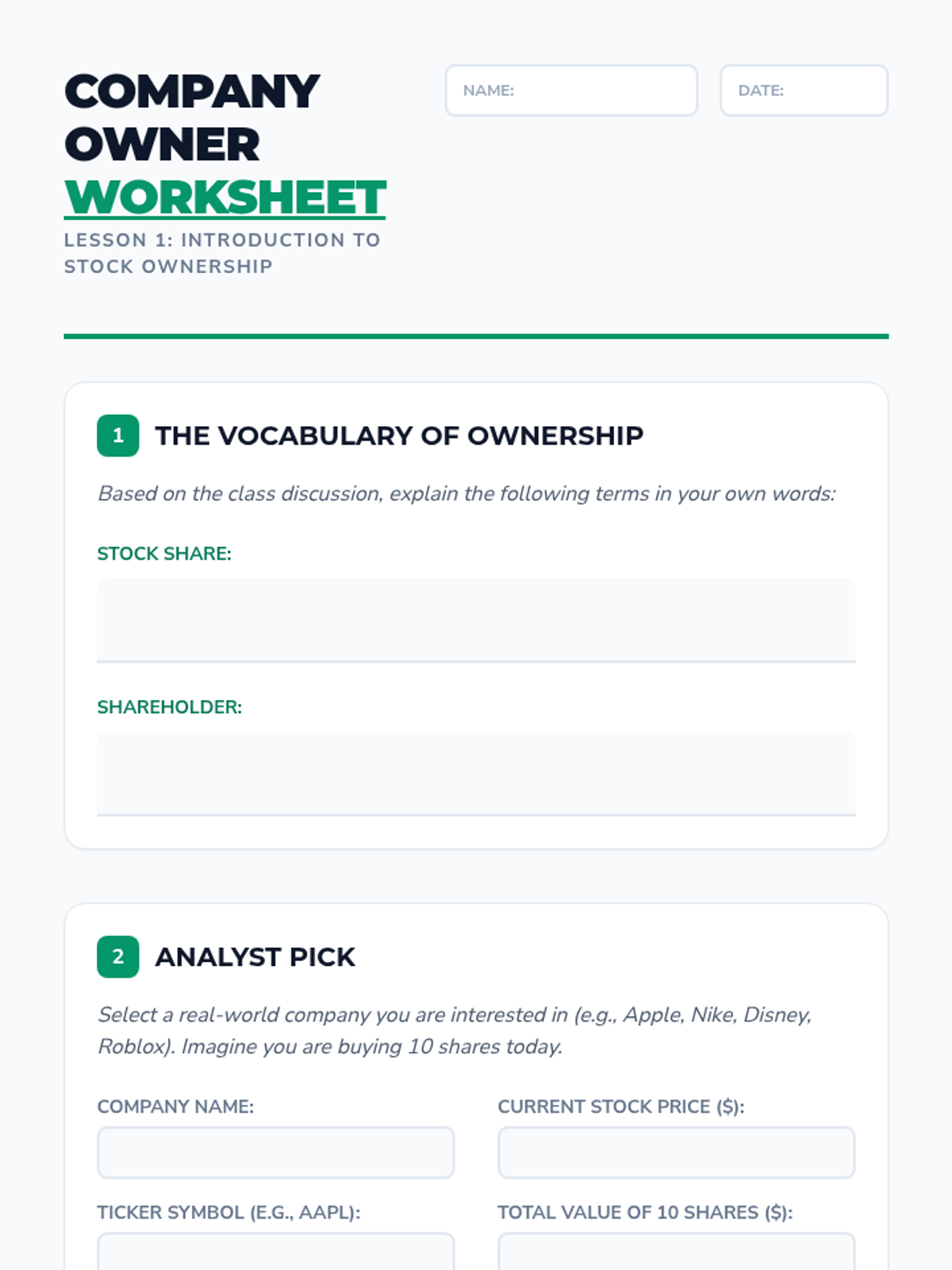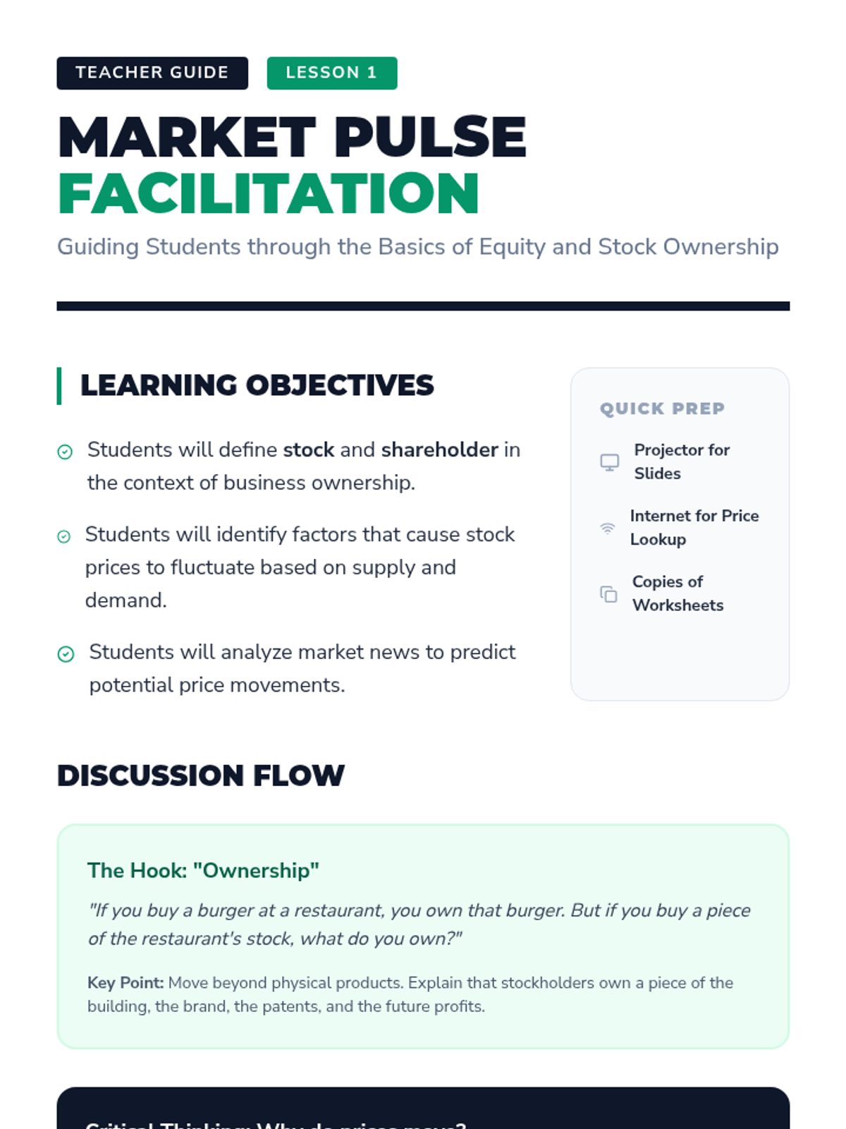 A comprehensive introduction to the world of investing, teaching 6th graders to differentiate between stocks, bonds, and mutual funds through hands-on simulations and visual analogies. Students explore the mechanics of ownership, lending, and risk management to build a foundation for lifelong financial literacy.
