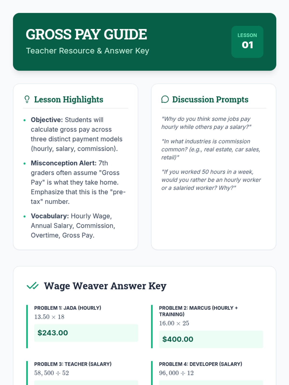 A comprehensive 5-lesson unit for 7th graders on understanding paycheck deductions, taxes, and the difference between gross and net income. Students progress from basic definitions to auditing pay stubs and budgeting with real take-home pay.