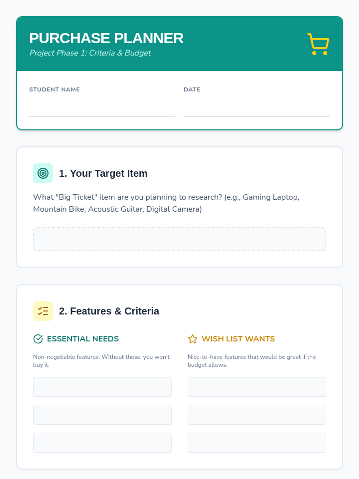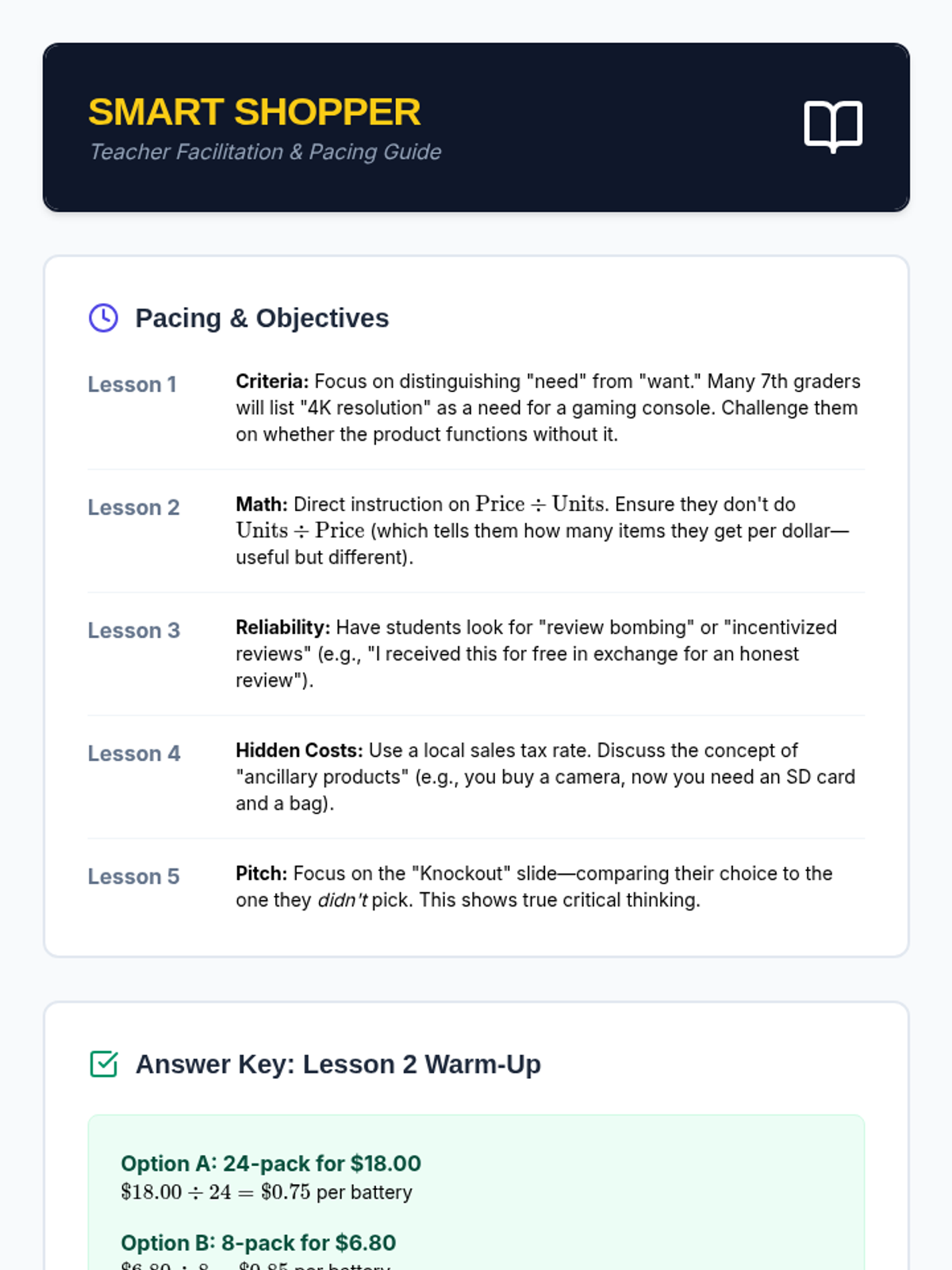 A 5-lesson project-based sequence for 7th graders focusing on comparison shopping, unit pricing, review analysis, and total cost calculation. Students learn to determine true value through a simulated 'big ticket' purchase project.
