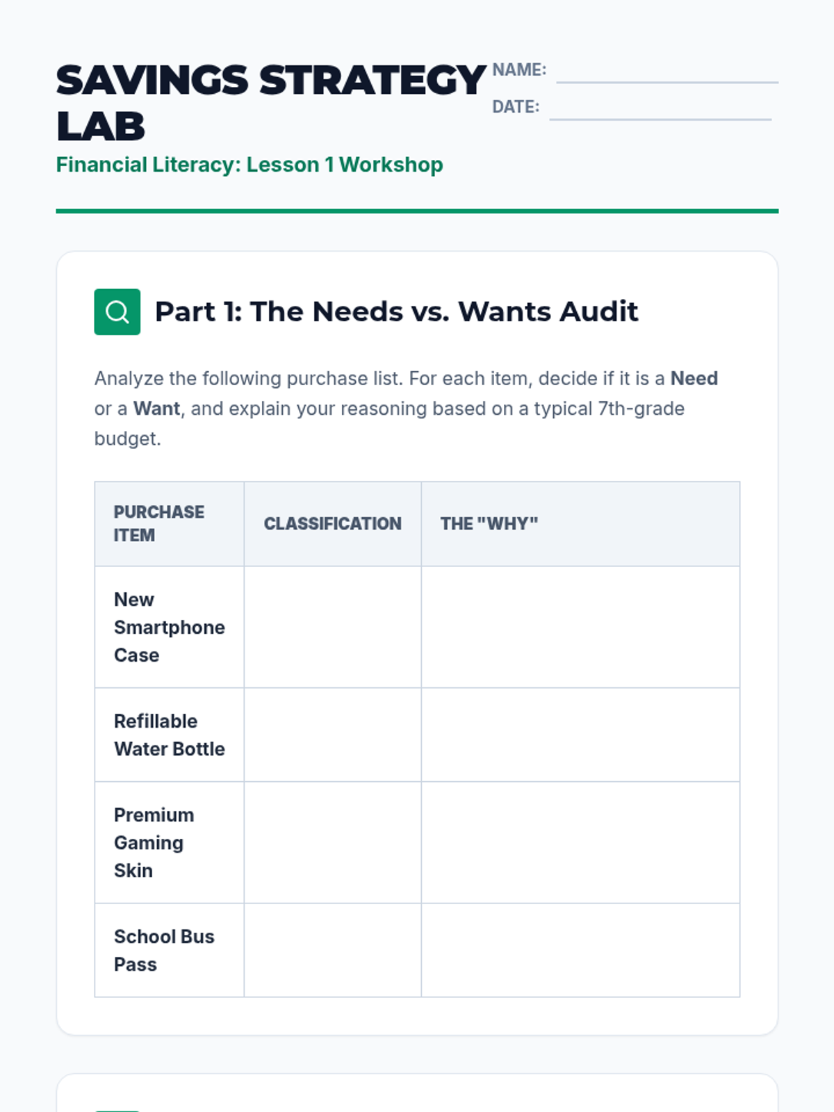 This sequence explores the psychology behind spending, focusing on impulse control, emotional triggers, and the economic concept of opportunity cost. Students move from basic needs/wants categorization to developing a personalized mindful spending plan.