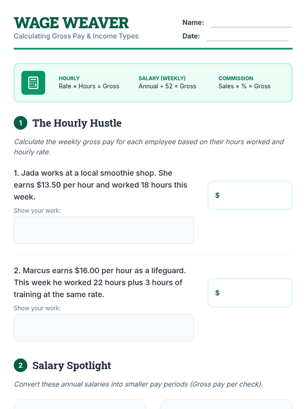 An analytical exploration of employment income for 7th graders. Students move from basic gross pay calculations to understanding complex deductions, taxes, and employee benefits, culminating in a job offer comparison project.