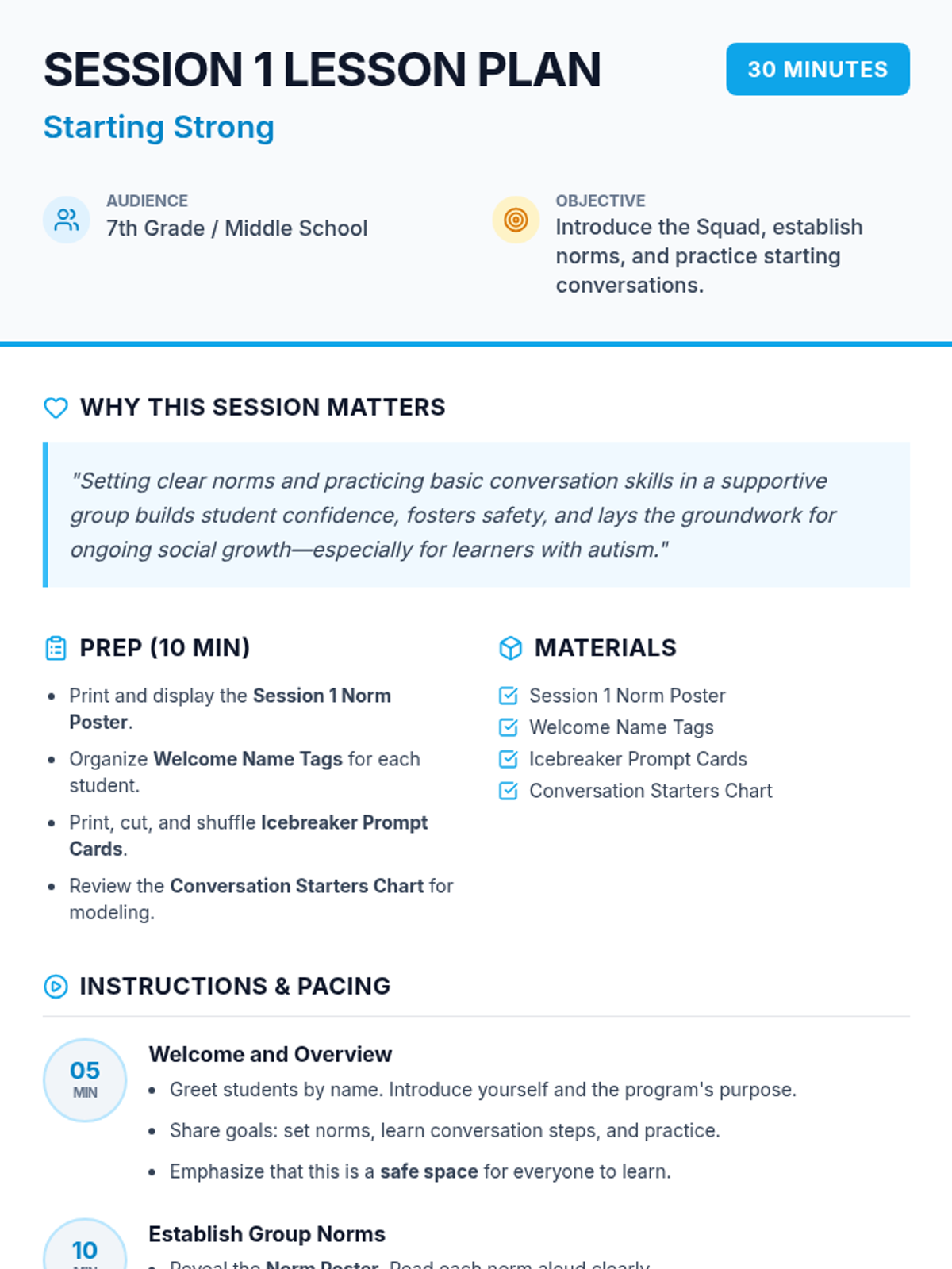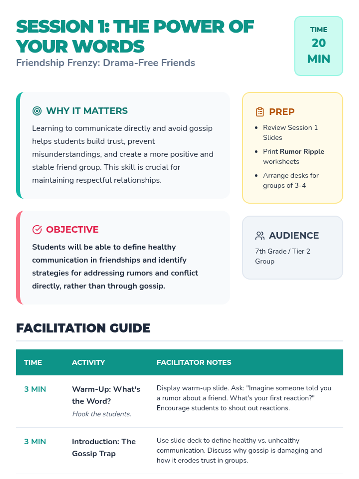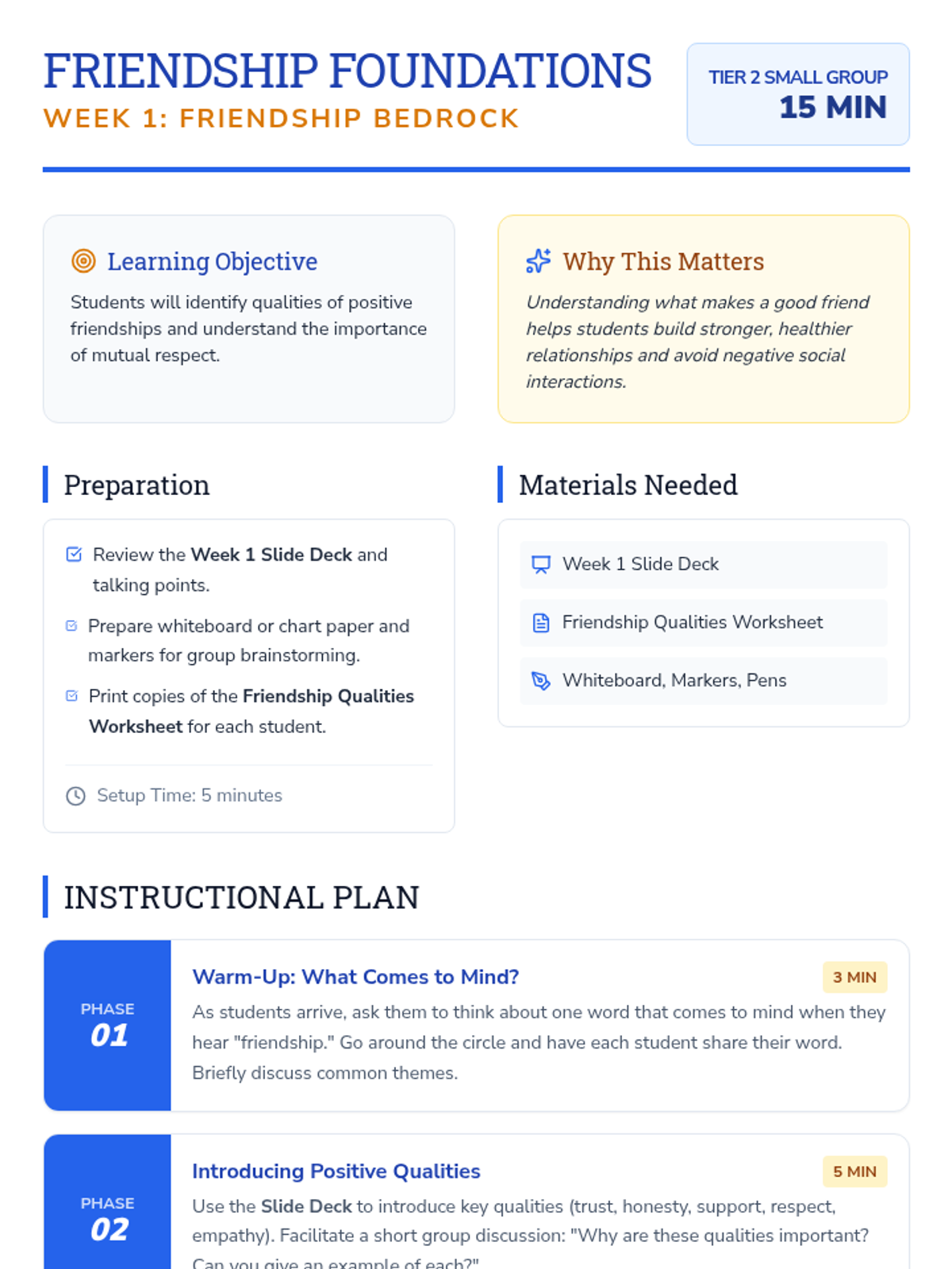 A 6-week Tier 2 small group program for 7th-grade students focused on building essential friendship skills like communication, empathy, and conflict resolution. Each 15-minute session provides structured instruction and hands-on practice to foster positive social development.