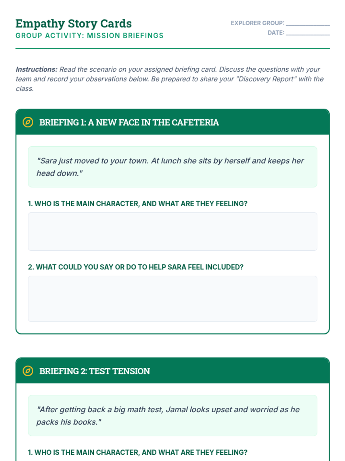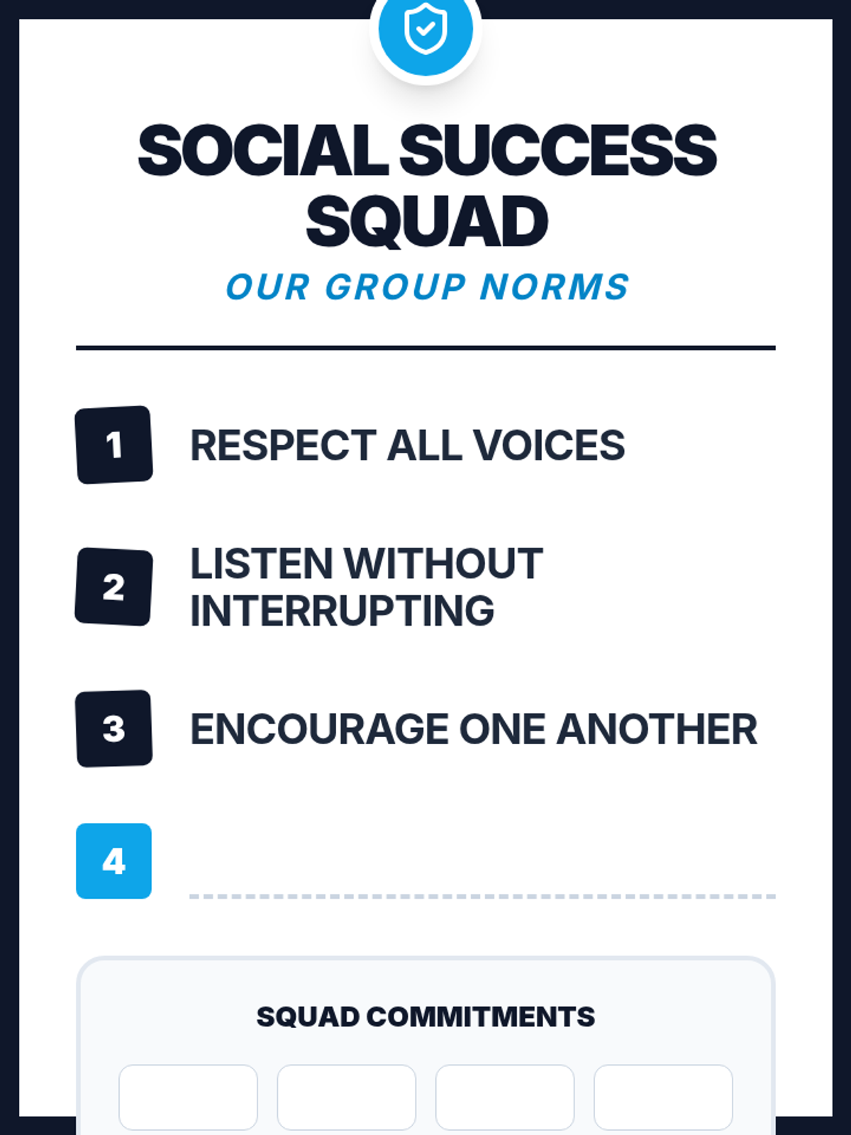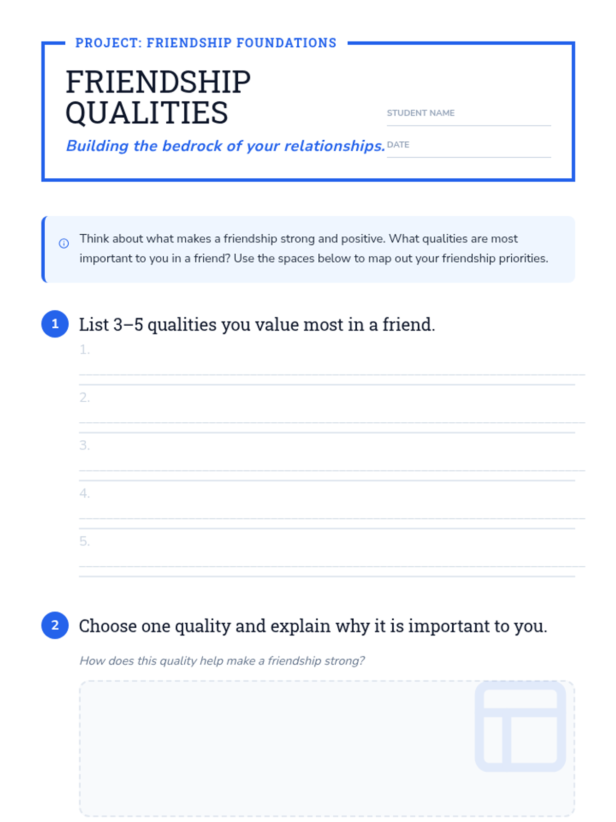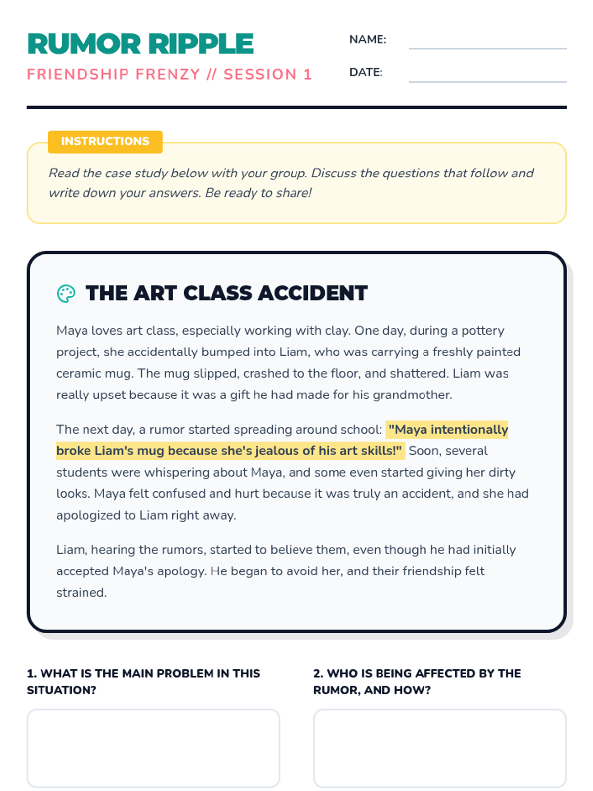 A 6-week Tier 2 small group program for 7th-grade students focused on building essential friendship skills like communication, empathy, and conflict resolution. Each 15-minute session provides structured instruction and hands-on practice to foster positive social development.