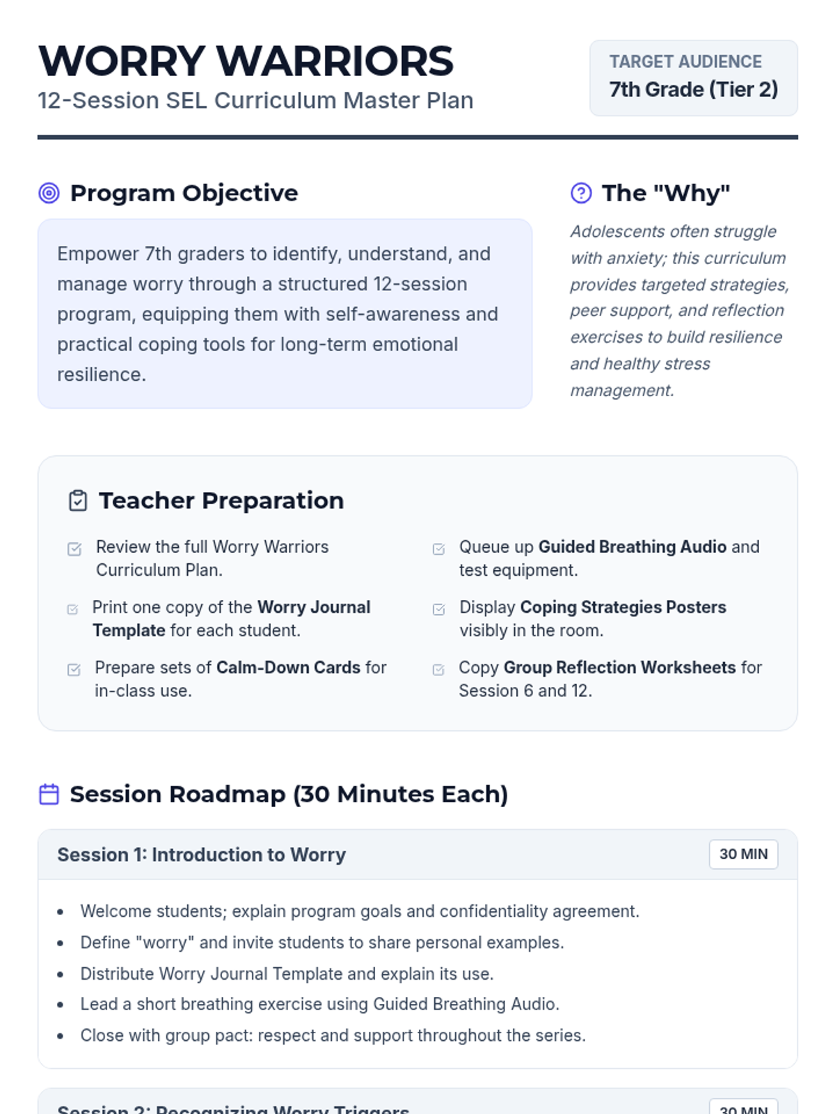 A 12-session small-group SEL curriculum designed for 7th graders to identify, understand, and manage worry through peer support and resilience-building strategies.