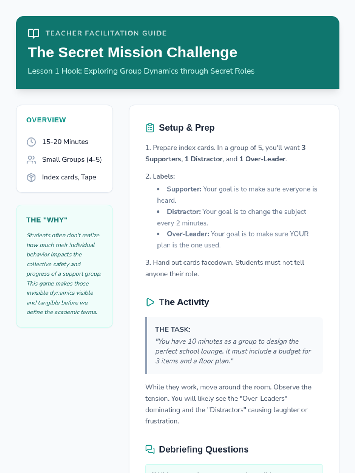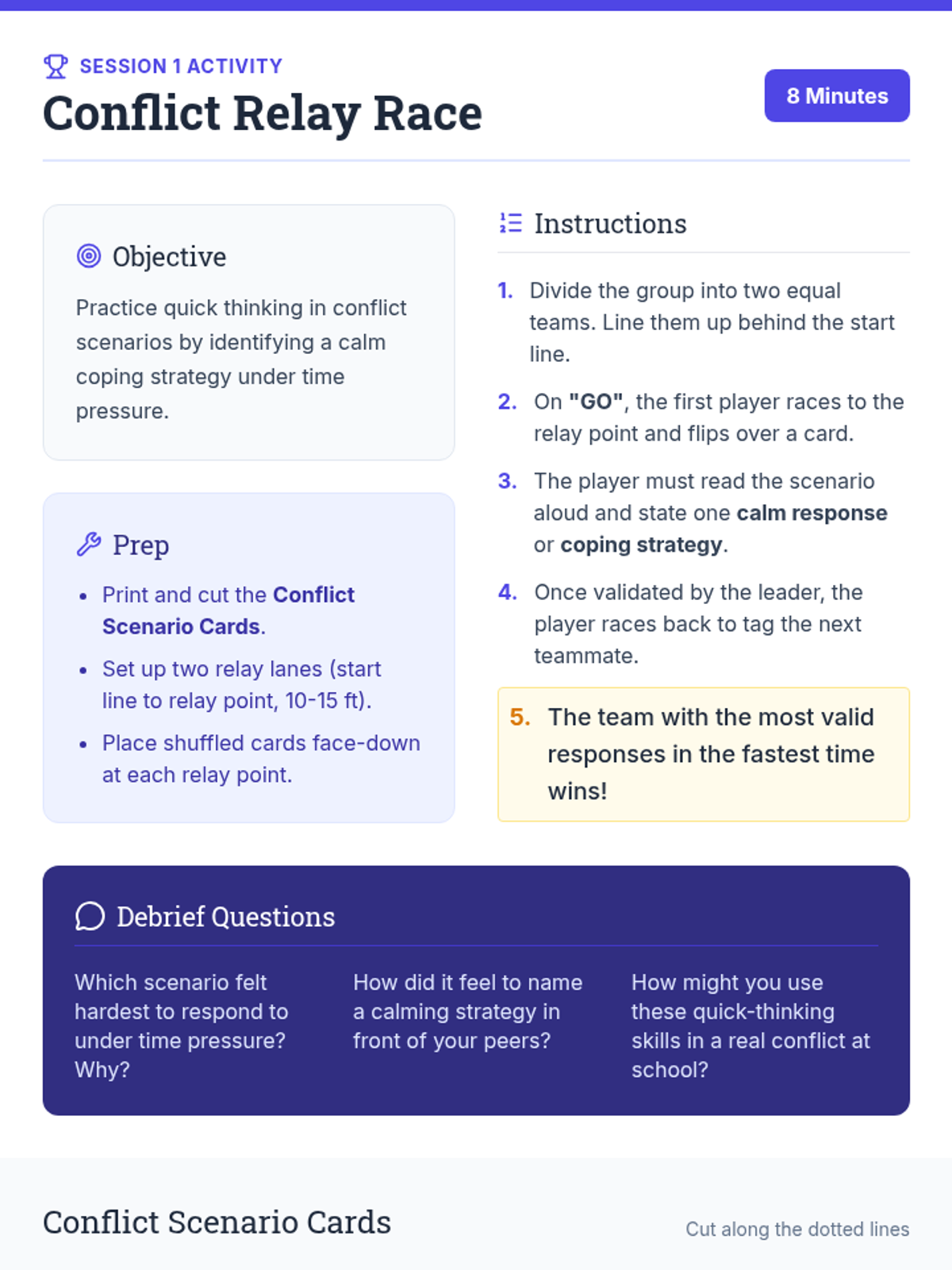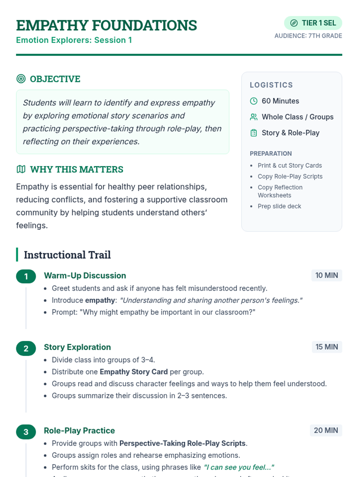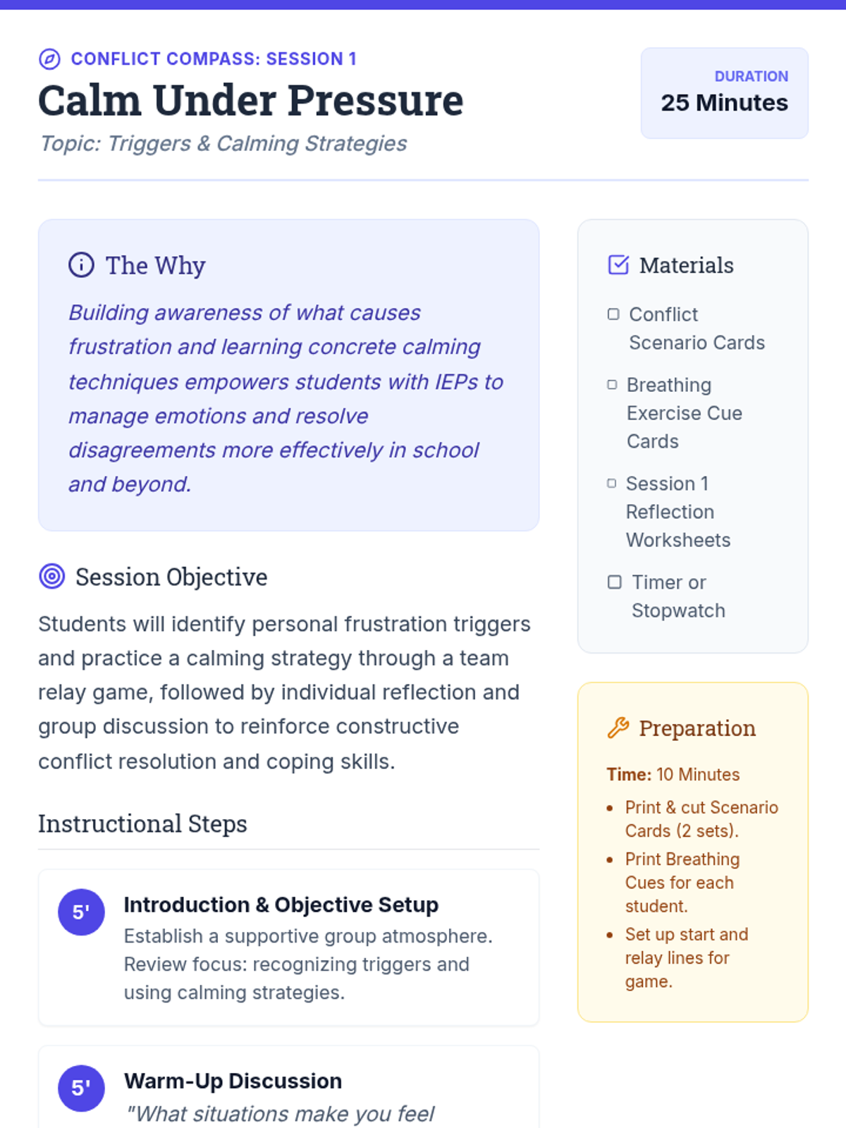 A 5-session social-emotional learning sequence designed for middle school students in Tier 2 groups. This unit covers conflict resolution, cognitive flexibility, emotional regulation, perspective taking, and growth mindset through interactive games, role-plays, and structured discussions.