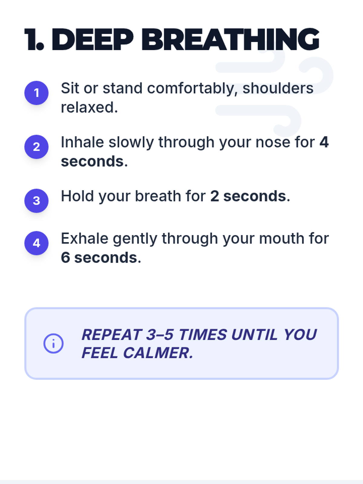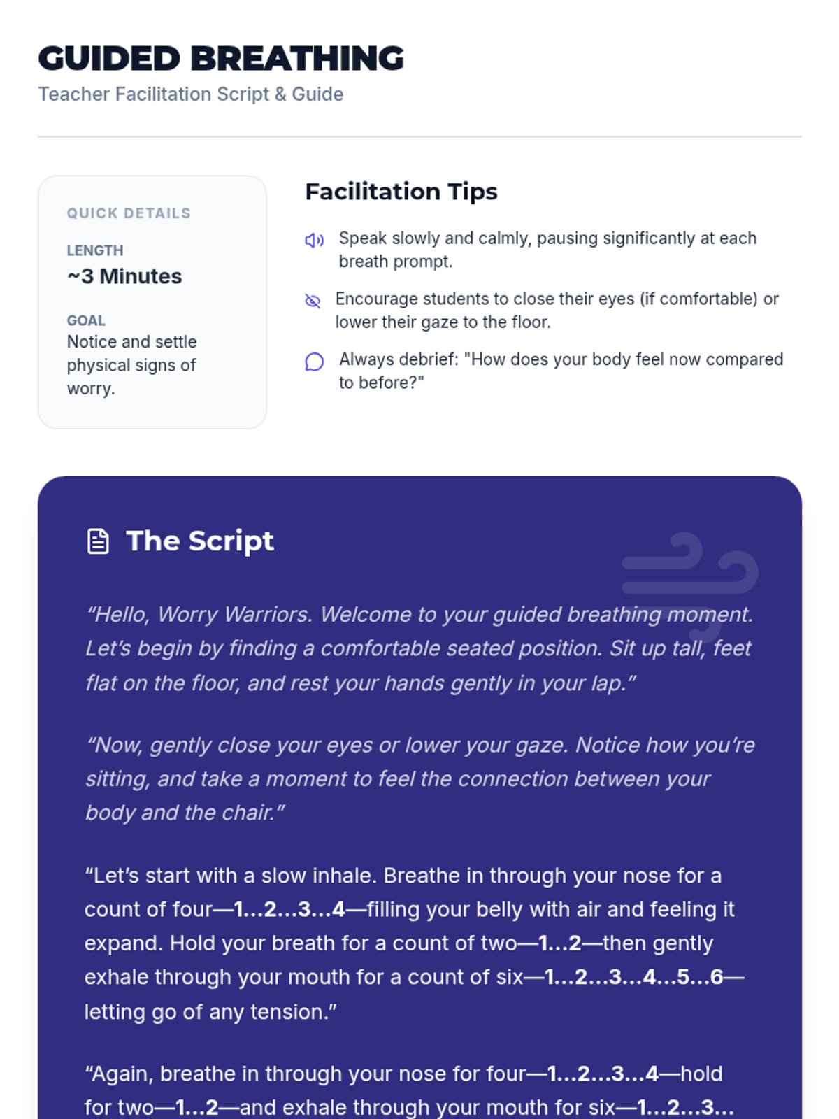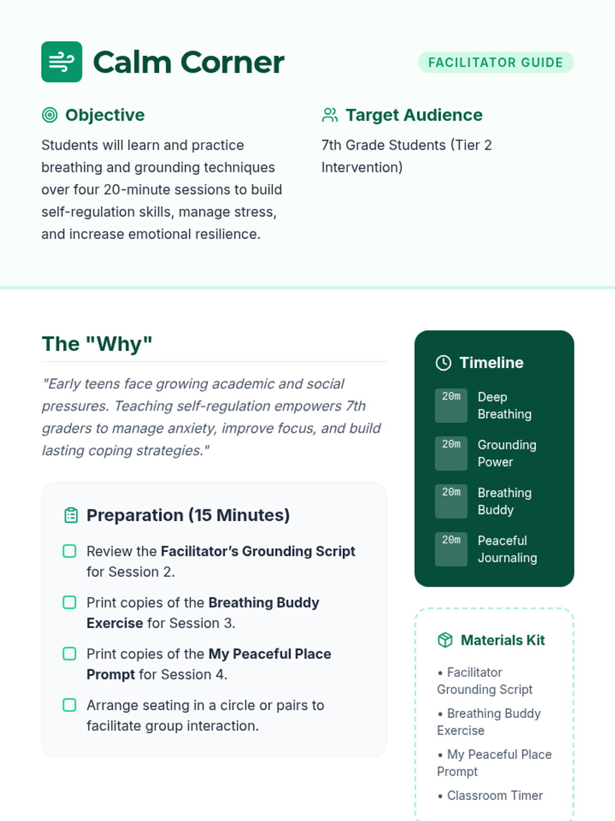 A four-session small-group intervention for 7th graders teaching breathing and grounding techniques to manage stress and anxiety. Students develop self-regulation skills to build emotional resilience and focus.
