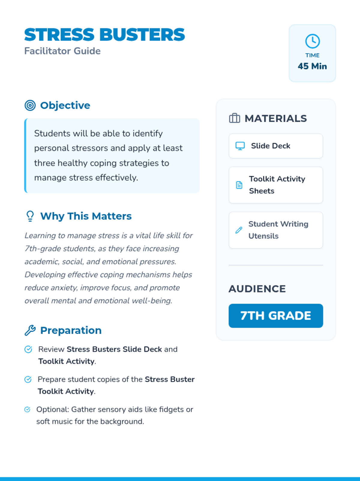 A two-part series designed for 7th-grade groups to build essential social-emotional skills. Students will learn to navigate the pressures of middle school by mastering stress management techniques and conflict resolution strategies for healthy friendships.