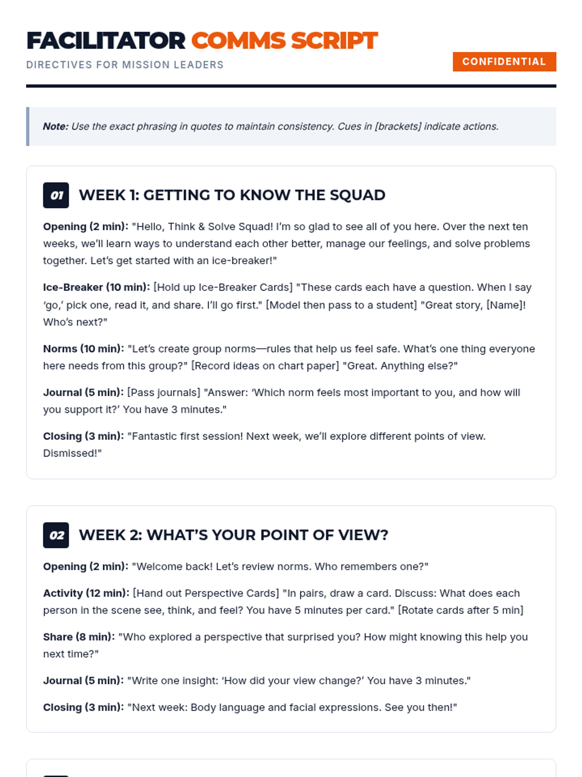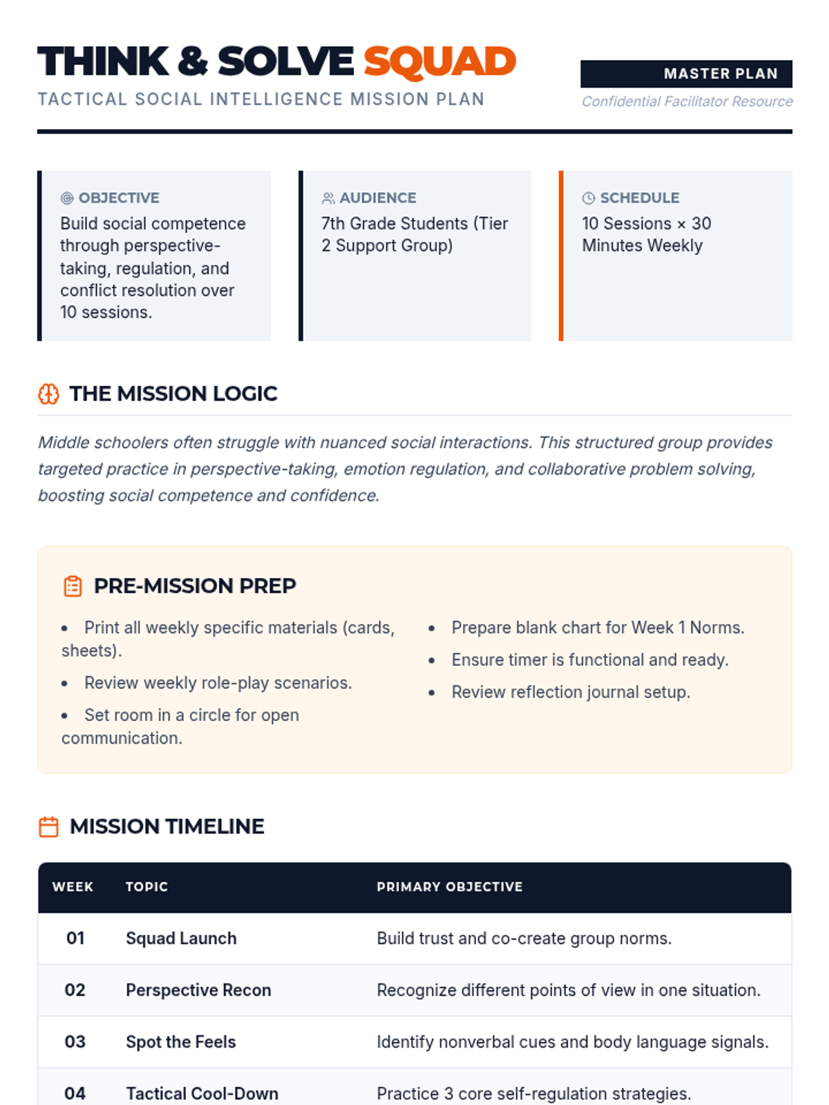 A comprehensive 10-week Tier 2 intervention program for 7th graders designed to improve social intelligence, emotional regulation, and collaborative problem-solving through weekly 30-minute sessions.
