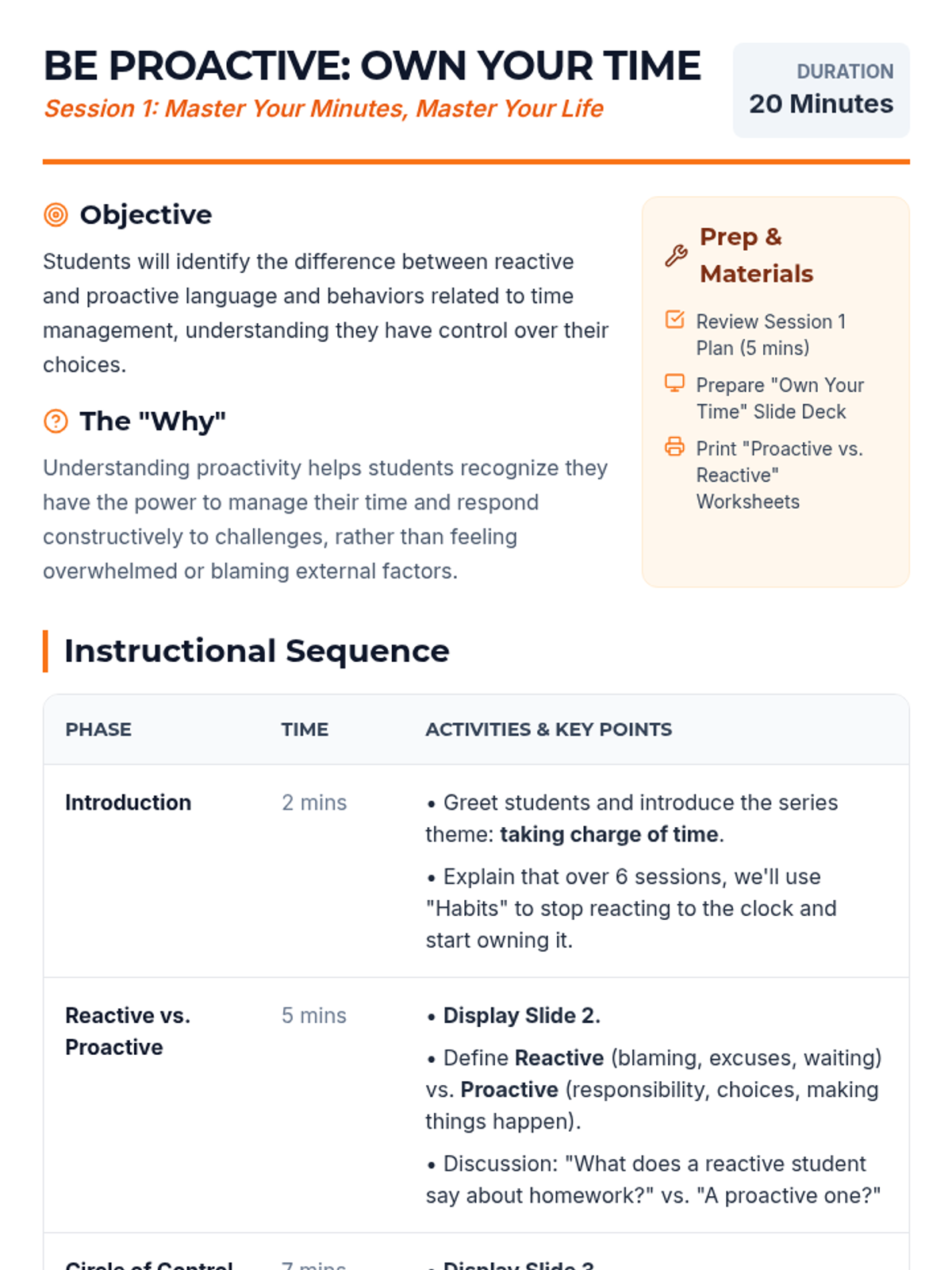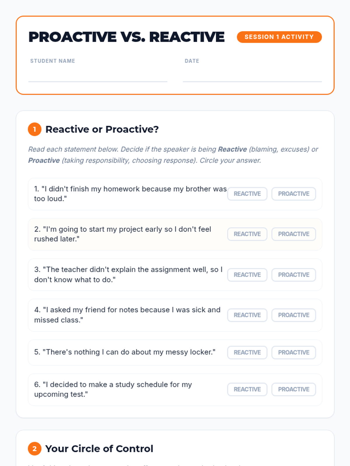 A six-session small-group counseling series for 7th and 8th graders based on Stephen Covey's '7 Habits of Highly Effective Teens.' Students learn to prioritize, plan, and execute tasks through proactive choices, goal setting, and self-care.