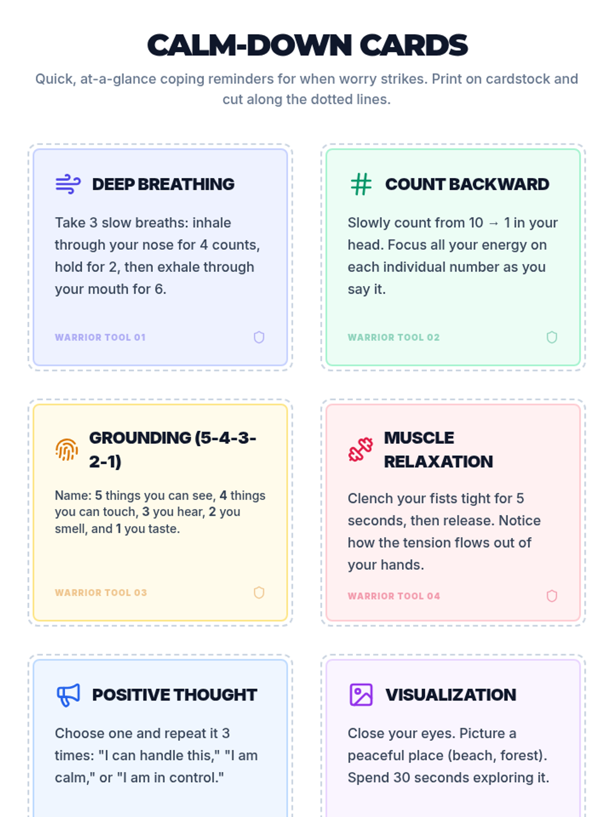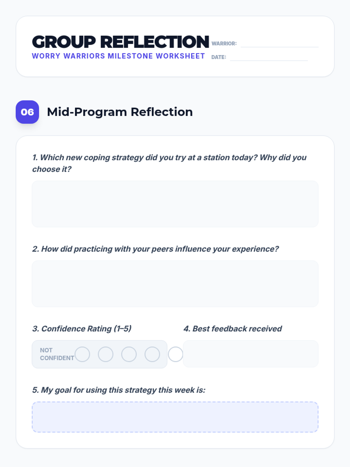 A 4-week Tier 2 group program for 6th-grade students to understand and manage anxiety using a personal 'toolkit' of coping strategies. Each 15-minute session provides practical, evidence-based skills through discussion, breathing exercises, and cognitive reframing.