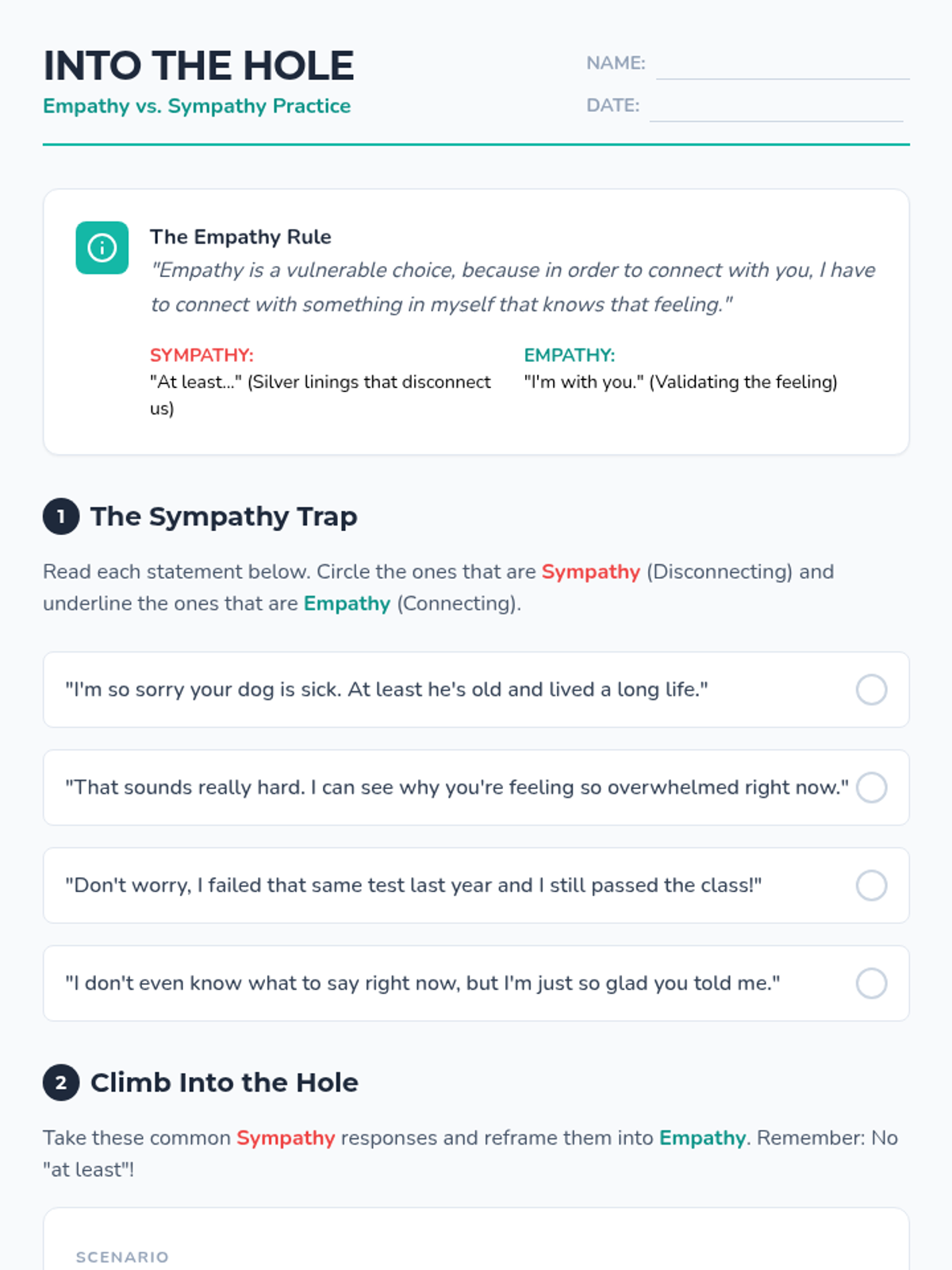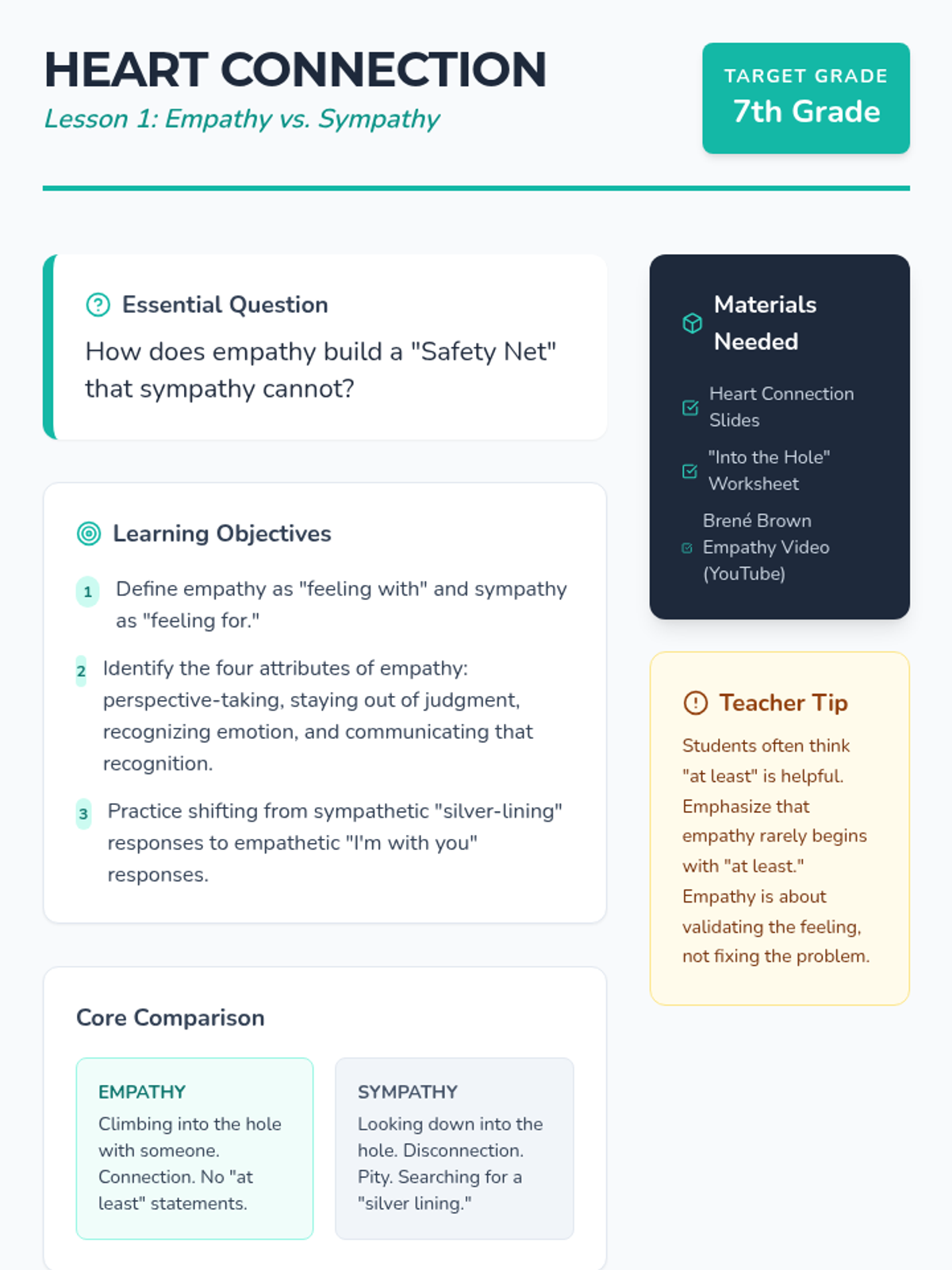 A 5-lesson sequence for 7th graders focused on creating a psychologically safe environment for group support. Students learn to distinguish empathy from sympathy, suspend judgment, set personal boundaries for sharing, and understand the ethical rules of confidentiality and mandatory reporting.
