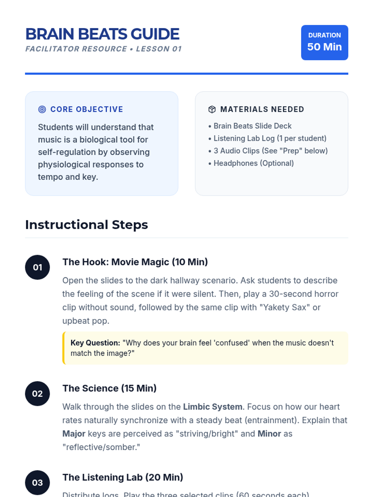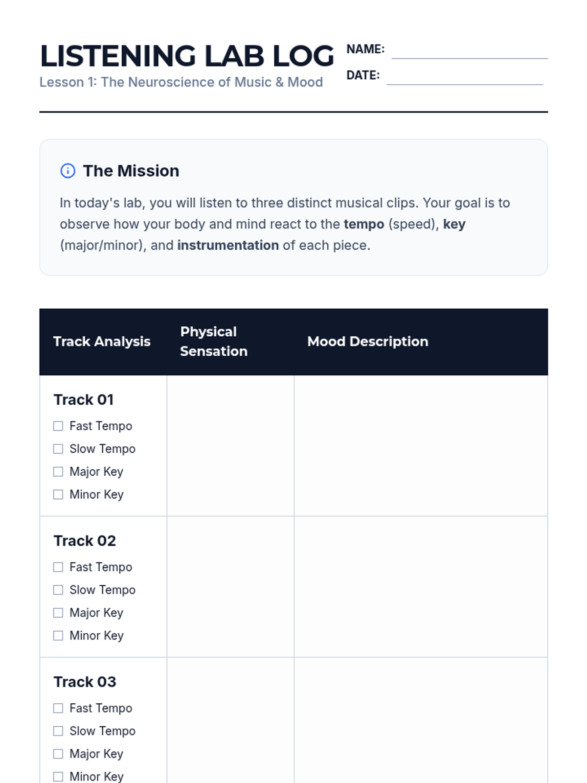A therapeutic journey exploring the intersection of music, physiology, and emotional regulation to support students in navigating loss through creative expression. Students learn to use the 'iso-principle' to curate personal soundscapes that provide comfort and facilitate healing.