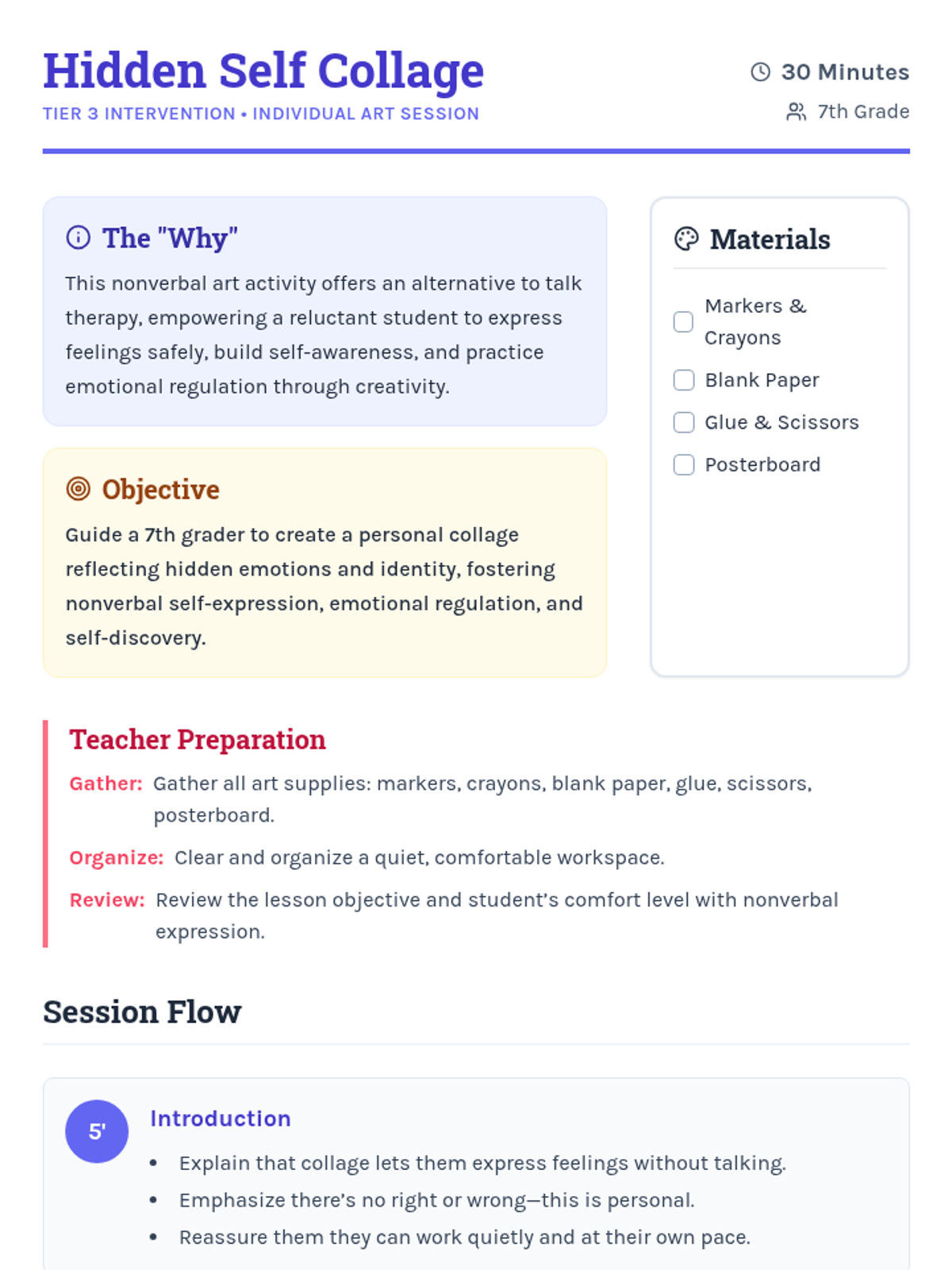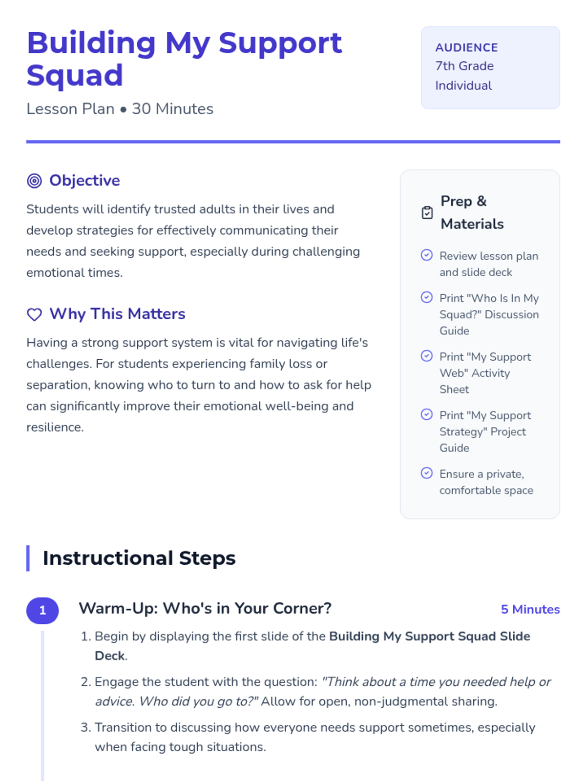 A 6-8 week Tier 3 intervention for a 7th-grade girl processing the loss of her uncle. This sequence provides a structured, supportive journey through understanding grief, honoring memories, and developing resilient coping strategies.