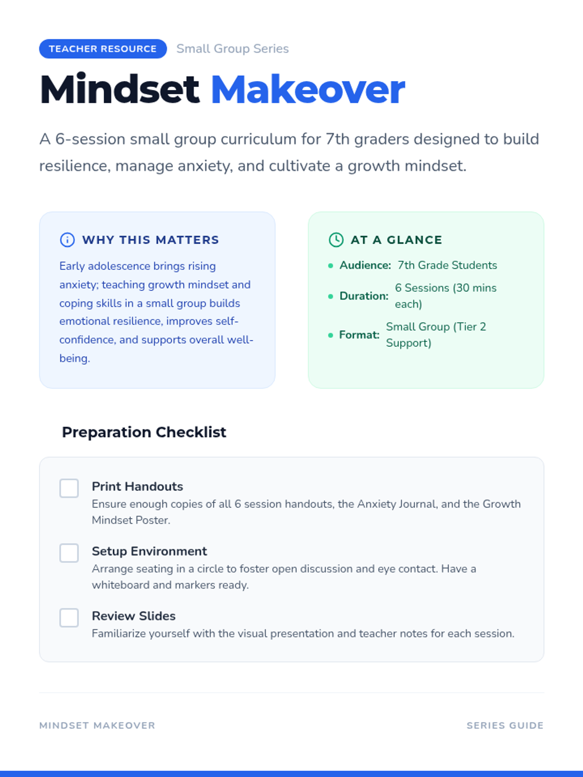 A 3-week comprehensive curriculum for middle schoolers focusing on identifying stress signals, developing healthy coping mechanisms, mastering positive self-talk, and building long-term resilience through interactive group activities and personal reflection.