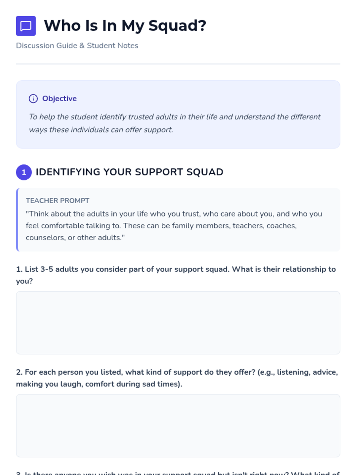 Counseling & Life SkillsSelf-AwarenessBasic Emotion RecognitionComplex Emotion IdentificationEmotional Nuance & Mixed FeelingsBuilding Positive Self-ImageRecognizing Strengths & Growth AreasAccurate Self-AssessmentPersonal Values IdentificationCultural & Individual Identity ExplorationValues-Based Decision MakingSelf-ManagementStop-and-Think StrategiesDelaying GratificationIndependent Impulse ManagementIdentifying Stress TriggersShort-Term Goal SettingSMART Goals DevelopmentGoal Monitoring & AdjustmentBuilding Perseverance & ResilienceInternal Motivation DevelopmentComprehensive Stress Reduction PlanningSocial AwarenessRecognizing Others' FeelingsDemonstrating EmpathyRespecting Individual DifferencesUnderstanding Cultural DiversityComplex Empathetic ResponsesMultiple Viewpoint ConsiderationMulti-Perspective AnalysisChallenging Stereotypes & BiasRelationship SkillsActive ListeningClear Verbal & Nonverbal CommunicationBuilding Positive FriendshipsWorking Cooperatively in GroupsCommunicating Personal BoundariesRespecting Others' BoundariesAssertive ExpressionPeaceful Problem-SolvingContributing to Team GoalsComplex Conflict NavigationMediation & NegotiationHealthy Romantic RelationshipsResponsible Decision-MakingDaily Problem IdentificationBrainstorming Multiple SolutionsEvaluating Pros & ConsRecognizing Risks & ConsequencesApplying Ethical FrameworksInformed Risk-Benefit DecisionsRoot Cause AnalysisMindfulnessMindful BreathingBody Scan MeditationDaily Mindfulness ApplicationDaily Self-Care RoutinesBalancing Life DemandsAdvocating for Wellness NeedsMental Health SupportUnderstanding Anxiety SymptomsWorry Management StrategiesProgressive Muscle RelaxationRecognizing Depression SignsBuilding Mood-Supporting RoutinesBehavioral Activation for MoodUnderstanding Grief StagesHealthy Grief CopingCreative Expression of LossBehavioral SupportDaily Check-In ProceduresDaily Goal Setting & ReviewRecognizing Escalation Warning SignsRequesting Breaks & SupportSelf-Calming During DistressUnderstanding Positive ReinforcementToken Economy ImplementationBehavior Chart TrackingAnalyzing Behavior PatternsIdentifying Antecedents & ConsequencesDetermining Behavior FunctionFunction-Based InterventionsIndividualized Behavior ContractsData-Driven Behavior AdjustmentTherapeutic ApproachesThoughts-Feelings-Behaviors ConnectionRecognizing Thinking PatternsChallenging Negative ThoughtsPositive Self-Talk PracticeThought Record TrackingAdvanced Cognitive RestructuringComprehensive CBT PlansBehavioral Activation TechniquesBuilding Positive ExperiencesExposure Hierarchies for AnxietyPresent-Moment AwarenessNon-Judgmental ObservationSelf-Soothing & DistractionComplex Emotion LabelingReducing Emotional Vulnerability (PLEASE)DEAR MAN CommunicationGIVE Skills for RelationshipsFAST Skills for Self-RespectRadical Acceptance PracticeCrisis Survival Skills (TIPP)Understanding Trauma EffectsTrauma Responses & TriggersIdentifying Trauma FeelingsGrounding TechniquesRegulation During Trauma DistressSafe Place VisualizationProcessing Through NarrativeDeveloping Trauma StoryPersonalized Safety PlanningGroup SupportTurn-Taking & SharingGroup Conversation SkillsSharing in Supportive EnvironmentLearning from Similar ChallengesBuilding Community & BelongingNavigating Peer RelationshipsGroup Skill PracticeGroup Mental Health EducationStress & Anxiety UnderstandingCrisis Support & SafetyKnowing When to Seek HelpIdentifying Mental Health CrisesGrounding During CrisisUsing Crisis HotlinesBuilding Support NetworksAccessing Mental Health ResourcesWarning Signs & Coping StrategiesDeveloping Personal Safety PlansUnderstanding Suicide Warning SignsGatekeeper Skills for PeersDigital LiteracySocial MediaTechnology BasicsProductivity ToolsInternet and Online ResearchWeb Design and PublishingDigital CitizenshipOnline Safety and PrivacyEmerging TechnologiesFinancial LiteracyMaking Financial DecisionsBanking and AccountsConsumer SkillsSaving and InvestingCredit and DebtEmployment and IncomeTaxesInsuranceMajor PurchasesEconomic ConceptsFinancial PlanningCollege & Post-Secondary PlanningCareer ExplorationUnderstanding Post-Secondary OptionsCollege Research & SelectionAdmission RequirementsCollege Application ProcessPersonal Statement WritingFAFSA CompletionScholarship Search & ApplicationsUnderstanding Student LoansContinuing Education PlanningInterview PreparationResearching EmployersCommon Interview QuestionsSTAR Method ResponsesProfessional Interview PresenceVirtual Interview SkillsInterview Follow-UpJob Search SkillsUnderstanding Job PostingsEffective Job Search StrategiesNetworking for OpportunitiesResume Writing BasicsAction Verbs & AchievementsTailoring Resumes to JobsCover Letter WritingProfessional ReferencesProfessional CommunicationBusiness Email EtiquettePhone & Voicemail ProfessionalismMeeting ParticipationPresentation SkillsProfessional Work EthicTime Management & ProductivityTeamwork & CollaborationAdaptability & FlexibilityProblem-Solving at WorkConstructive FeedbackWorkplace RightsUnderstanding Employment LawsPay & Benefits UnderstandingWorkplace SafetyAnti-Discrimination & Harassment