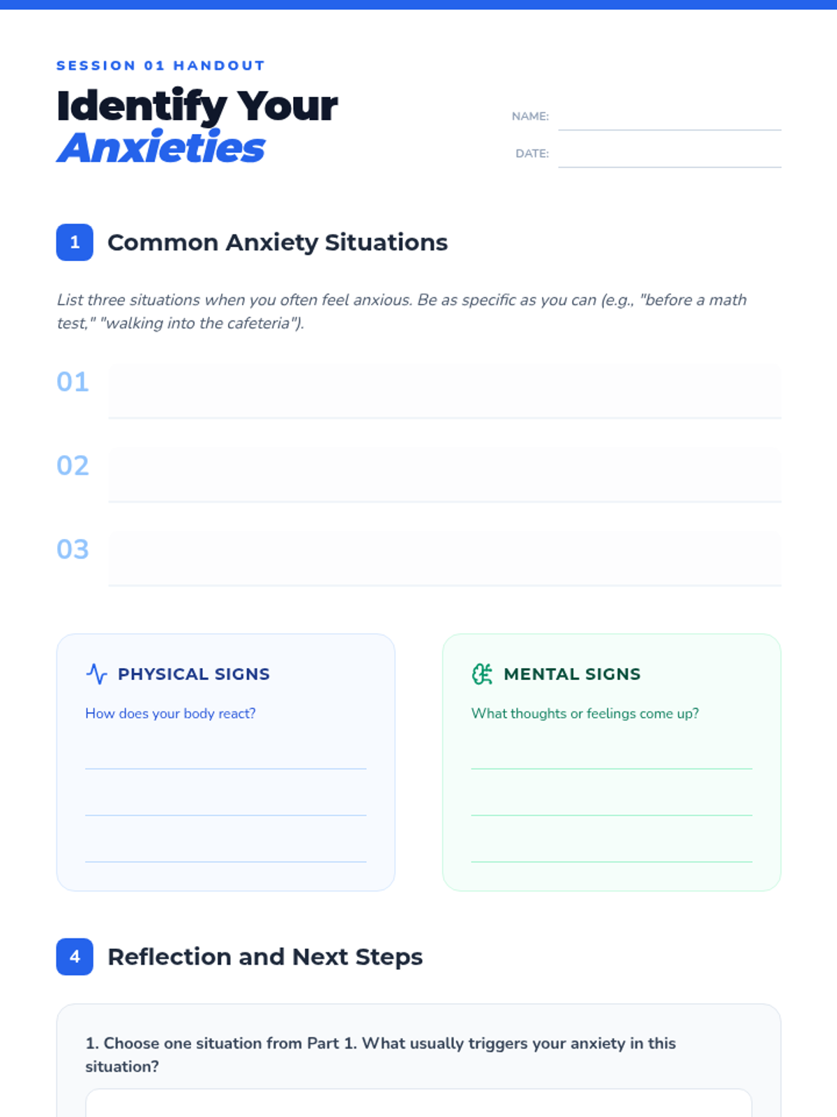 Worry Management StrategiesCognitive behavioral techniques, mindfulness, and grounding exercises to identify triggers and manage daily stressors. Equips students with practical coping mechanisms to navigate anxiety and build emotional resilience.
