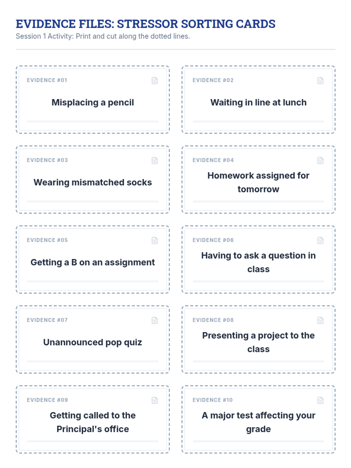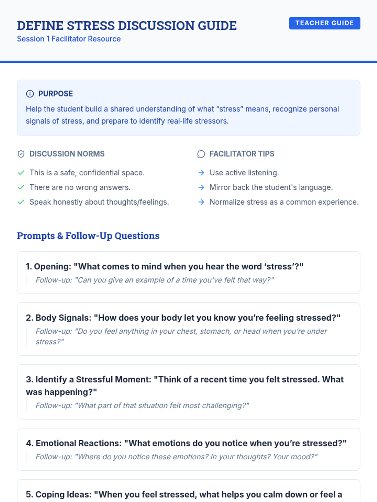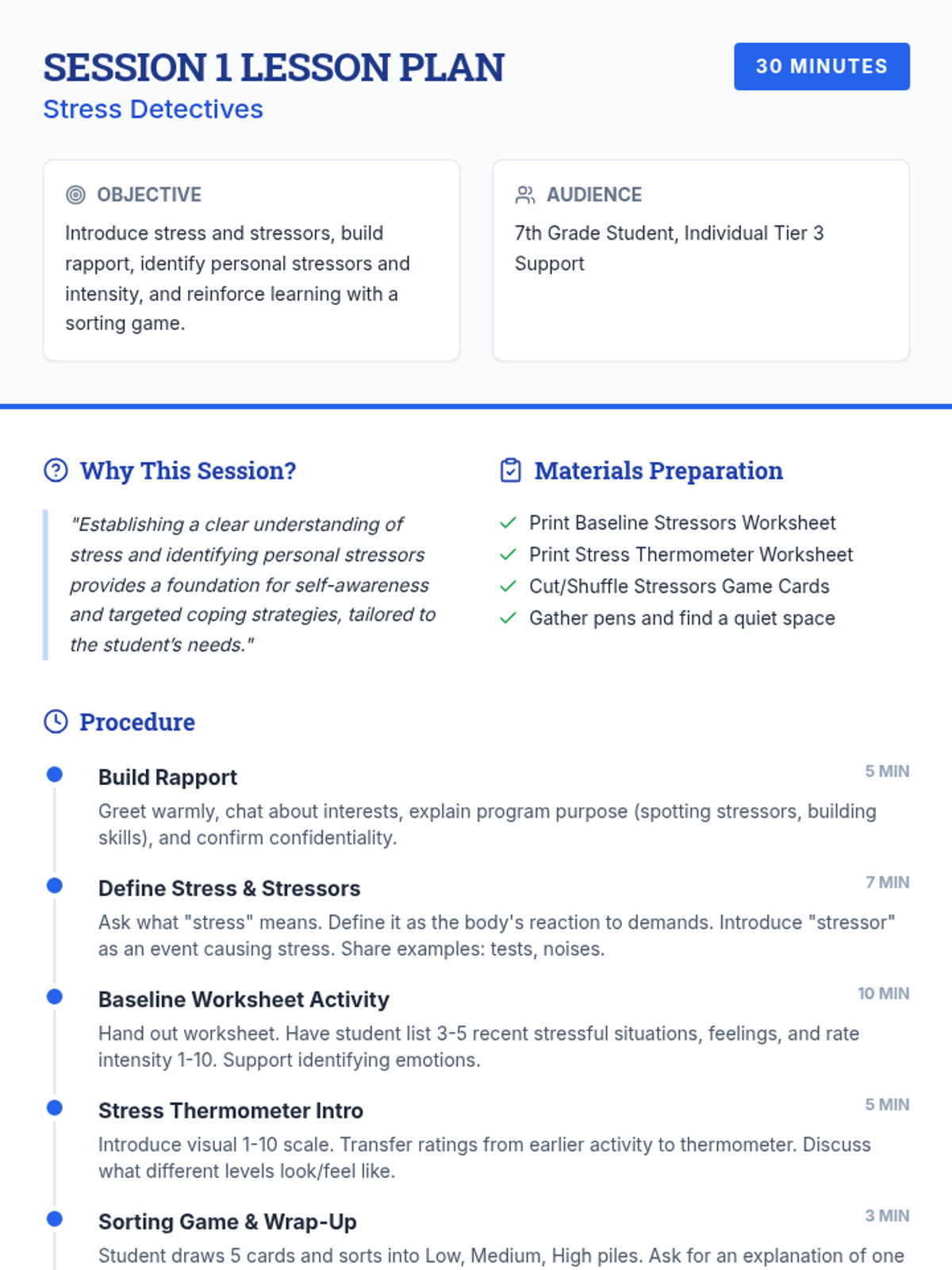 A 10-session, 30-minute individual Tier 3 support program for a 7th grader with a seizure history. Students will learn to identify personal stressors, understand emotional and physical reactions, and practice evidence-based coping strategies to build resilience and reduce stress.
