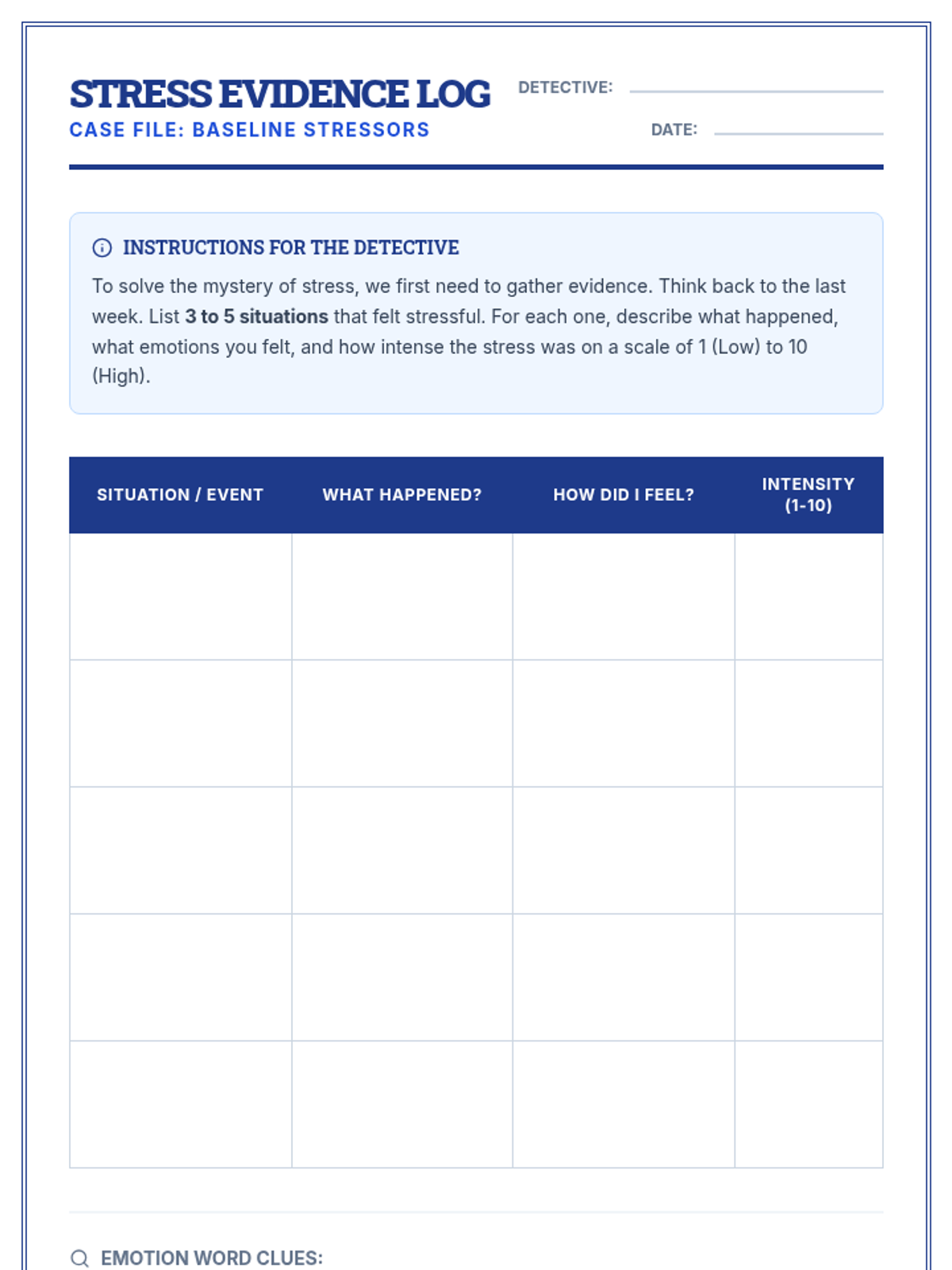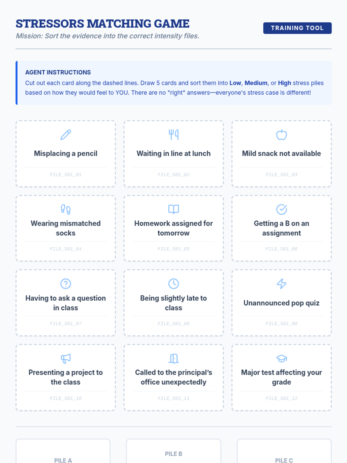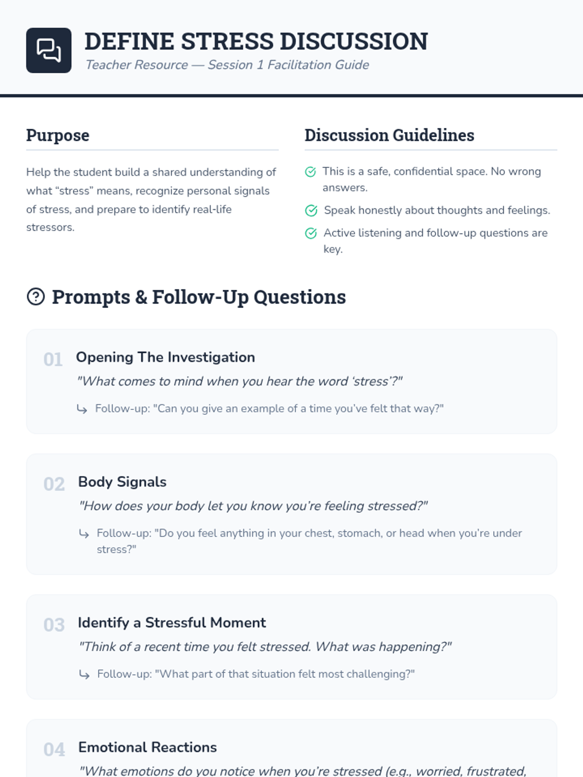 A 10-session, 30-minute individual Tier 3 support program for a 7th grader with a seizure history. Students will learn to identify personal stressors, understand emotional and physical reactions, and practice evidence-based coping strategies to build resilience and reduce stress.