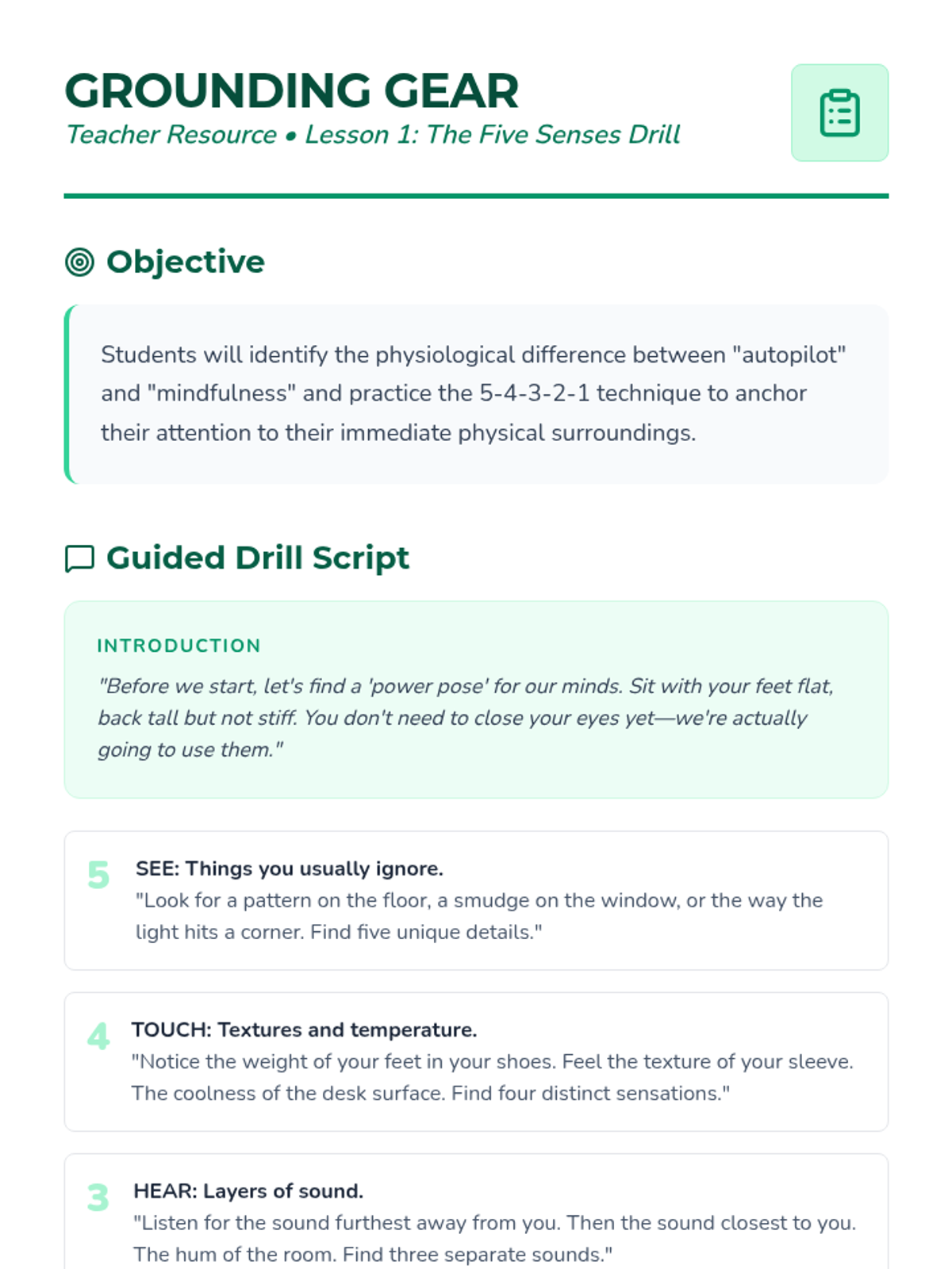 A 5-lesson unit for 7th graders focusing on mindfulness through sensory awareness. Students learn to ground themselves using their five senses, move from external observation to internal awareness, and integrate mindfulness into daily routines to reduce stress and improve focus.