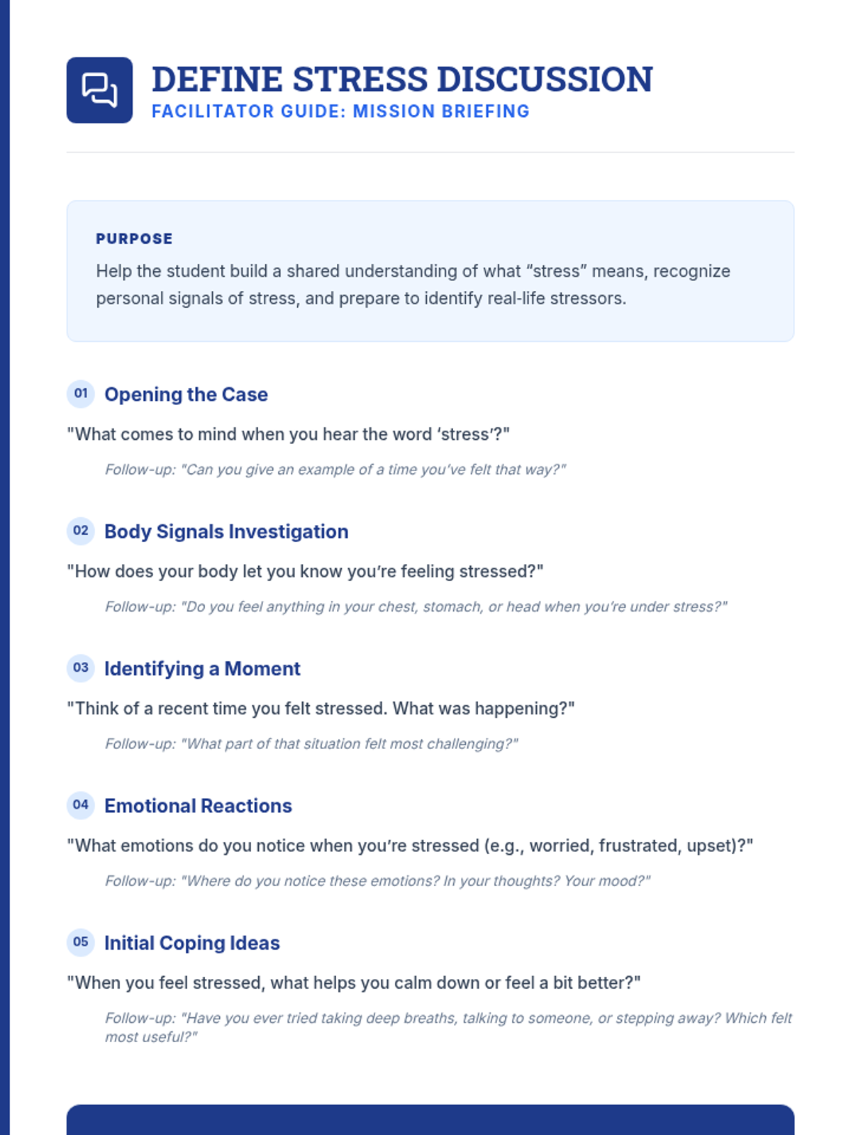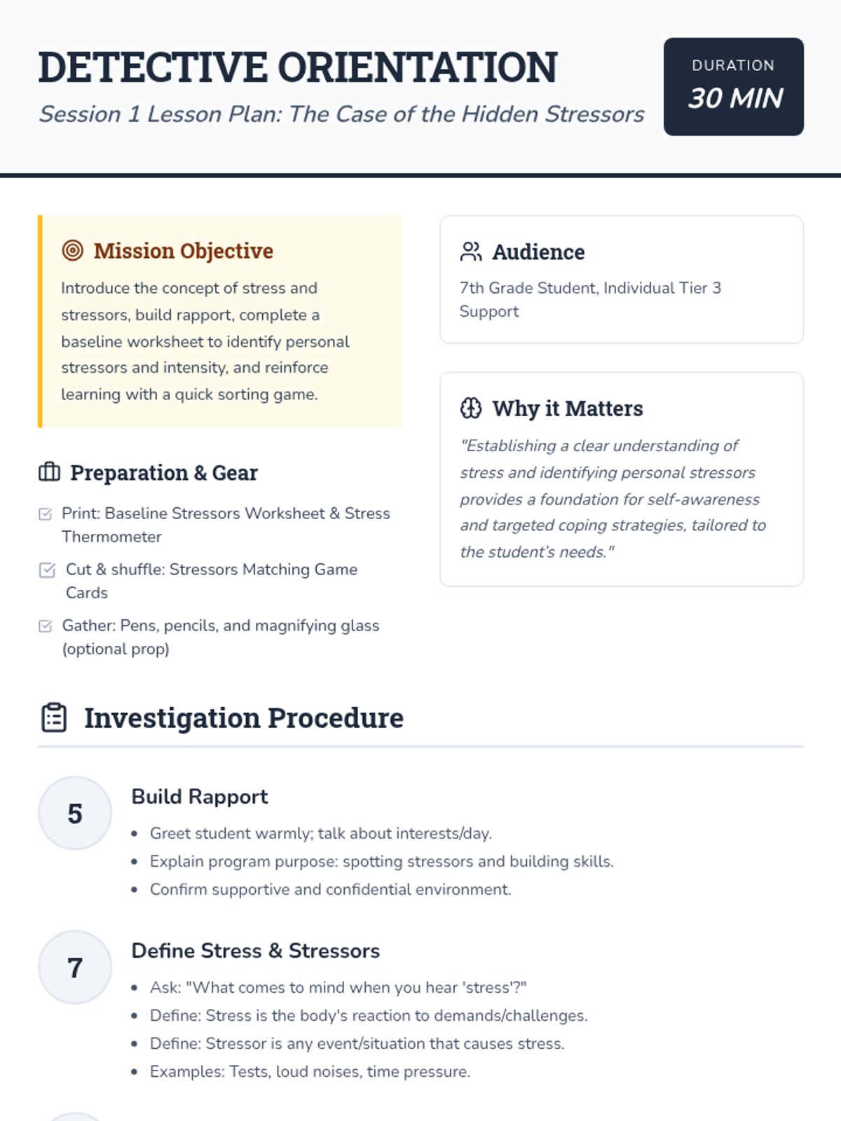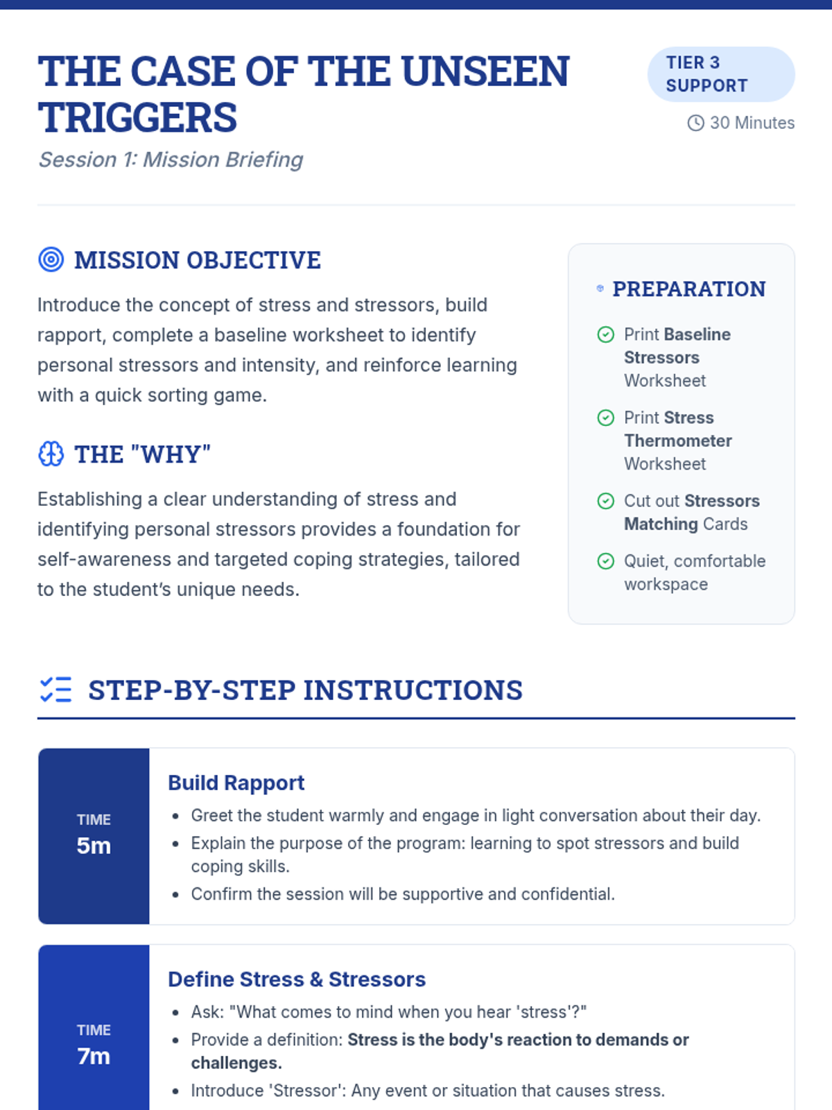A 10-session Tier 3 support program for 7th-grade students with seizure histories, focusing on identifying stressors, physical cues, and evidence-based coping mechanisms through a 'Detective Quest' theme.