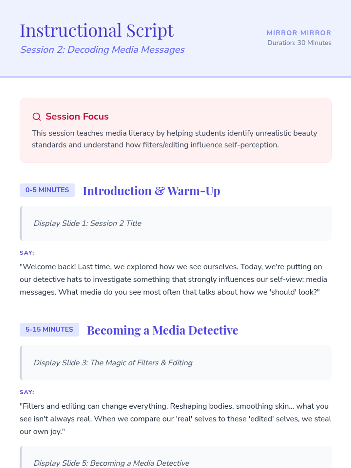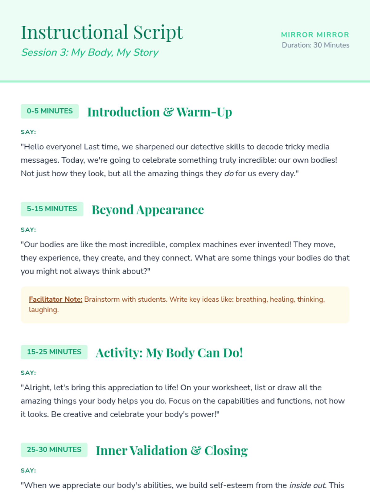 A 4-session social skills group for 6th-grade girls focused on body neutrality, media literacy, digital authenticity, and internal self-compassion. This sequence helps students transition from seeing themselves as "objects to be viewed" to "subjects who experience the world."