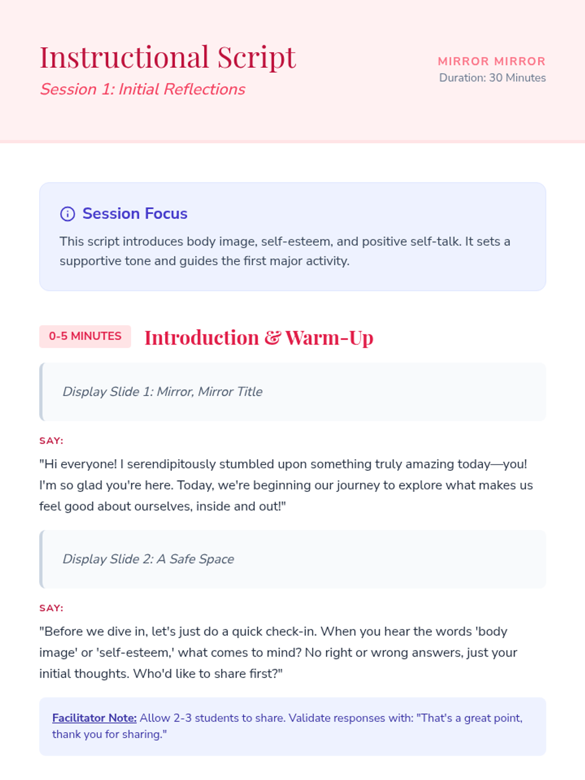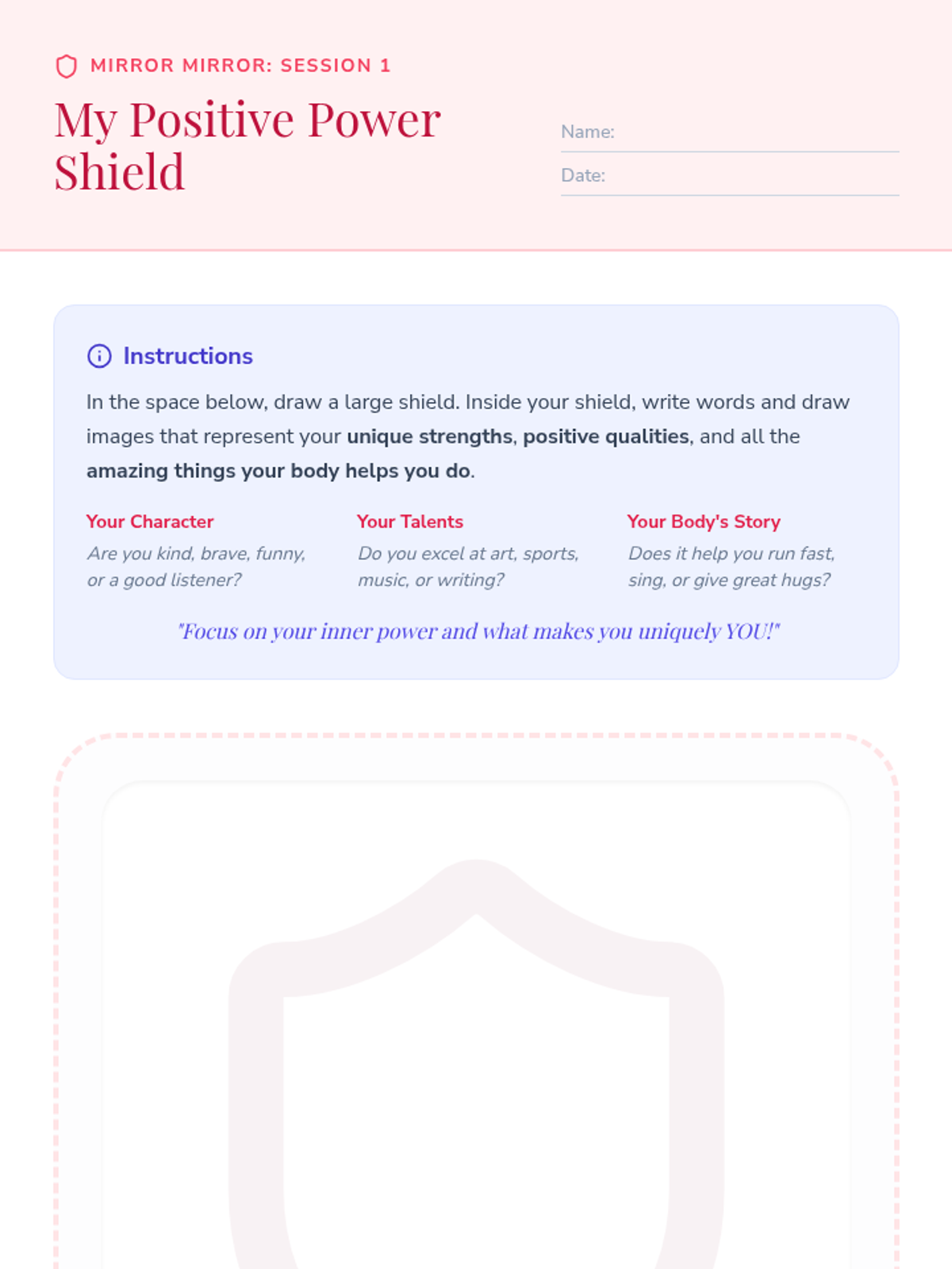 A 15-session empowerment program for 7th-grade girls focused on building a healthy body image, fostering self-esteem, and mastering positive self-talk through thematic discussions and creative activities.