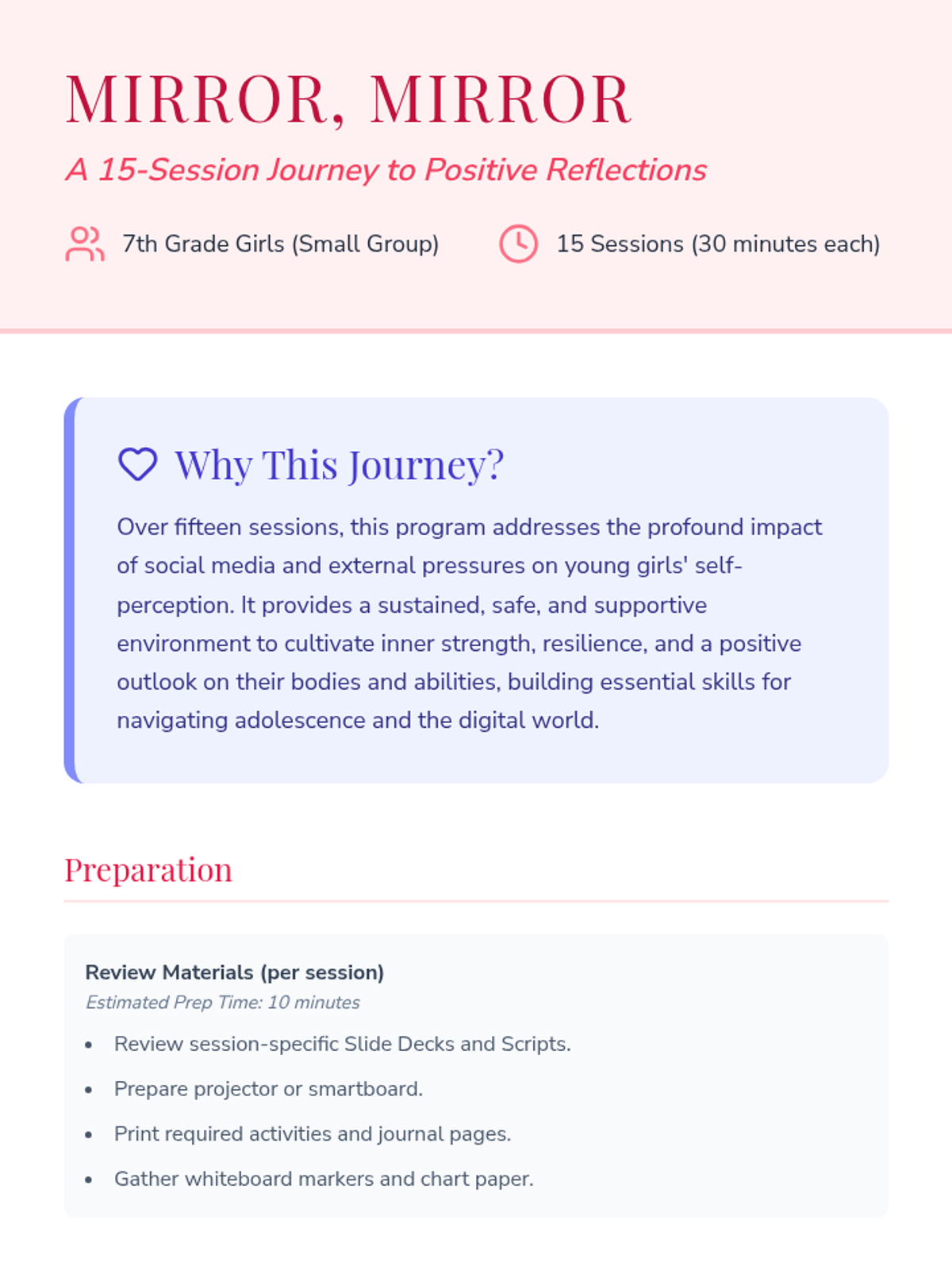 A comprehensive six-week empowerment program for middle school girls focused on building self-confidence, identifying healthy friendship patterns, navigating social hierarchies, and developing self-advocacy skills.