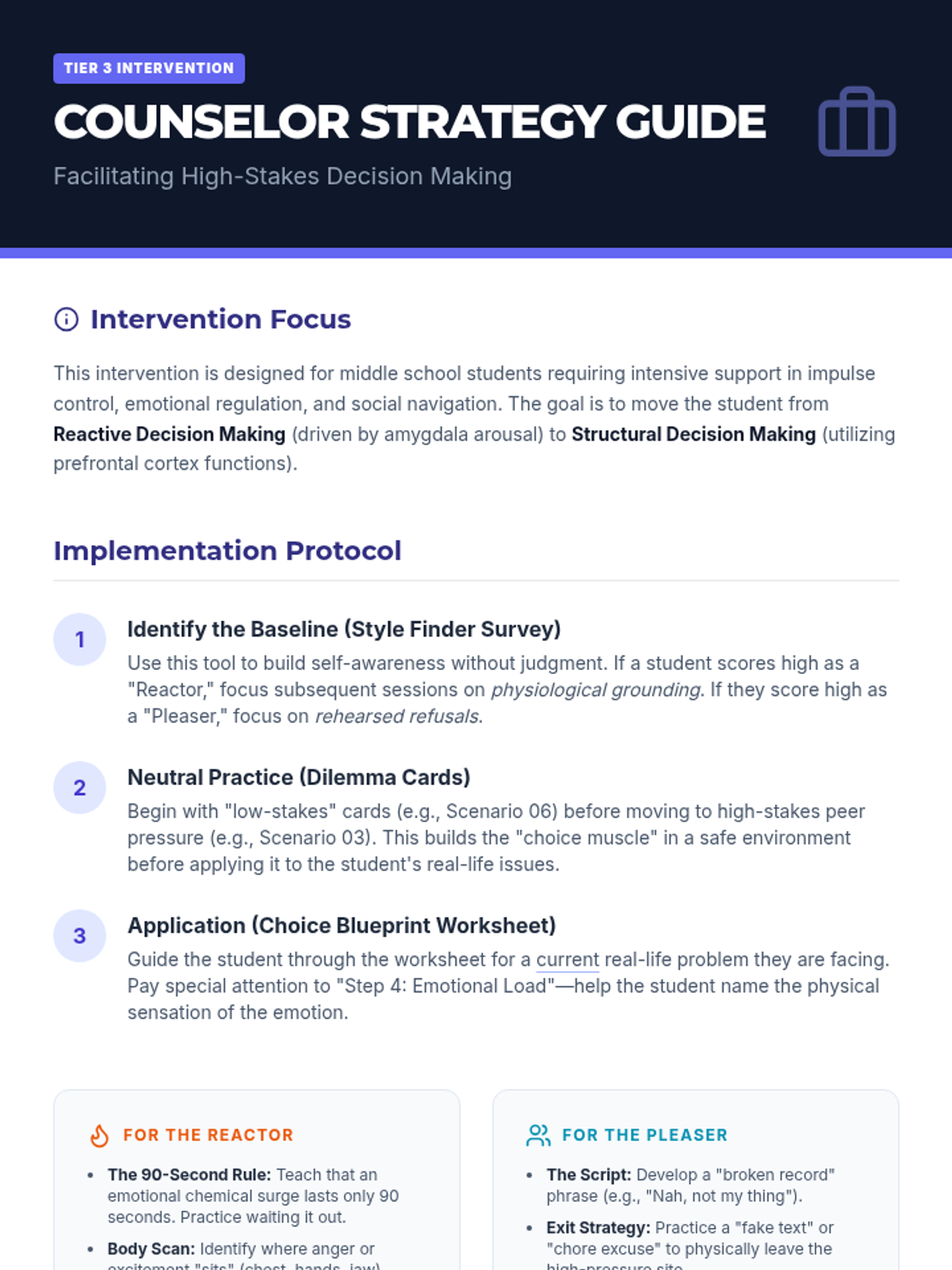 A comprehensive Tier 3 intervention series designed to help middle school students master intensive decision-making skills, focusing on emotional regulation and peer pressure resistance.