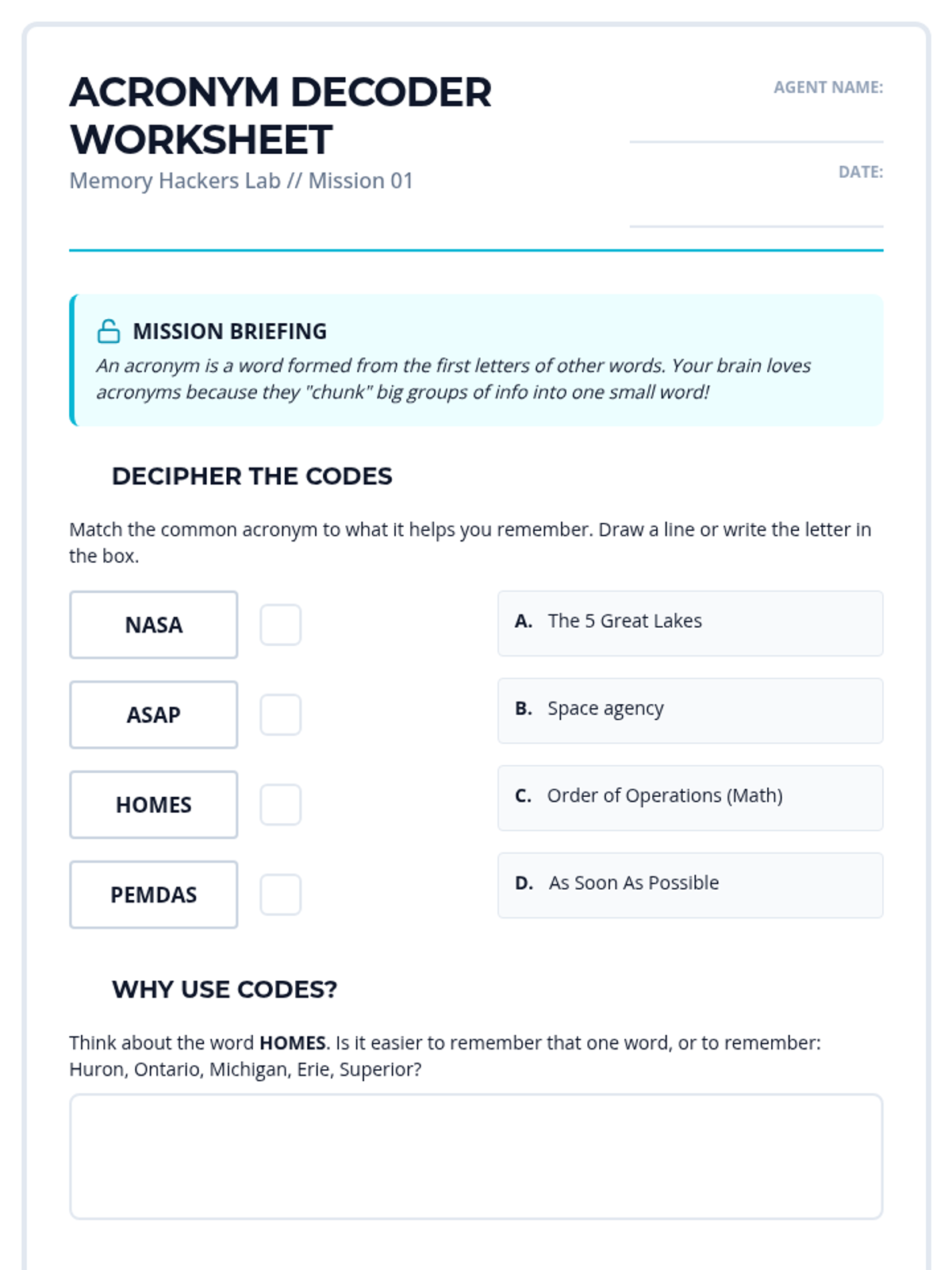 Students master the art of creating and using mnemonic acronyms to reduce cognitive load and improve concept retrieval. The sequence progresses from decoding common acronyms to engineering personal and academic ones, culminating in a mastery arcade.
