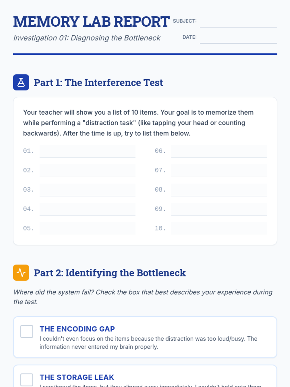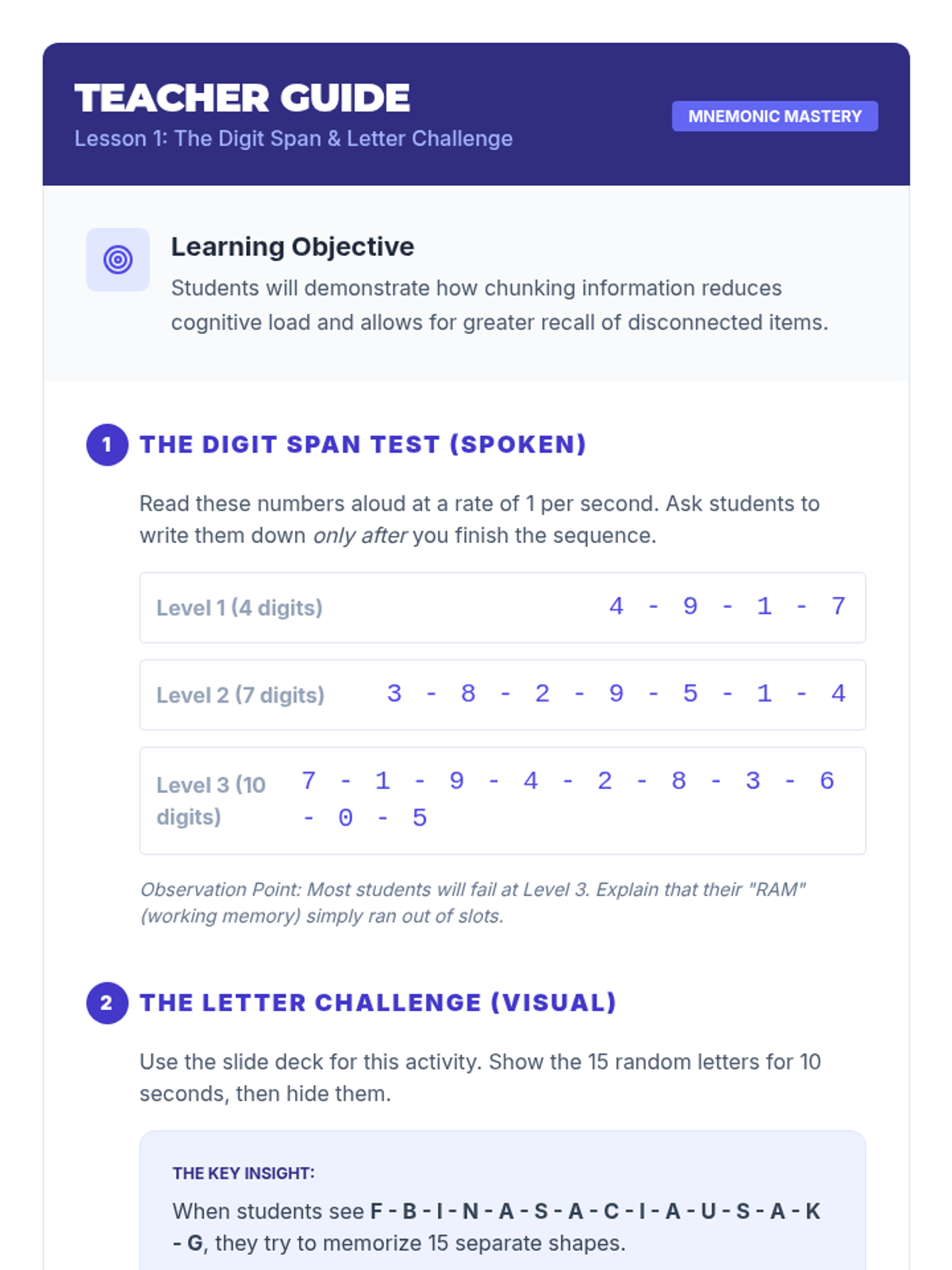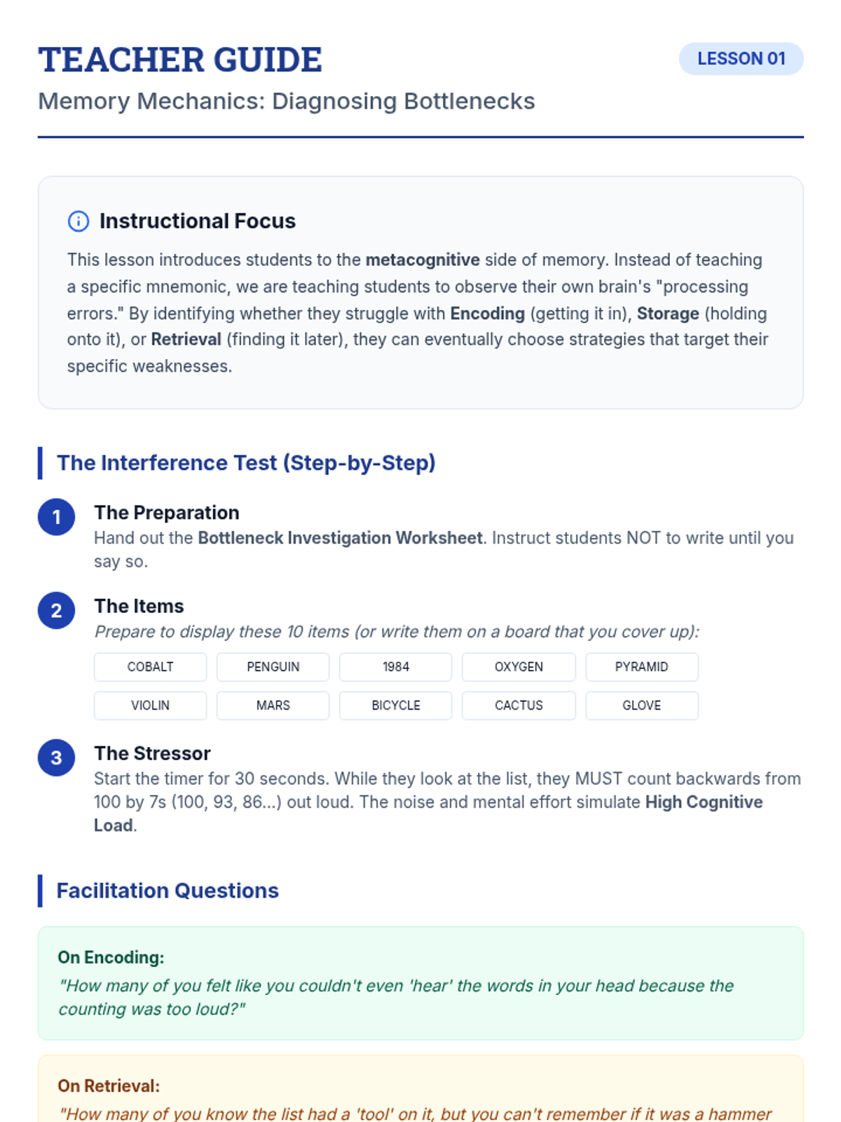 This sequence guides 7th-grade students through evaluating and selecting mnemonic strategies to support working memory. Students transition from understanding their own memory bottlenecks to building a personalized 'Executive Function Toolkit' for independent academic success.