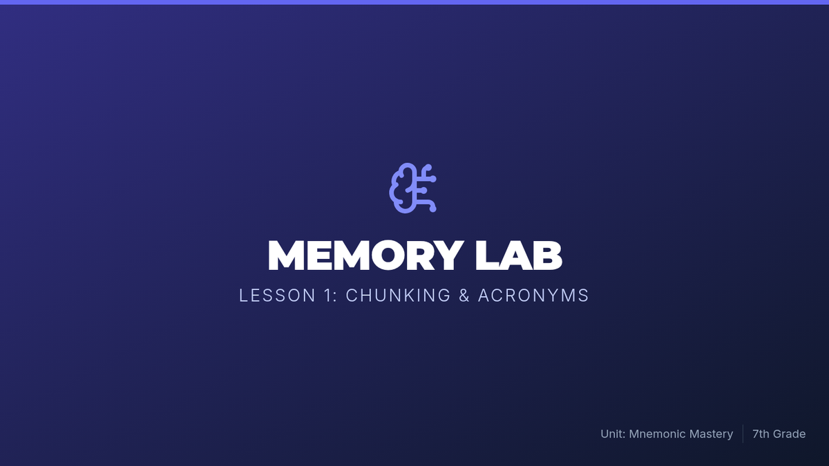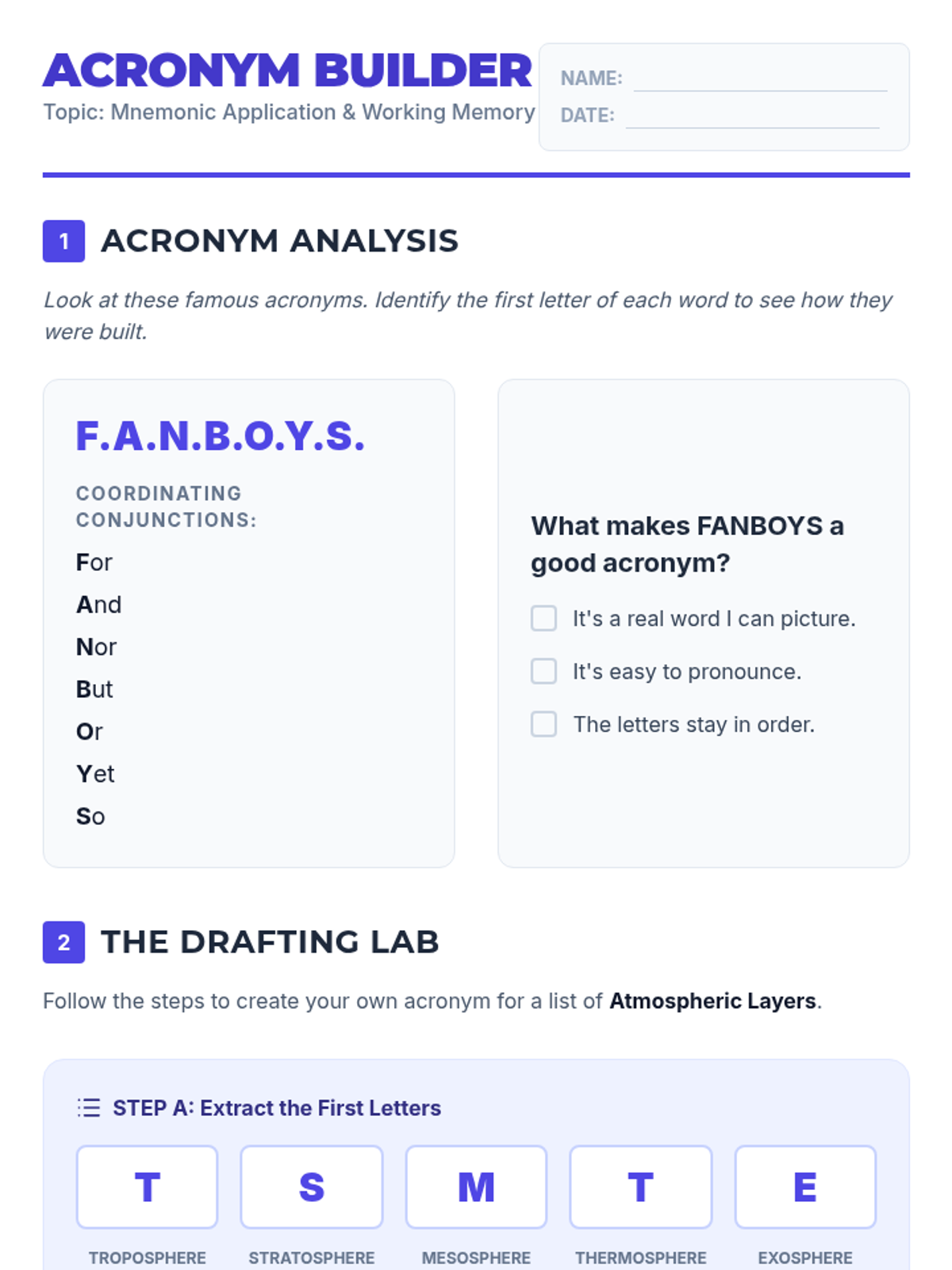 This sequence introduces 7th-grade students to the mechanics of mnemonic devices, specifically acronyms and acrostics, to support working memory and enhance academic recall in science and history.