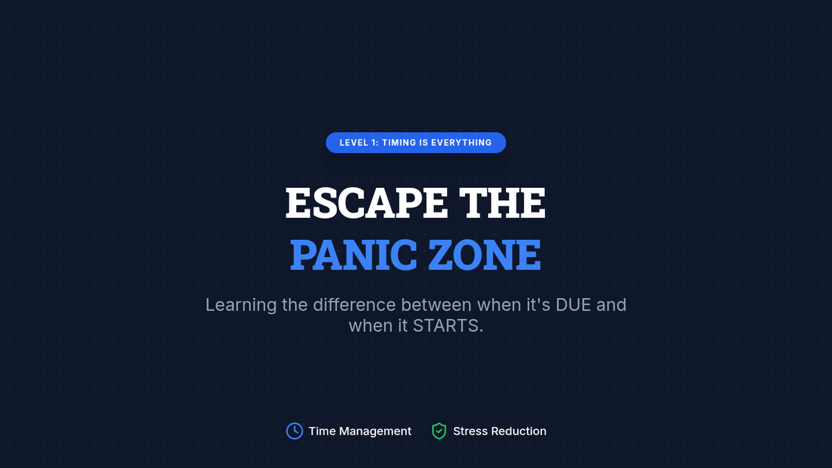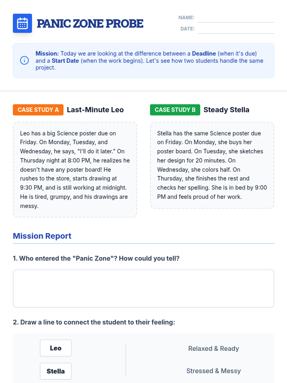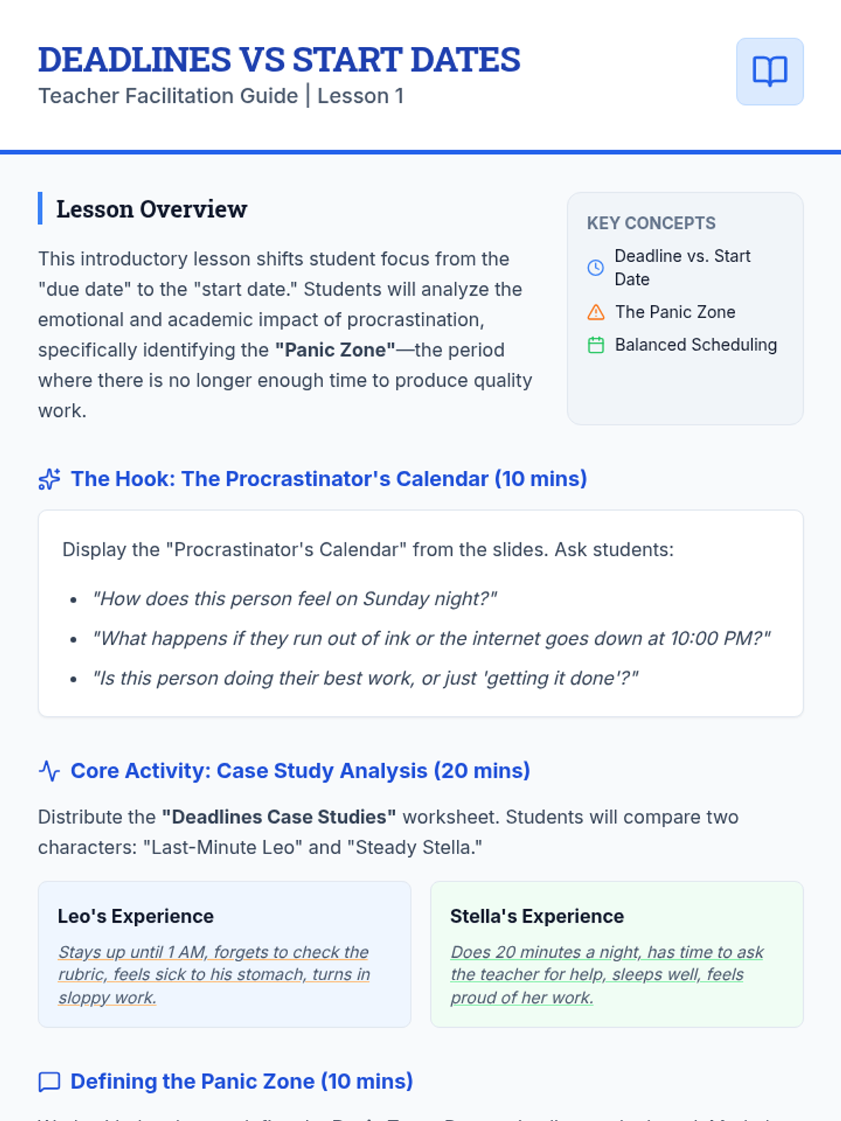 A 5-lesson sequence for 7th-grade students on project planning through backward design. Students learn to map deadlines, set milestones, visualize workflows, and establish review routines to reduce stress and avoid the 'panic zone'.