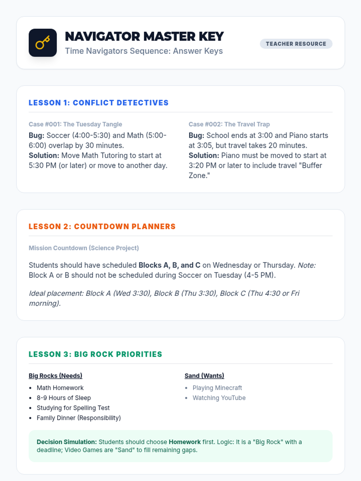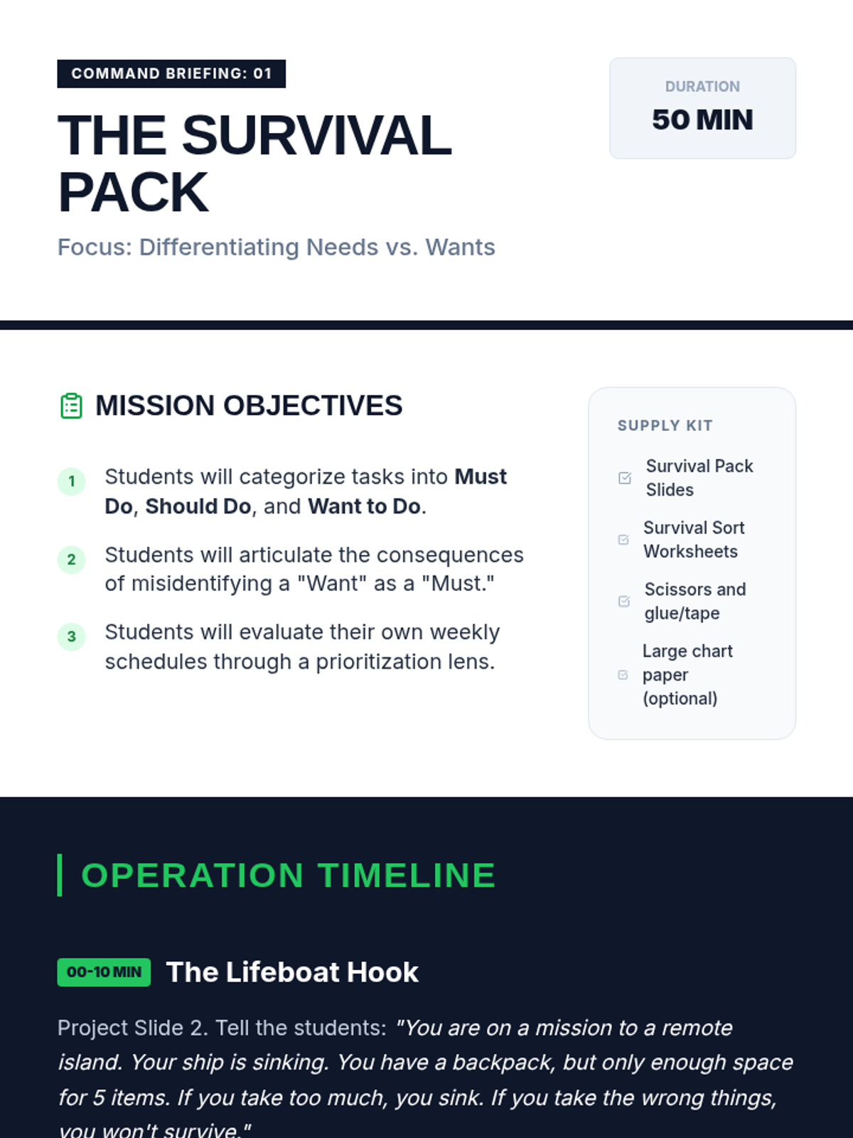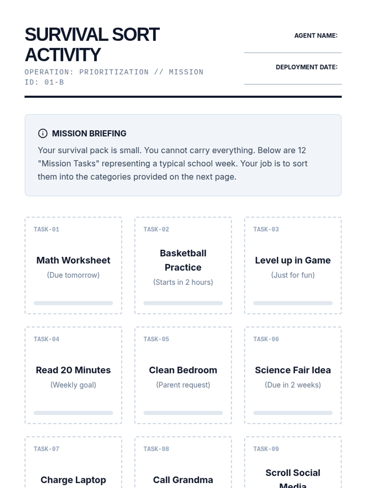 A comprehensive sequence for 7th-grade students focusing on prioritization, decision-making, and adaptive scheduling. Students use a 'Command Center' theme to learn how to categorize tasks, use the Eisenhower Matrix, and pivot when plans are disrupted.