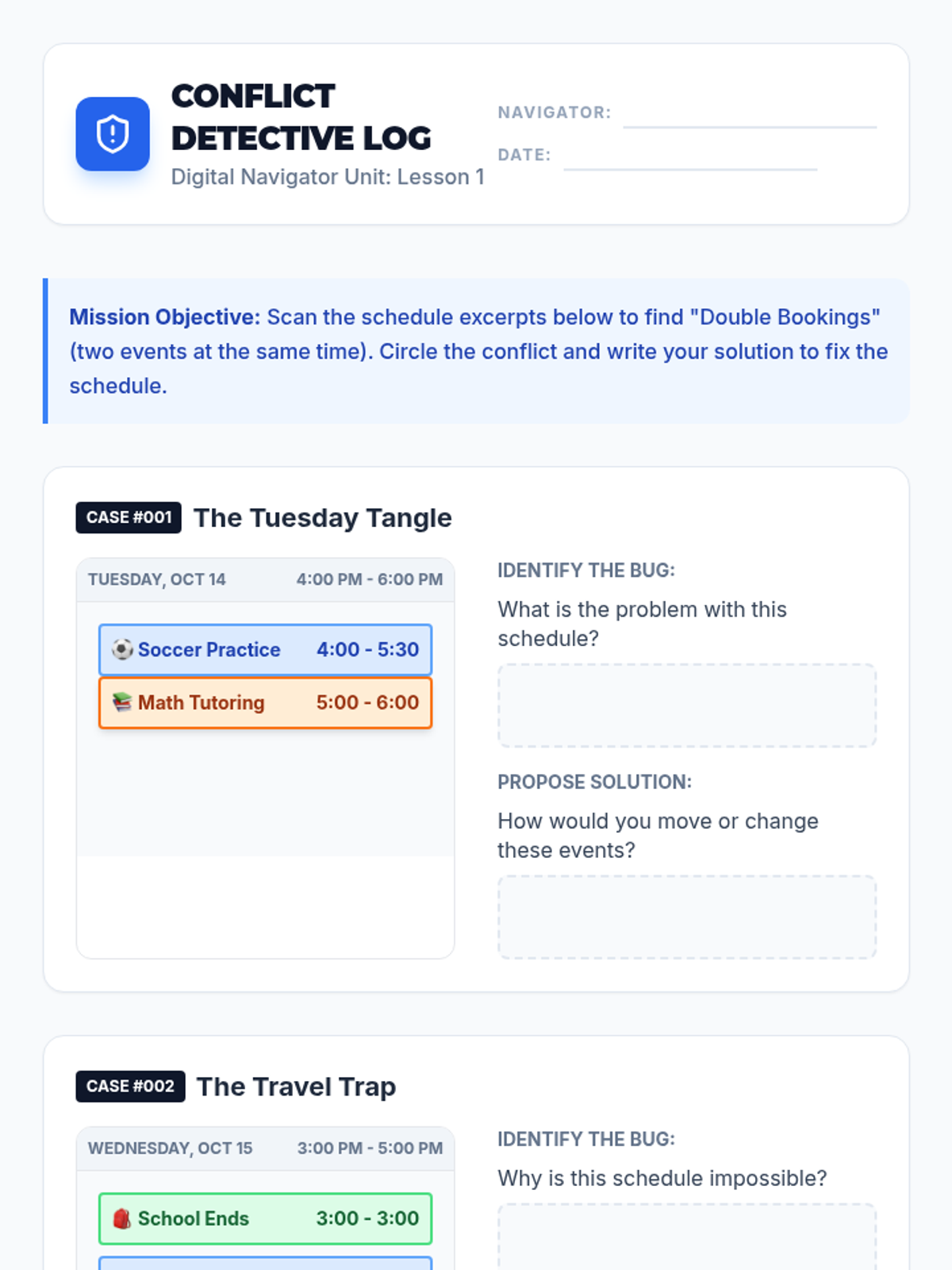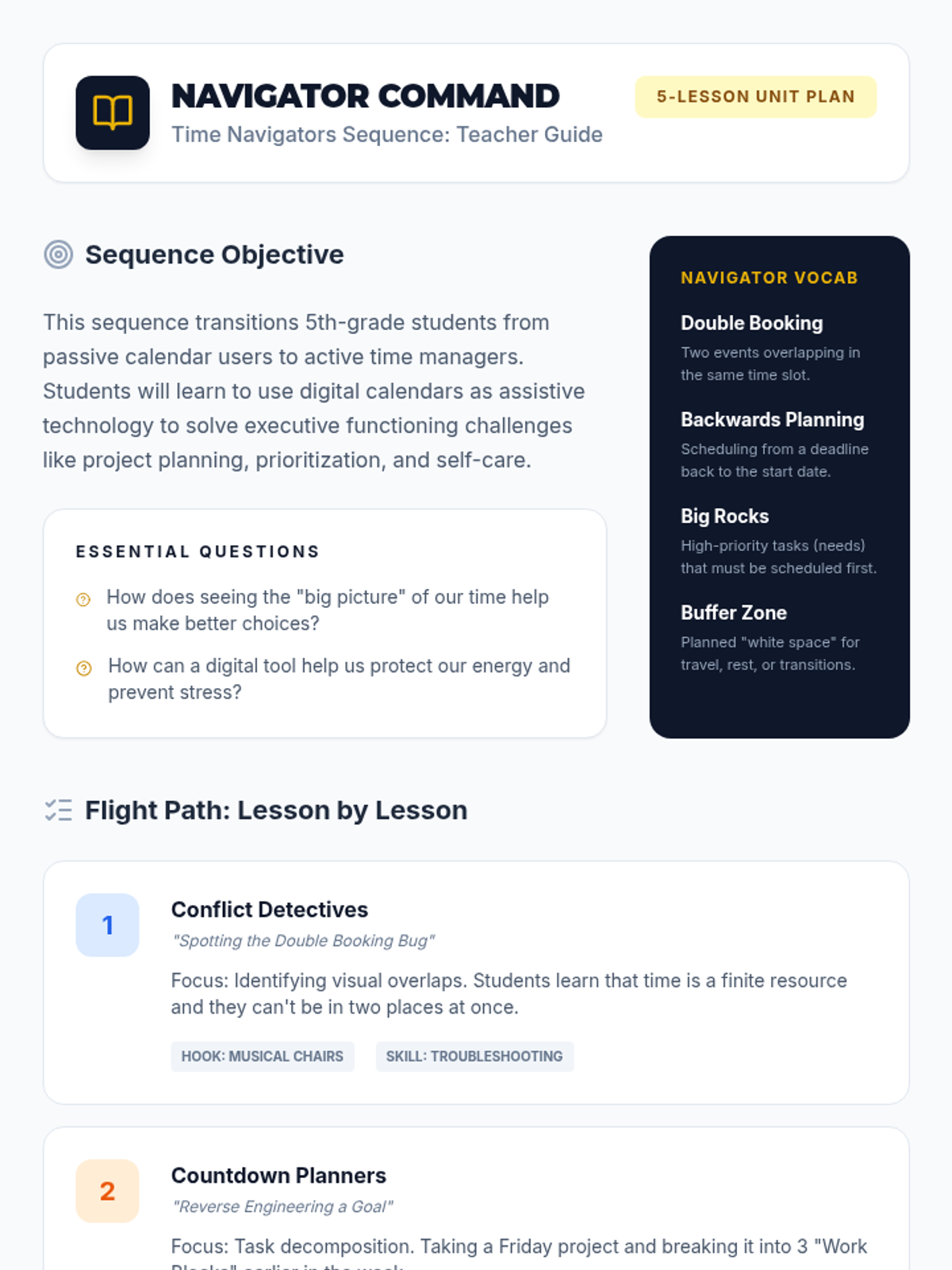 A 5th-grade sequence focusing on using digital calendars for independent planning, conflict resolution, and task prioritization. Students transition from passive scheduling to active time management, preparing them for the organizational demands of middle school.