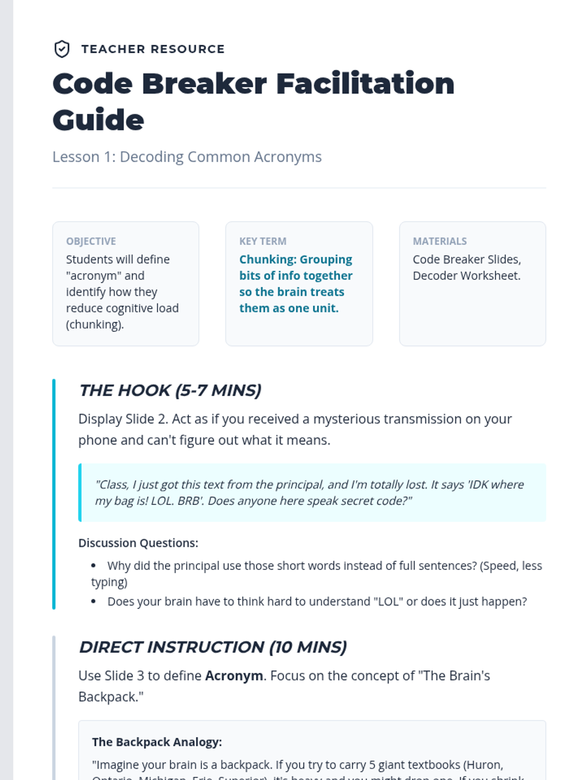 This sequence helps students understand and apply chunking and association strategies to overcome working memory limitations. Through a series of game-based lessons, students will learn to organize data into manageable patterns to increase their cognitive processing capacity.