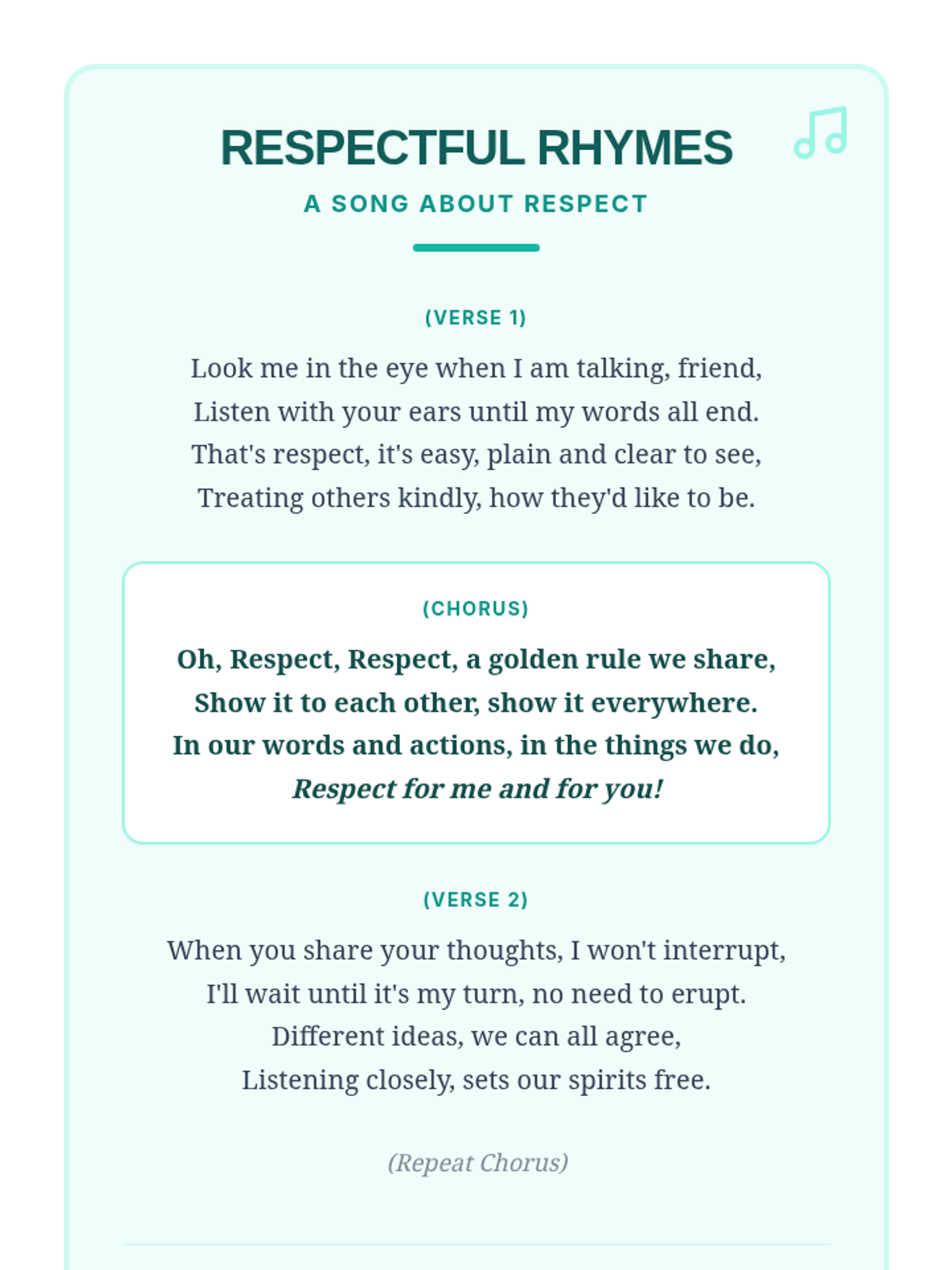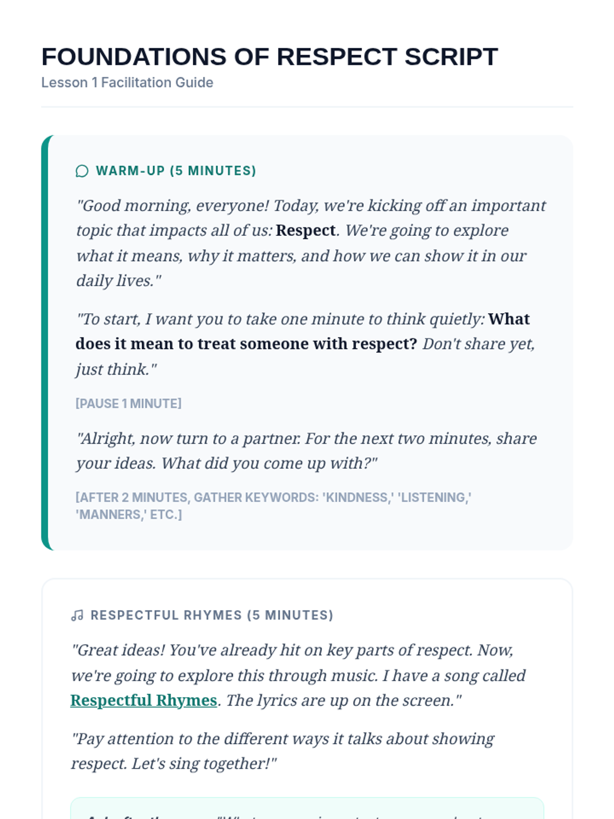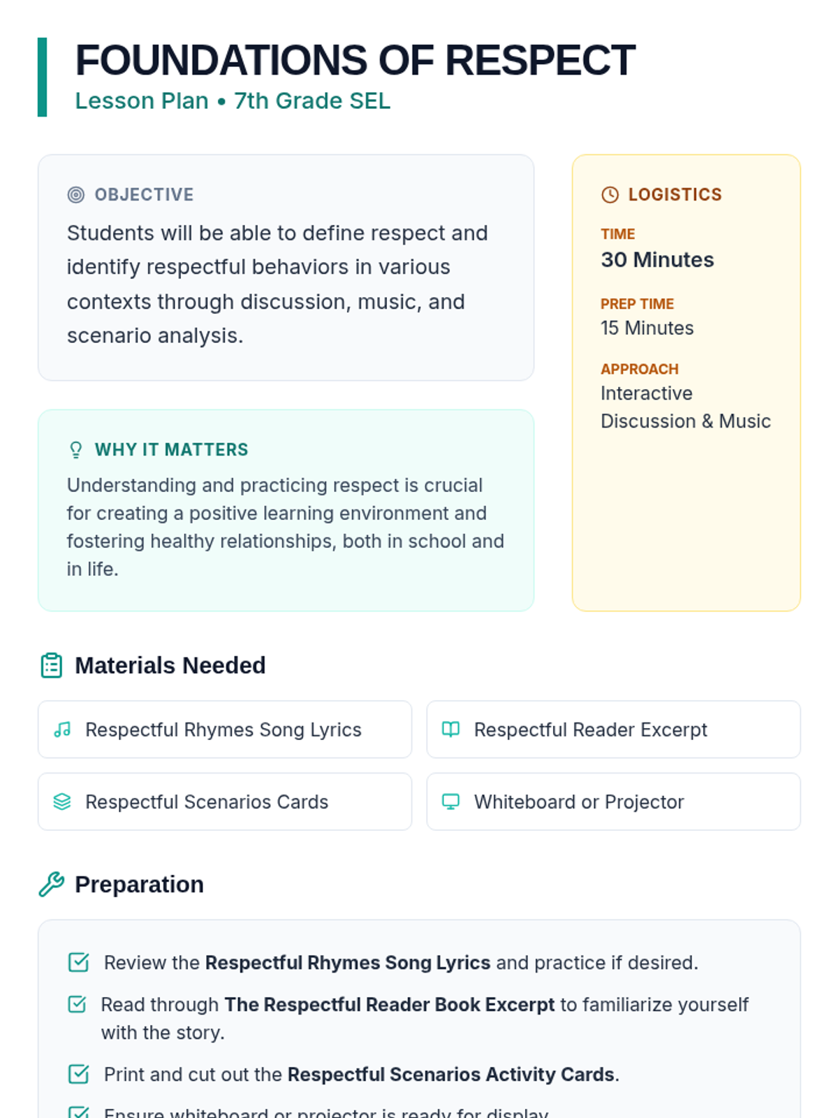 A five-part SEL series for 7th graders focused on defining respect, active listening, positive communication, celebrating diversity, and self-respect/environmental care. Each session integrates music, storytelling, and interactive practice.