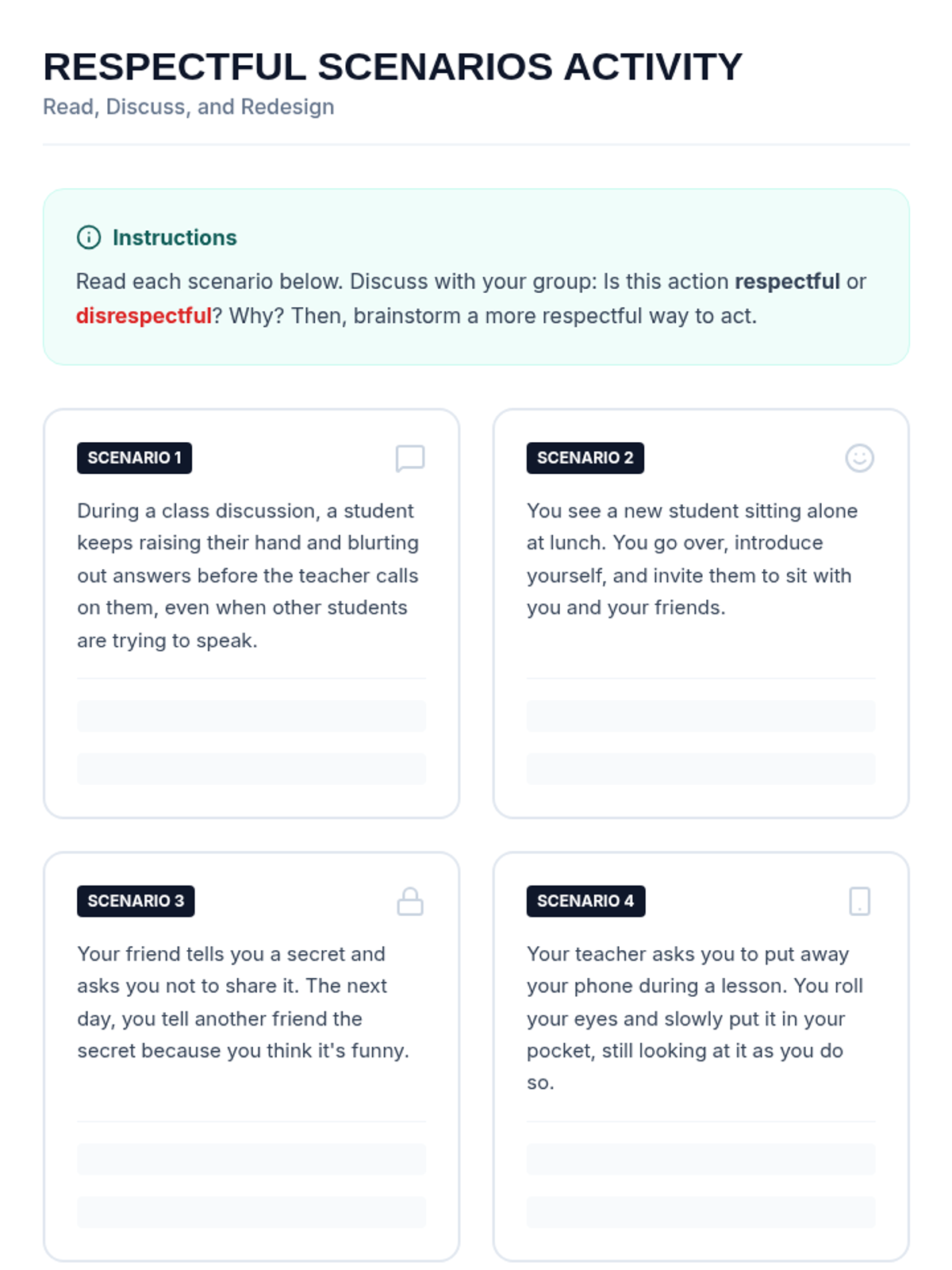 This inquiry-based sequence guides 6th-grade students through decoding the 'hidden curriculum' of middle school social environments. Students observe social cues, identify unwritten rules, explore perspectives, and analyze social narratives to understand the 'why' behind social expectations.