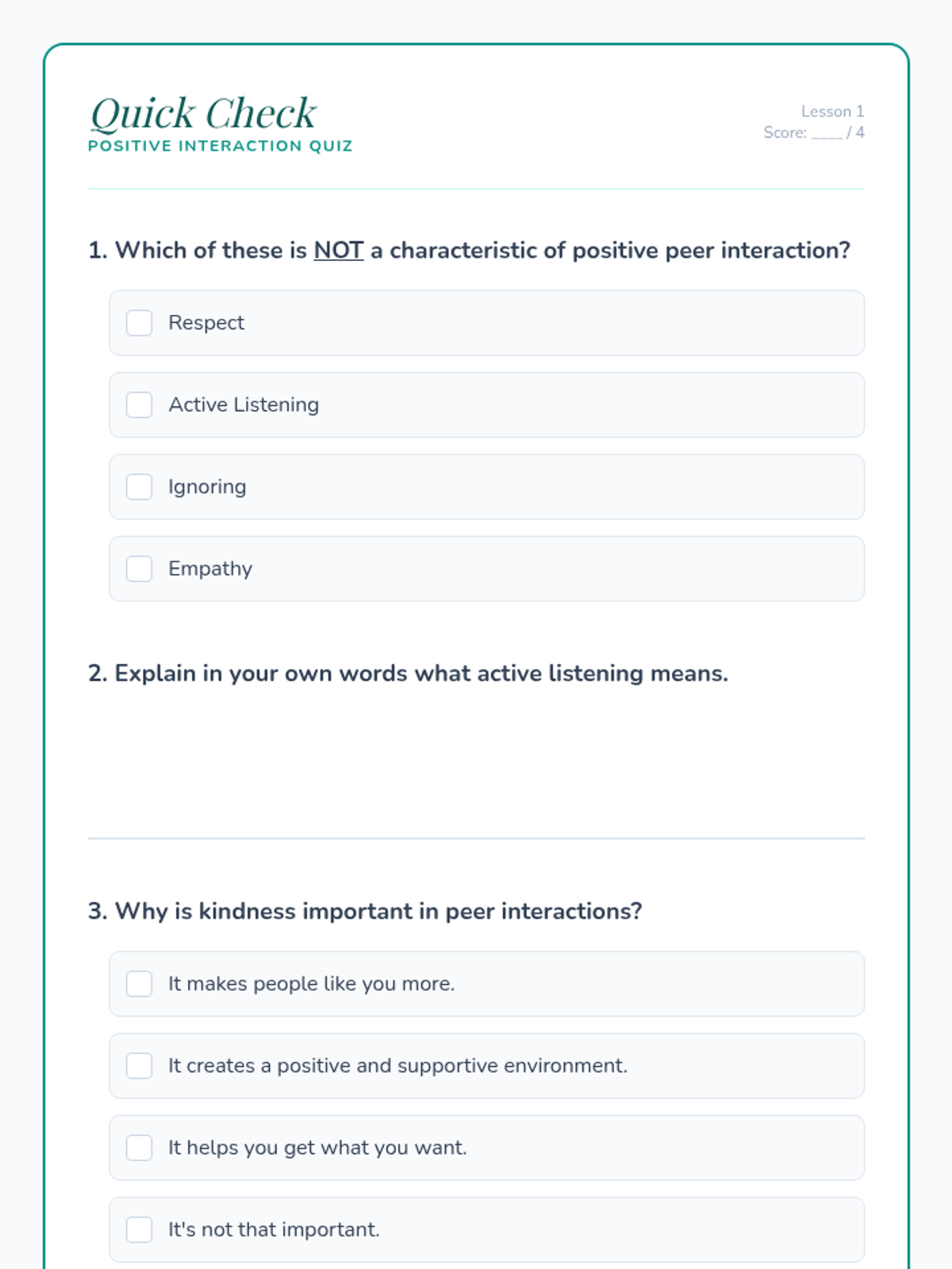 A 5-lesson sequence for 7th graders focusing on GIVE skills (Gentle, Interested, Validate, Easy manner) through the lens of peer mediation and conflict resolution. Students move from identifying judgmental language to applying complex de-escalation techniques in high-stakes simulations.