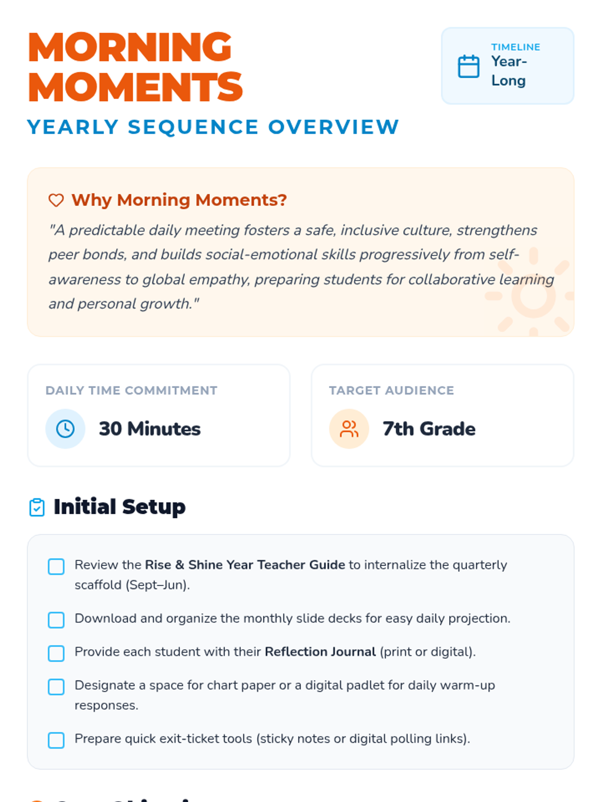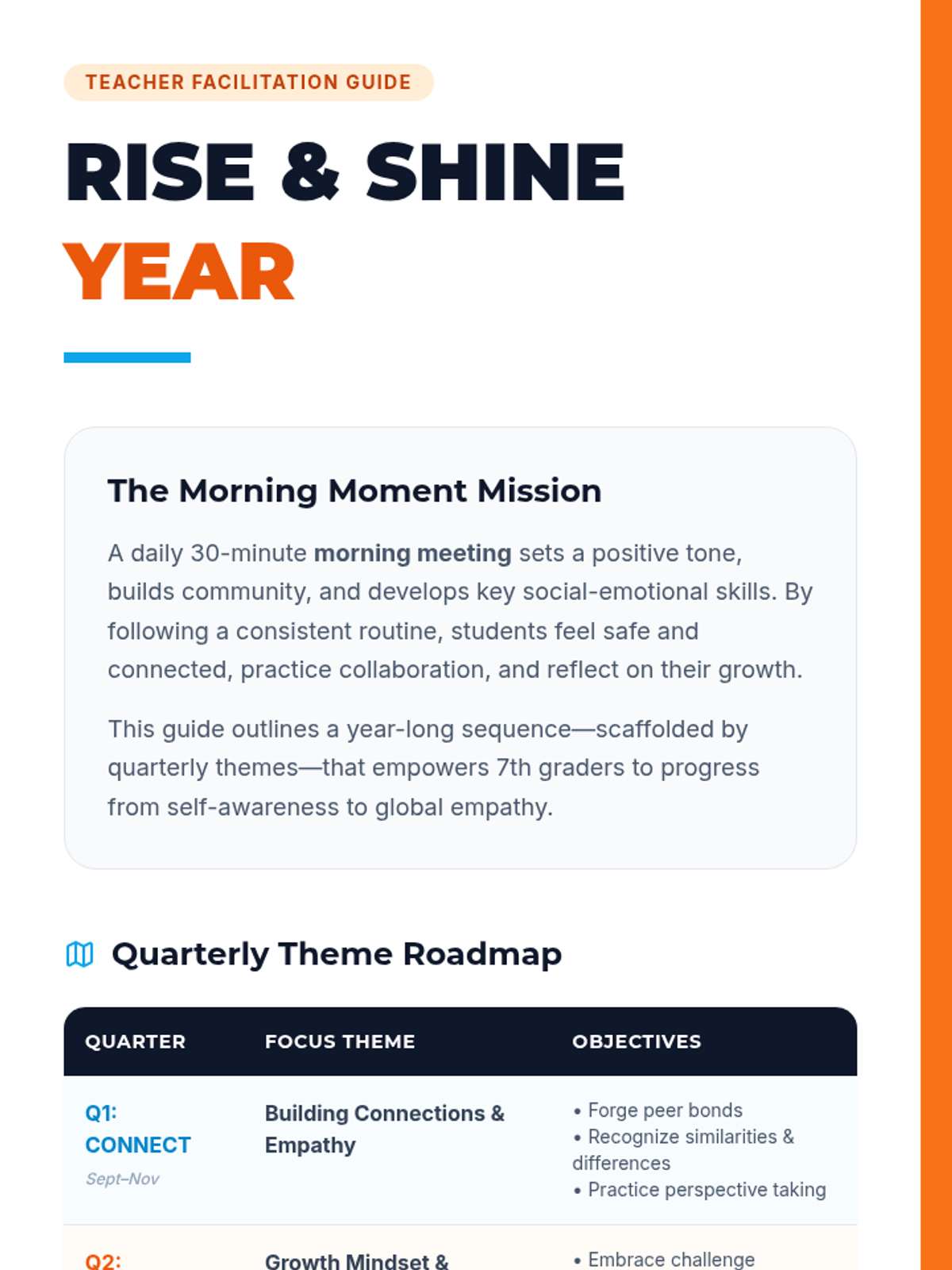 A comprehensive year-long morning meeting sequence for 7th grade, focused on building community, SEL skills, and classroom culture through four quarterly themes.