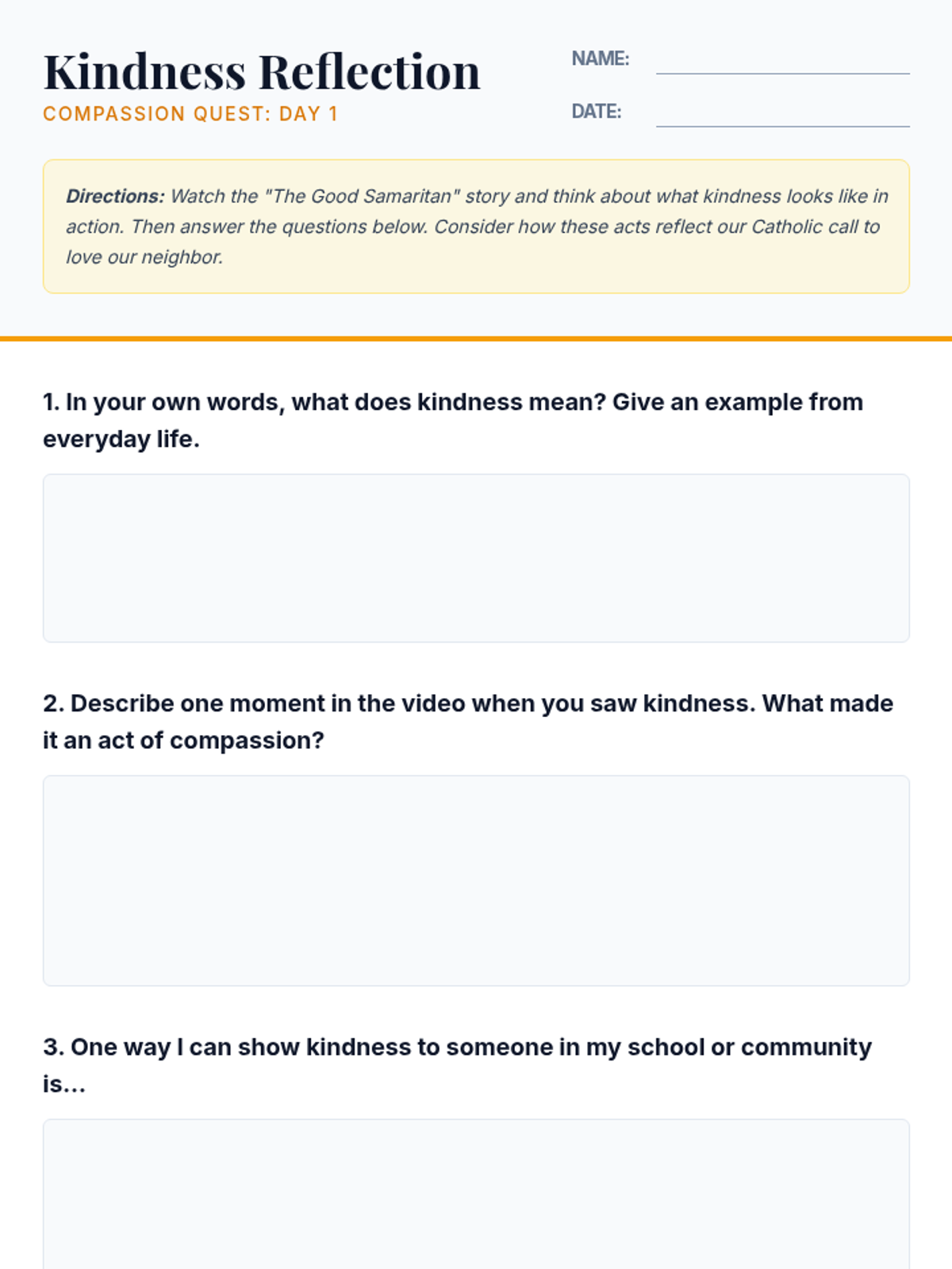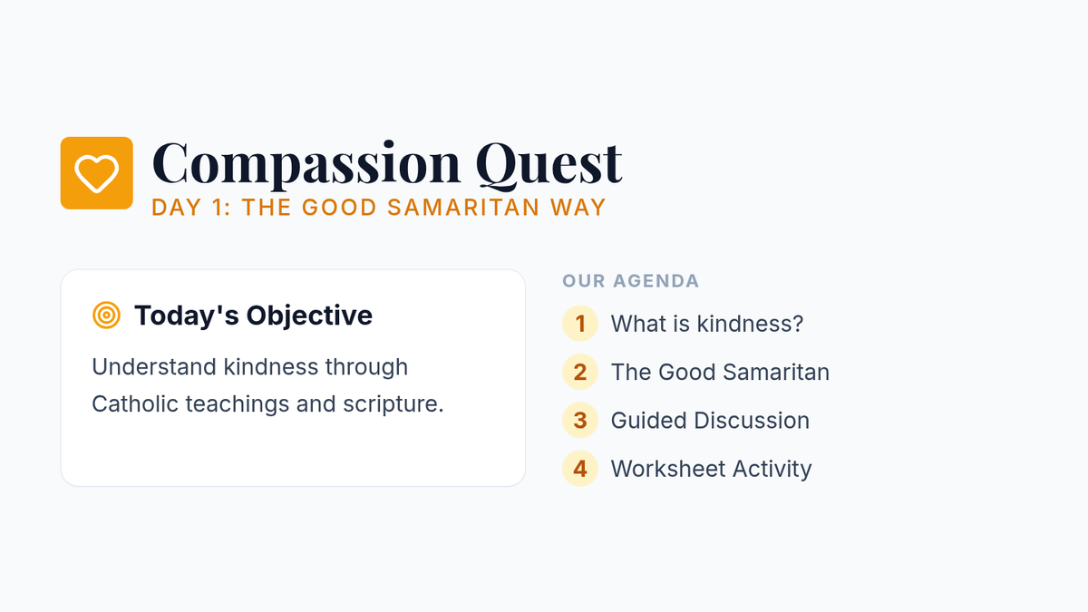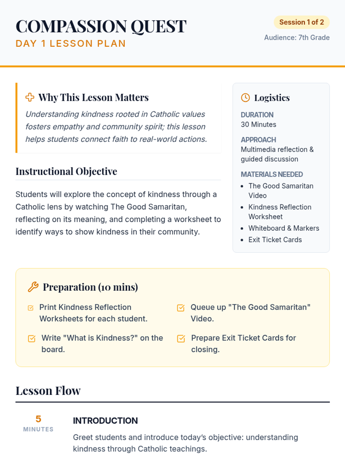 A two-session curriculum for 7th graders at a Catholic school focusing on kindness, mercy, and community service through the lens of the Good Samaritan and Catholic values.
