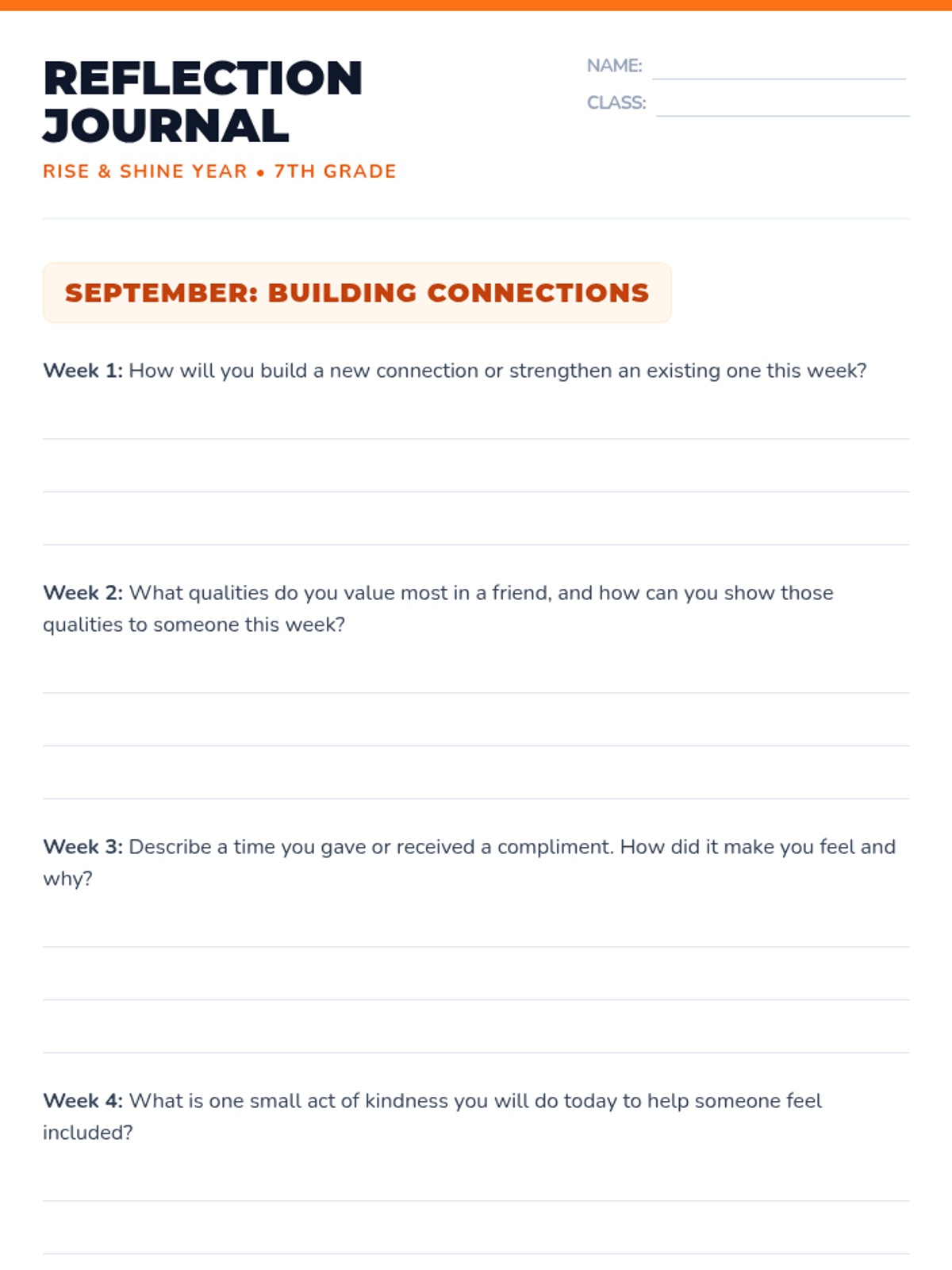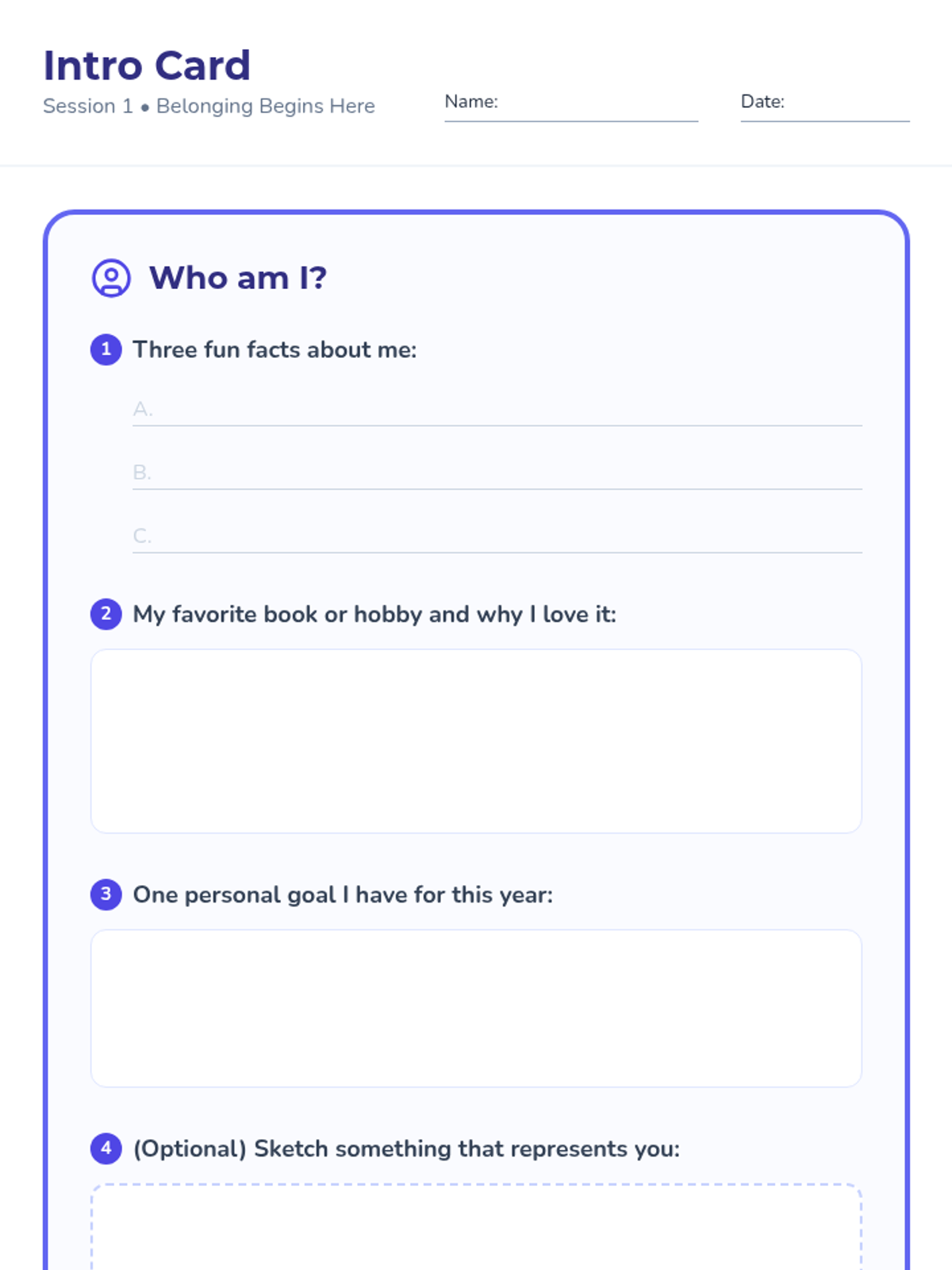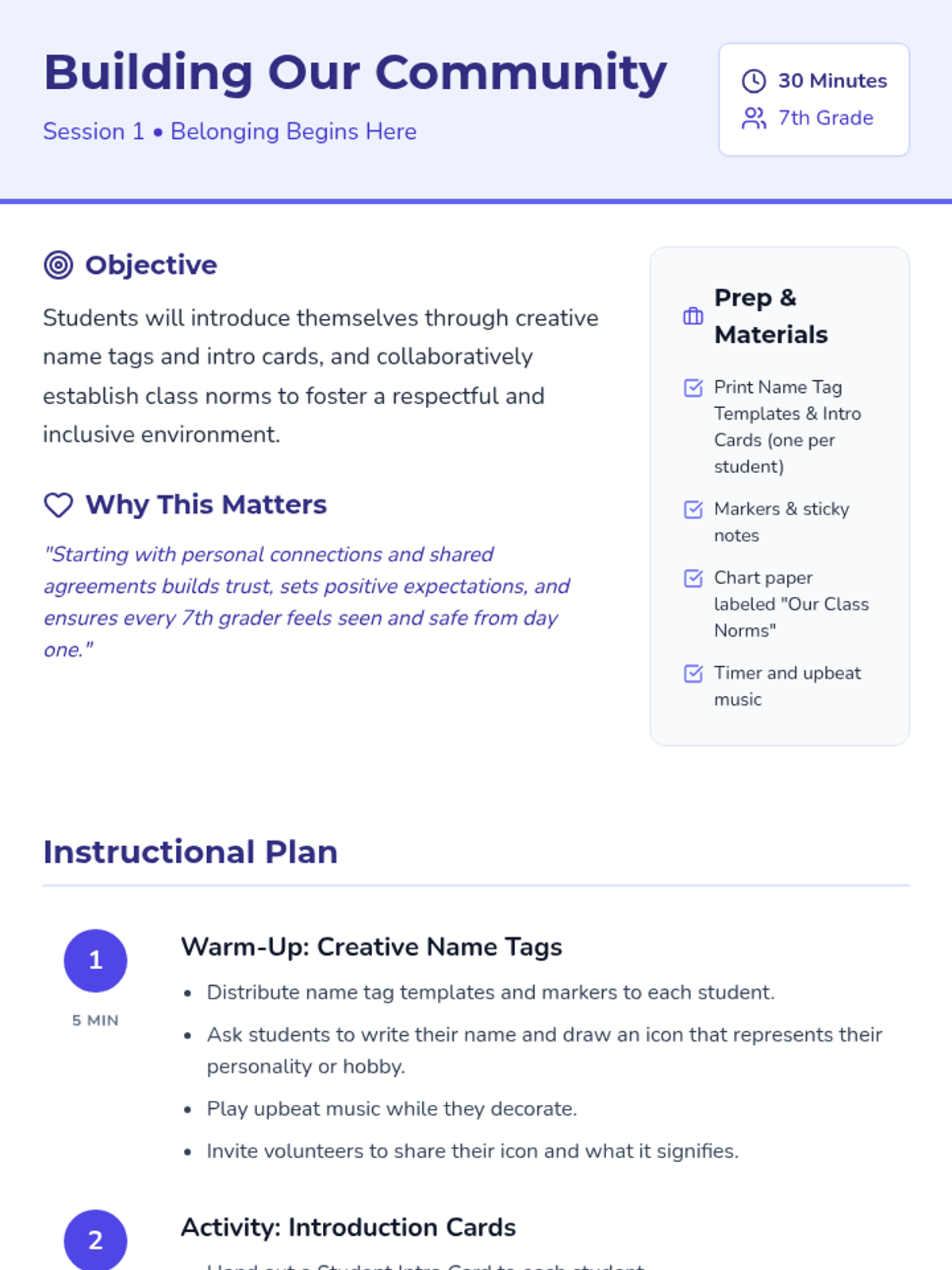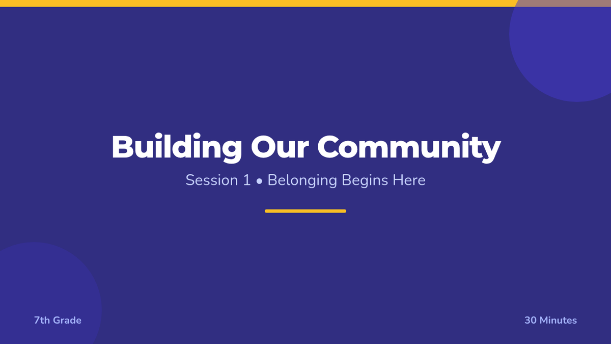 A 5-day series of 30-minute sessions for 7th graders to build classroom belonging, foster connections, and establish a supportive community through interactive activities and reflection.